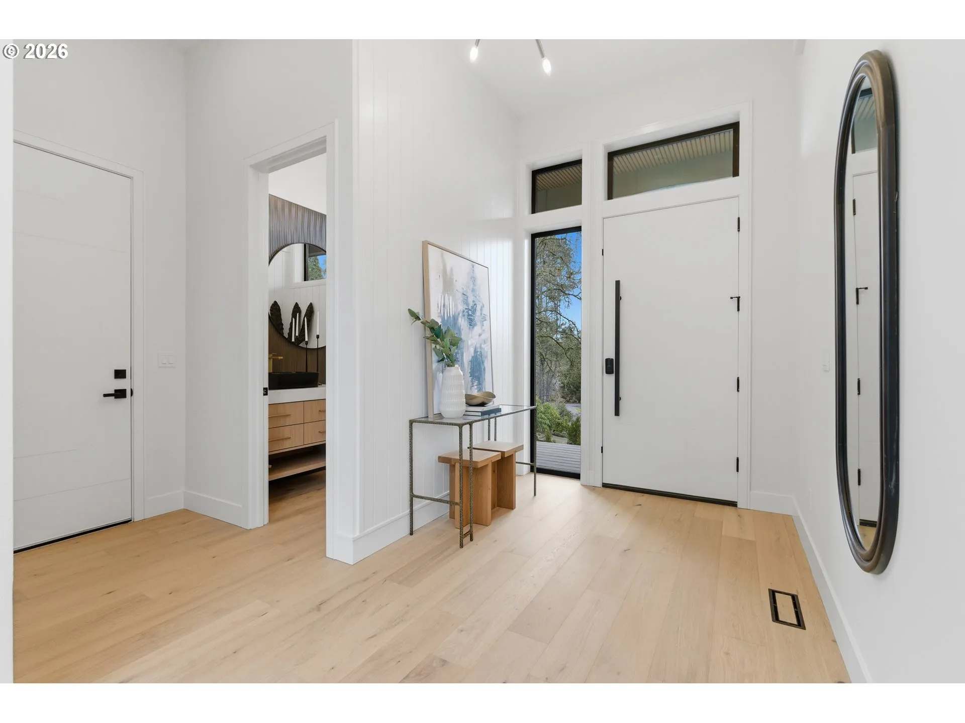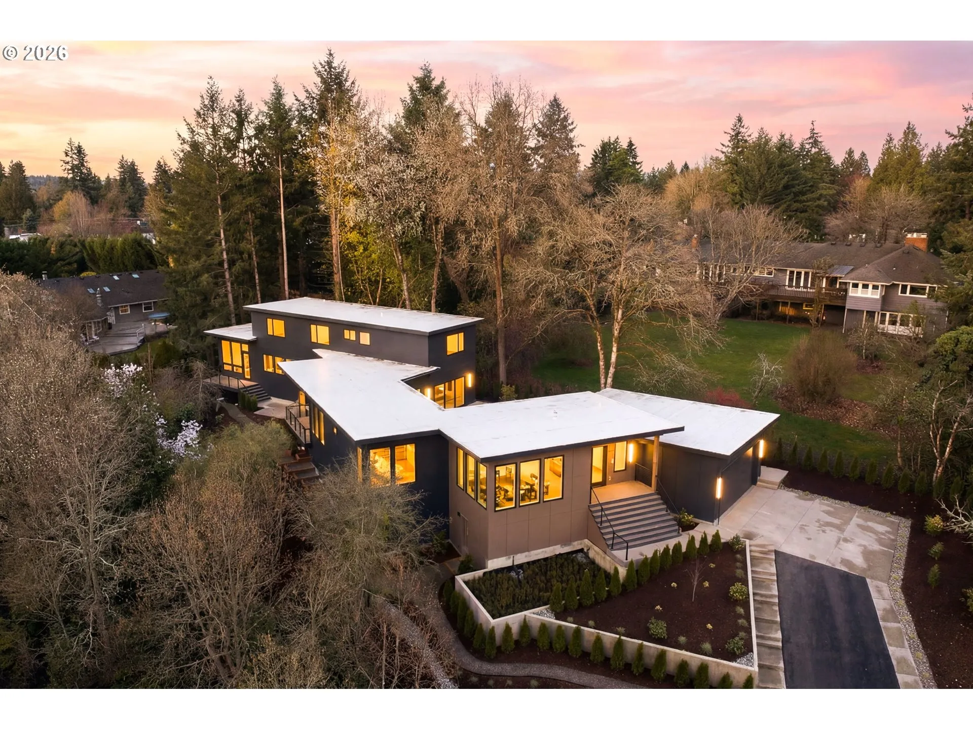 Brand new high quality custom built NW modern estate with meticulous craftsmanship & high-end finishes throughout offering rare main level living on private almost half acre lot. Enjoy the ease of main-level living plus 3 bedrooms & 2 baths are tucked away on the upper level, offering privacy & flexibility. High ceilings, engineered hardwood floors & floor-to-ceiling Milgard windows fill the home with natural light, while sliding doors from the living room, kitchen & family room open to a stunning atrium-style courtyard with professional landscaping in the center of the home. The living room features a quartz fireplace, large picture windows & warm wood paneling accents. A stylish dining room includes a built-in buffet with two Thermador beverage refrigerators, quartz countertop, sink & glass rinser. The chef’s kitchen showcases built-in Thermador appliances with overlay paneling, double ovens, a dramatic quartz waterfall island, instant hot water & access to both decks. Enter the private primary quarters, set at the end of the hall, where the bedroom, spa-inspired bath & walk-in closet are individually positioned for a true retreat-like layout. Primary bath features a soaking tub, oversized tiled walk-in shower with rainfall head, glass toilet closet, dual quartz vanities & heated tile floors. Primary offers private deck access, adjustable recessed lighting & ceiling fan. Additional living areas include a generous family room, office with storage/utilities closet, mudroom complete with large sauna & built-in storage, & well-equipped laundry room. No detail was overlooked, from solid wood doors, under cabinet lighting & illuminated shower niches, pre-wired for electric shades, plumbed for a central vacuum & backup generator. 2 car oversized garage and large crawlspace offers additional storage & flex spaces. Situated on a nearly ½-acre lot near Portland Golf Club, private schools, Portland and tech corridor, St. Vincent’s Medical Center. It’s the complete package! [Home Energy Score = 4. HES Report at https://rpt.greenbuildingregistry.com/hes/OR10244691]
