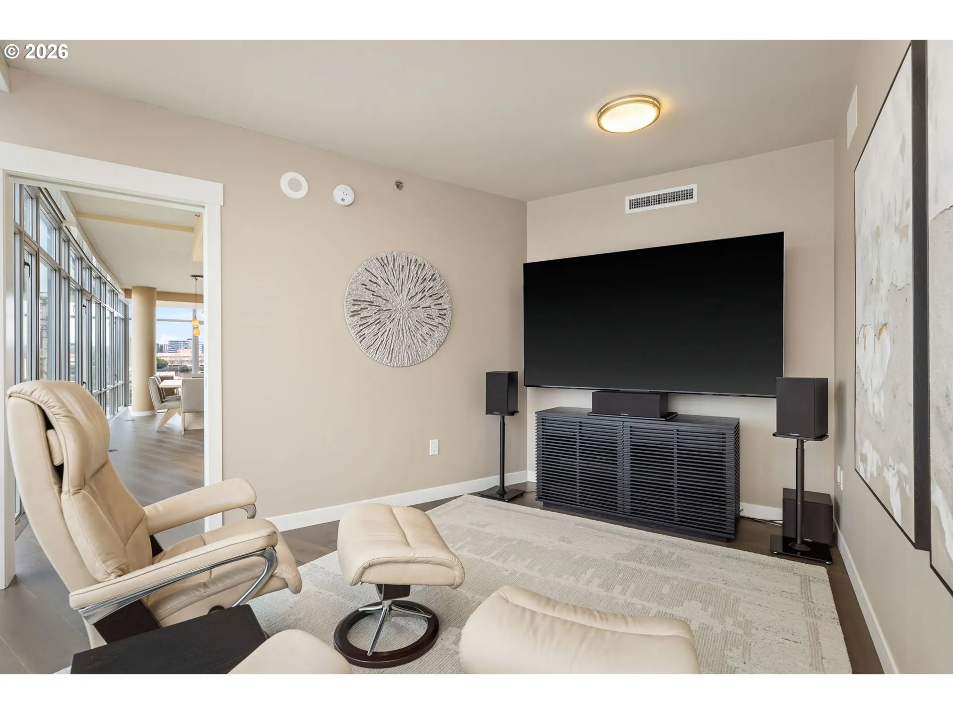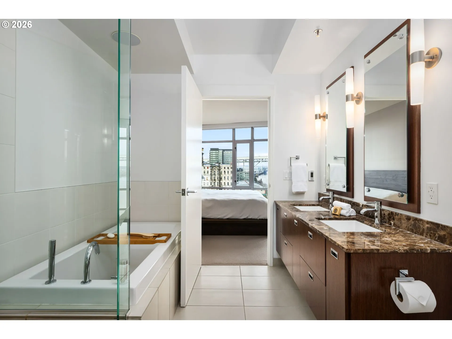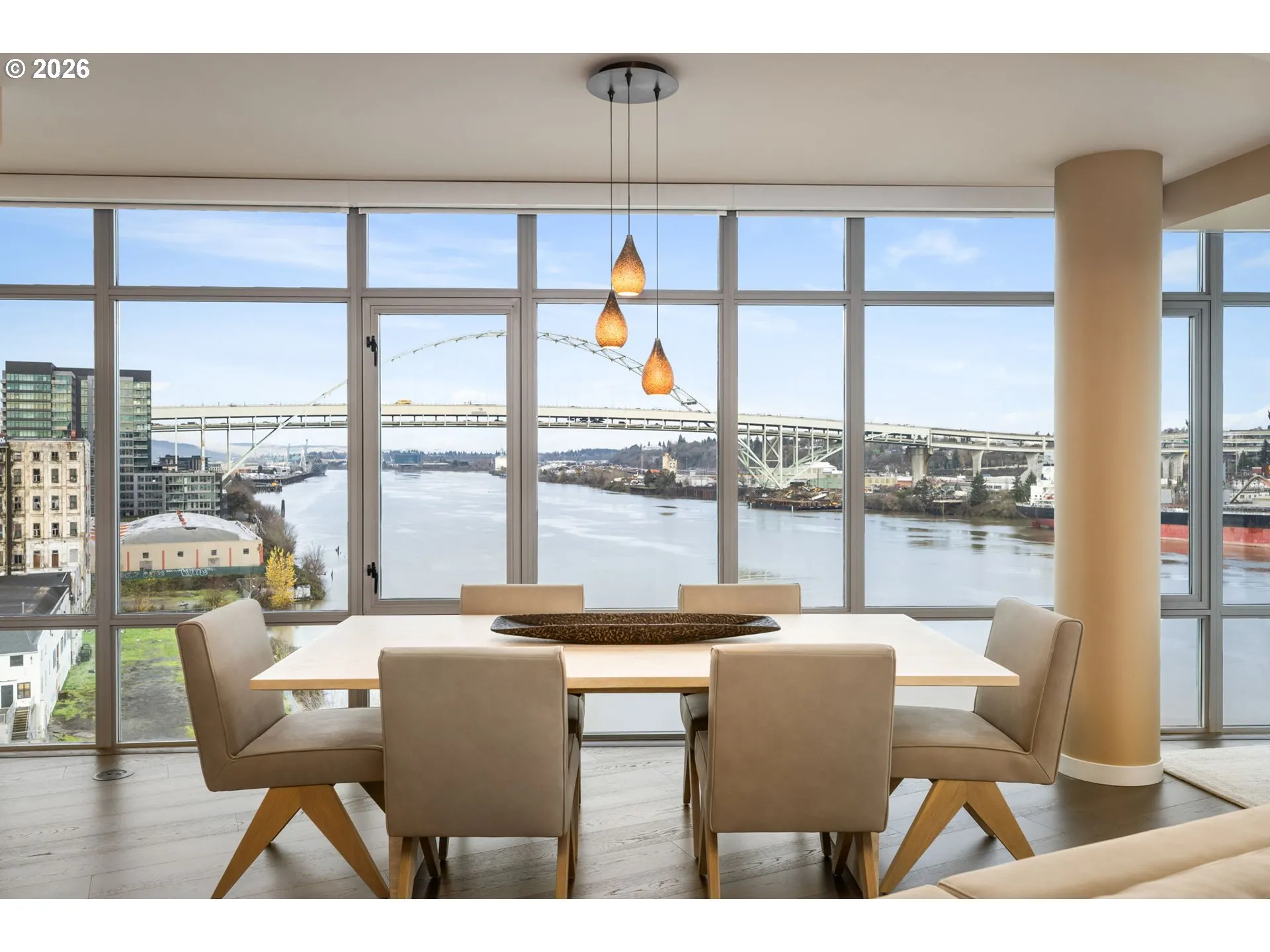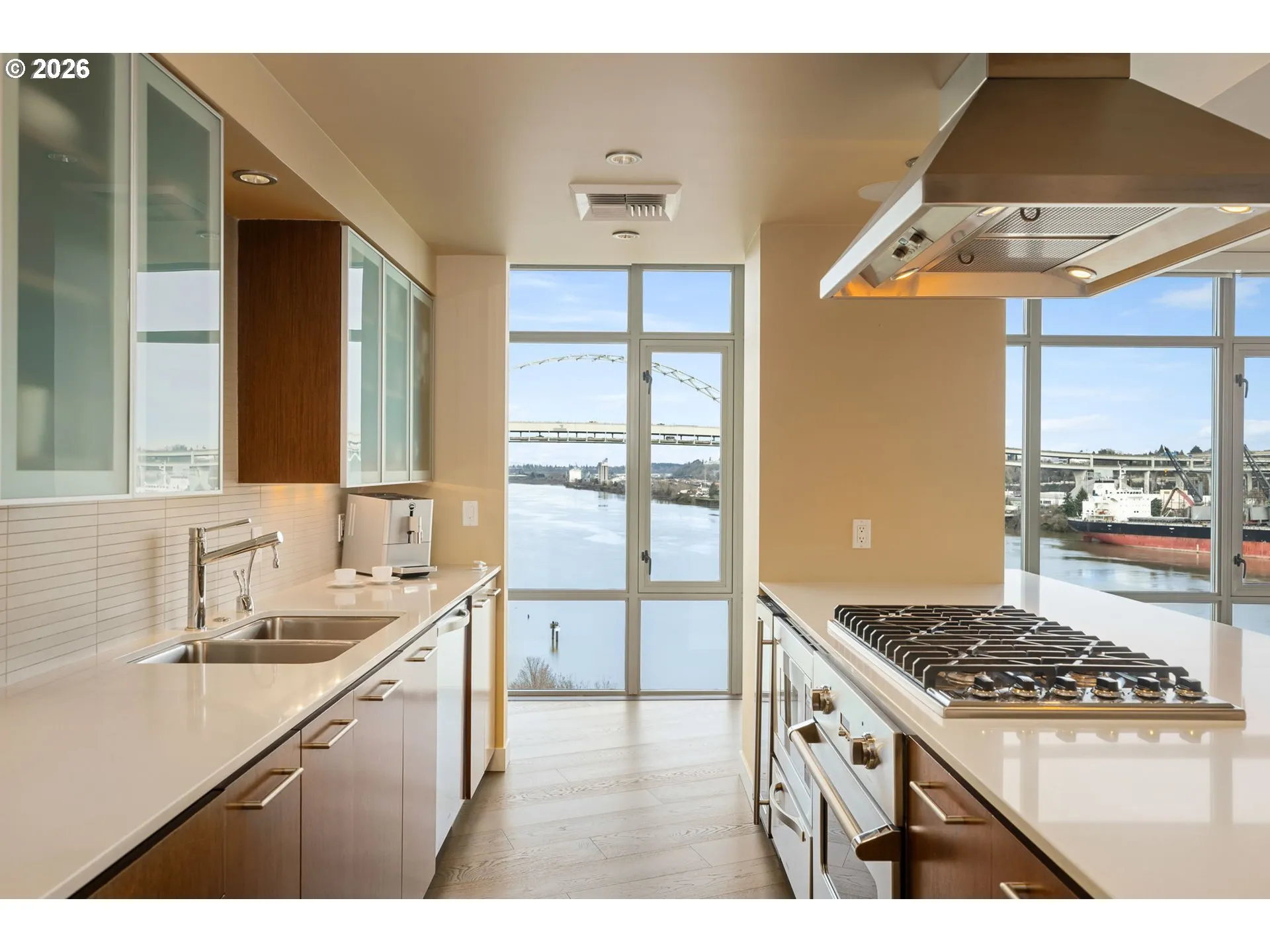 Effortless Luxury Meets Willamette River Views. Experience the pinnacle of one-level waterfront living in this completely reimagined Waterfront Pearl Penthouse. Recently transformed with meticulous attention to detail, this residence features state-of-the-art electronic solar shades, premium pre-engineered hardwood flooring, and designer finishes throughout—creating a sophisticated sanctuary designed for the modern lock-and-leave lifestyle. Floor-to-ceiling windows frame panoramic views of the Portland Skyline and Willamette River, while the open-concept living space flows seamlessly to two private terraces facing northwest and east. The chef’s kitchen showcases Viking stainless steel appliances and an integrated wine cooler, perfect for entertaining or quiet evenings at home. Retreat to dual ensuite bedrooms, each appointed with custom closets and spa-inspired baths. The versatile media room offers flexibility as a home office, guest space, or private lounge—all with captivating river views. Worry-free living features 24/7 concierge service, a private fitness center with a sauna, secure side-by-side parking with EV charging, and climate-controlled storage. Steps from Pearl District galleries, acclaimed restaurants, and riverside trails, you are positioned at the heart of Portland’s most coveted neighborhood. The Waterfront Pearl is more than a home, it is a “Lifestyle Refined”.
