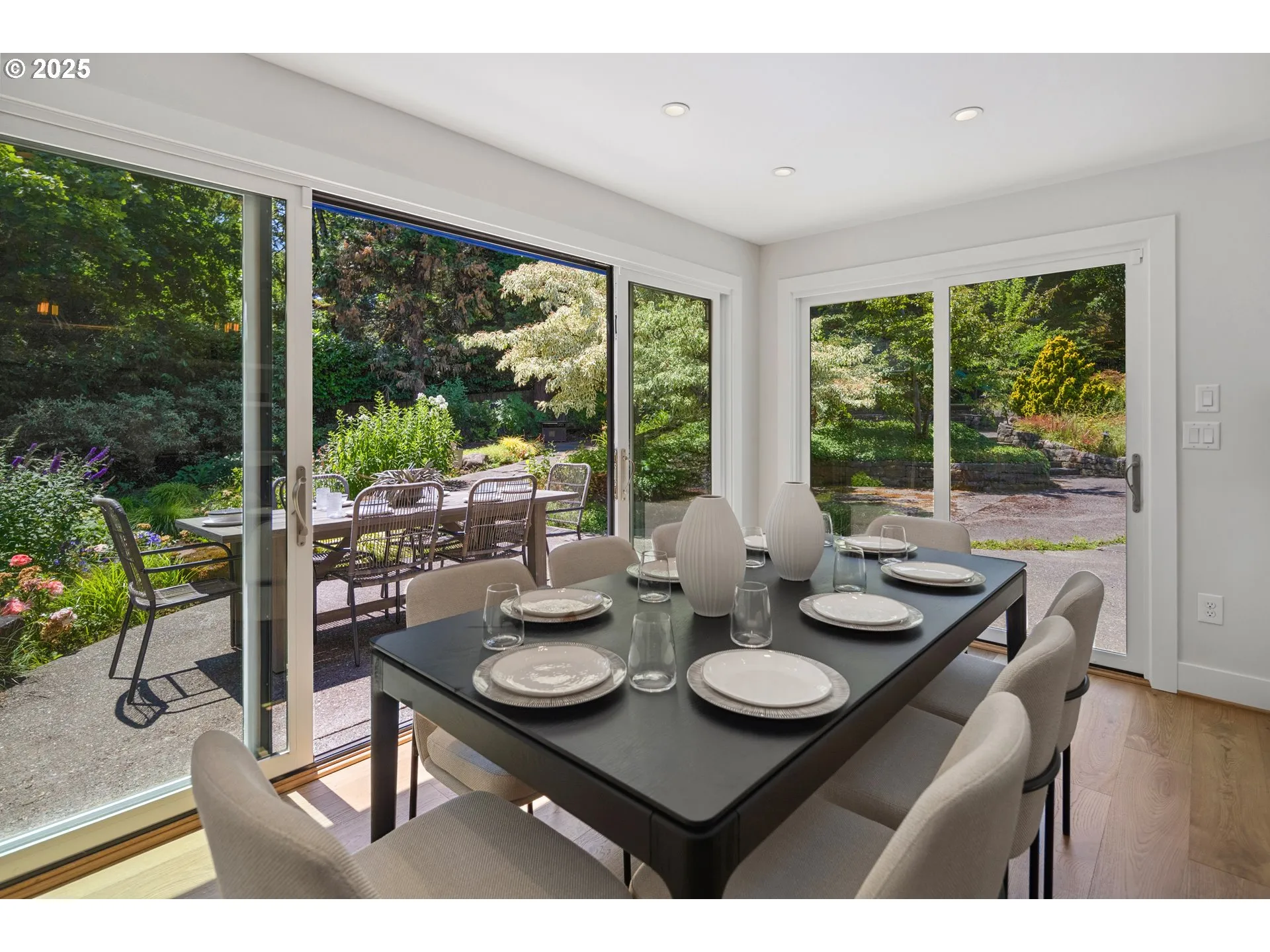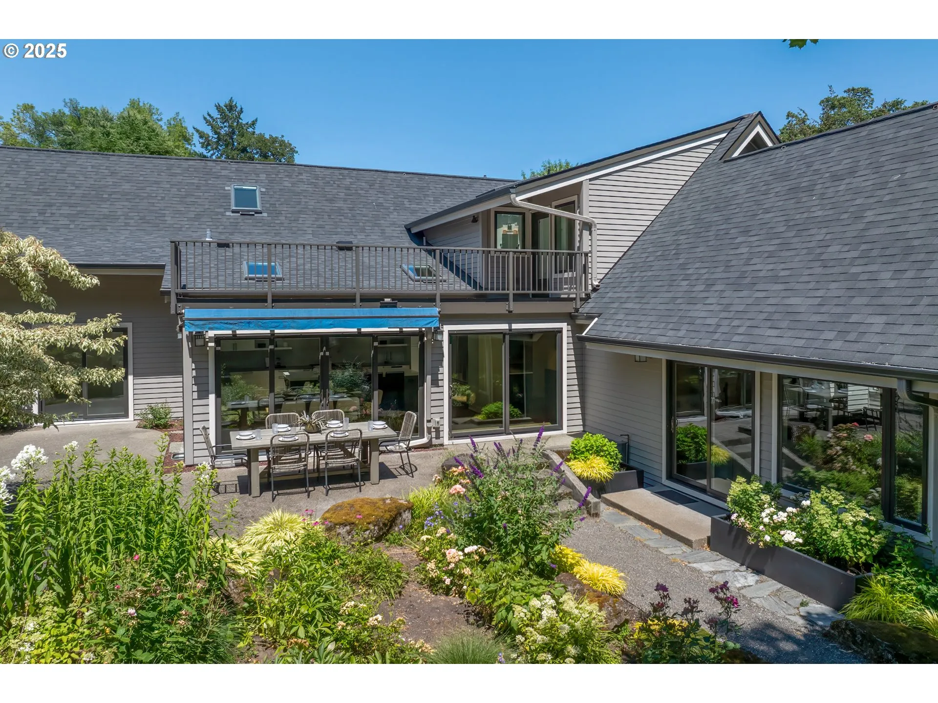 Nestled on nearly an acre on one of the most sought-after streets in Dunthorpe, this stunning contemporary residence has undergone a comprehensive renovation with meticulous attention to detail. The result is a bright and refined interior where clean modern lines are beautifully balanced by new white oak flooring and elegant shiplap accents. Throughout the home, expansive picture windows, sliding glass doors, and skylights dissolve the boundary between indoors and out, framing the stunning natural beauty of the grounds and flooding nearly every room with natural light. In the living room, a dramatic recessed tray ceiling complements a fireplace framed by artful stonework and flanked by custom built-ins. The gourmet kitchen showcases brand-new Sub-Zero, Wolf, and Bosch appliances, quartz countertops, a farmhouse sink, and a vaulted tongue-and-groove ceiling with a skylight. A spacious center island faces a wall of glass that opens to an outdoor dining area and serene garden sanctuary with vibrant perennials and ornamental trees, interwoven with stone pathways that invite quiet exploration. A separate butler’s pantry with dual Sub-Zero beverage centers provides additional prep space. The home offers five bedroom suites – three on the main level and two upstairs – including dual primary suites, one on each floor, for exceptional flexibility. A spacious bonus area with enclosed office space is ideal for a family or media room, while a separate guest house with kitchenette provides additional guest accommodations. The impeccably landscaped park-like grounds are surrounded by towering trees, offering maximum privacy in addition to manicured gardens, lush rolling lawns, and a sport court. The home is located in the esteemed Riverdale School District – consistently ranked one of the best in the state – minutes from downtown Portland and Lake Oswego.