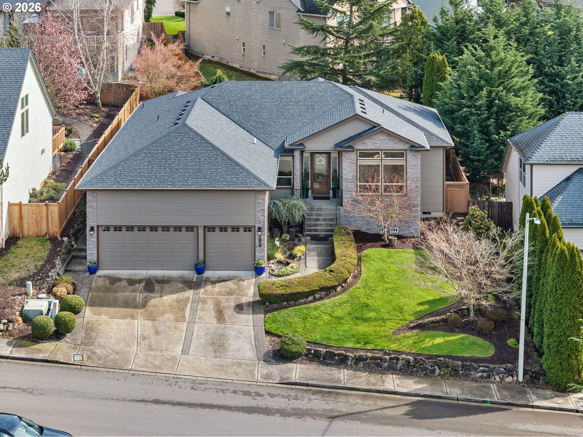 Open and inviting single level custom home. Gorgeous warm Brazilian cherry hardwoods with walnut accents throughout. Soaring 10ft ceilings open to a sunken living room filled with natural light and custom cabinetry with central vacuum. Gourmet chef kitchen newly updated with high end finishes including: quartz, tile backsplash, and large island with prep sink. Cafe ss cooktop and newer dishwasher. Beautiful cabinetry with abundant storage. Primary suite with deck access and spa like ensuite with tile shower, jetted tub, dual sinks. crown molding, and WIC with custom shelving. Two additional bedrooms/ or office with built in shelves with ample storage. Backyard retreat with calming water feature, low maintenance artificial turf, oversized Trex deck and mature landscaping with sprinklers and dripless water system. New roof/New exterior paint 11/25. Rannai tankless water heater newly installed. Oversized 3 car garage with high ceilings and EV-ready with 240V outlet. Peek-a-boo city and river views and easily accessible to all major retail, dining, and SR-14. So much to offer and No HOA.