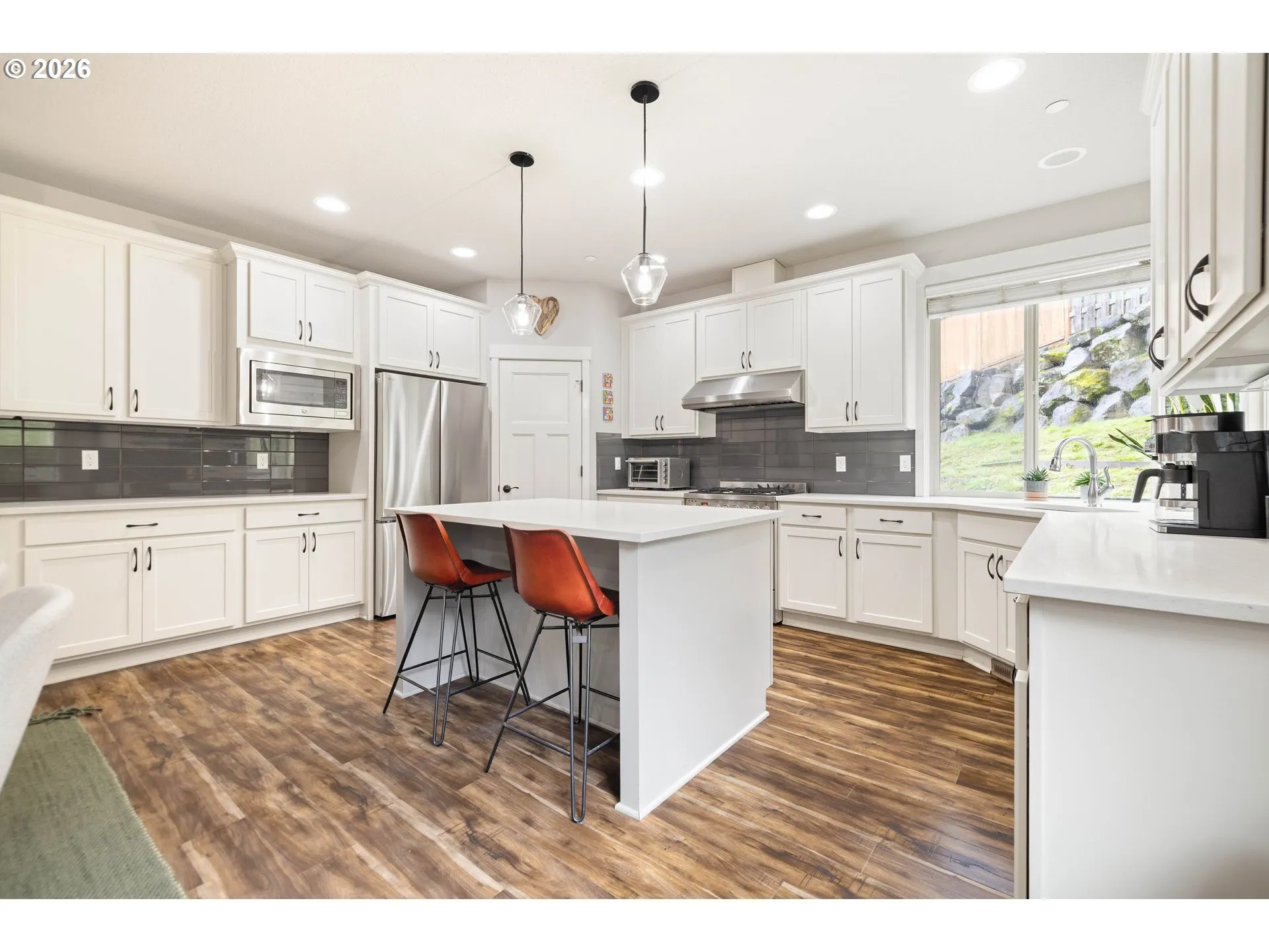 Rare private retreat in the heart of Bull Mountain. Set high on a generous 0.18-acre lot, this move-in-ready 4-bedroom + den Craftsman offers peaceful green views from nearly every room. The light-filled main level features engineered hardwood floors, tall ceilings, and a bright southwest-facing office. The designer kitchen anchors the home with quartz countertops, custom cabinetry, a walk-in pantry, stainless steel appliances, an Italian Verona range, a new refrigerator and dishwasher, and elevated West Elm lighting. Upstairs, the spacious primary suite feels like a spa getaway with a freestanding soaking tub, dual-head walk-in shower, and oversized walk-in closet. Three additional bedrooms and a dedicated laundry room complete the upper level. Terraced gardens and a private backyard create a serene outdoor escape. New carpet (2025). Two-car garage. Close to top-rated schools, parks, trails, shopping, and Hwy 99. Privacy, style, and functionality — all in one.