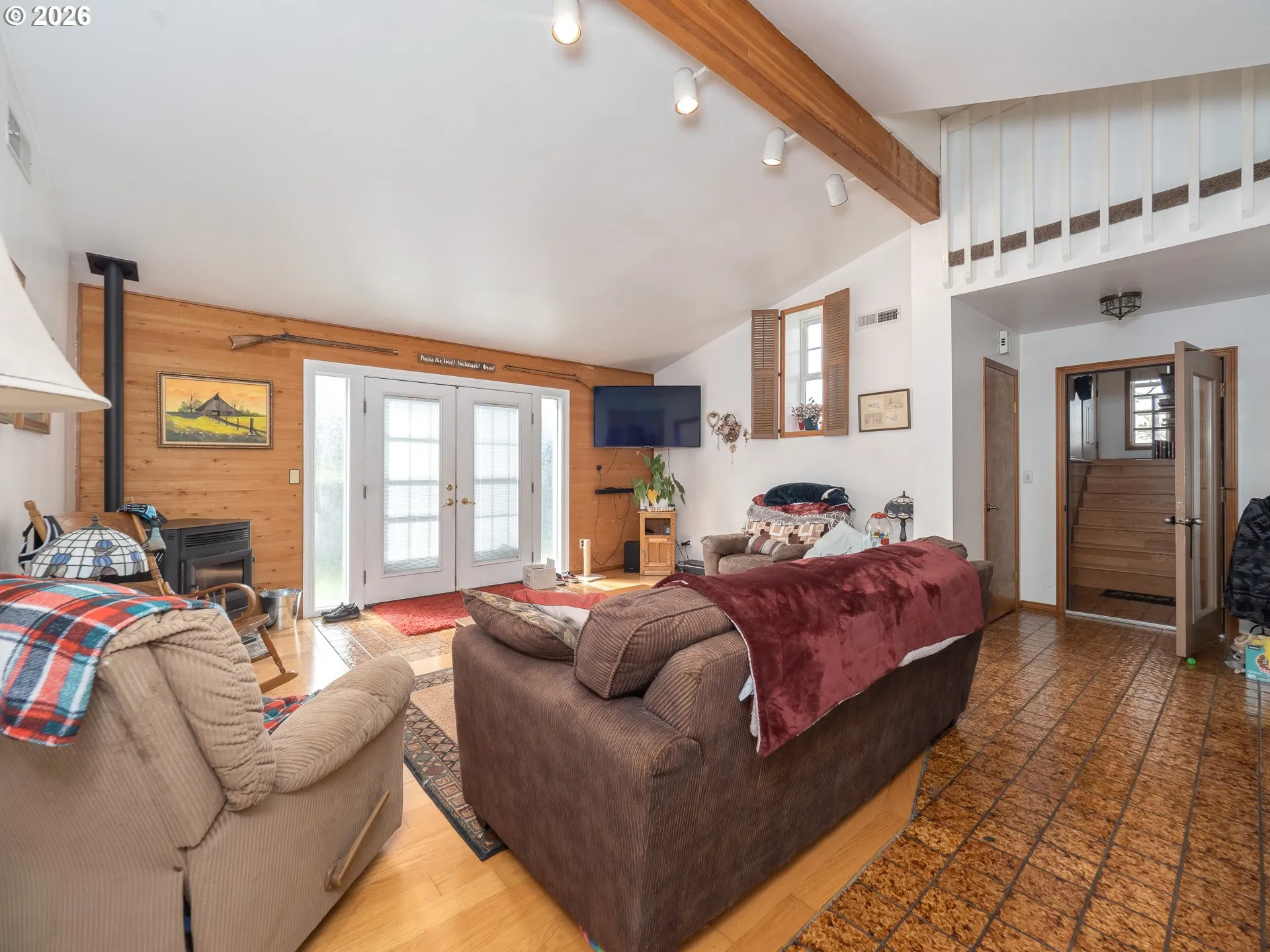 Tucked onto a private half acre surrounded by beautiful mature trees, this property offers a rare combination of seclusion and convenience just minutes from town, all overlooking peaceful Hess Creek. The contemporary home features vaulted ceilings and distinctive architectural touches that create interesting, light filled spaces throughout. Recent improvements in the last two years include a new roof, a new fence, a cozy pellet stove added to the living room, and an updated dining room light fixture. Outside is where the possibilities really open up. The impressive 996 square foot shop includes a mezzanine for additional storage or workspace, soaring ceilings, a large garage door, and 220 power, ideal for hobbies, projects, vehicles, or a home based business. A separate soundproof storage building with electricity and insulation adds even more flexibility for equipment, studio use, or secure storage. Private, versatile, and full of potential, this is a unique opportunity to create your own retreat while staying close to everything you need.