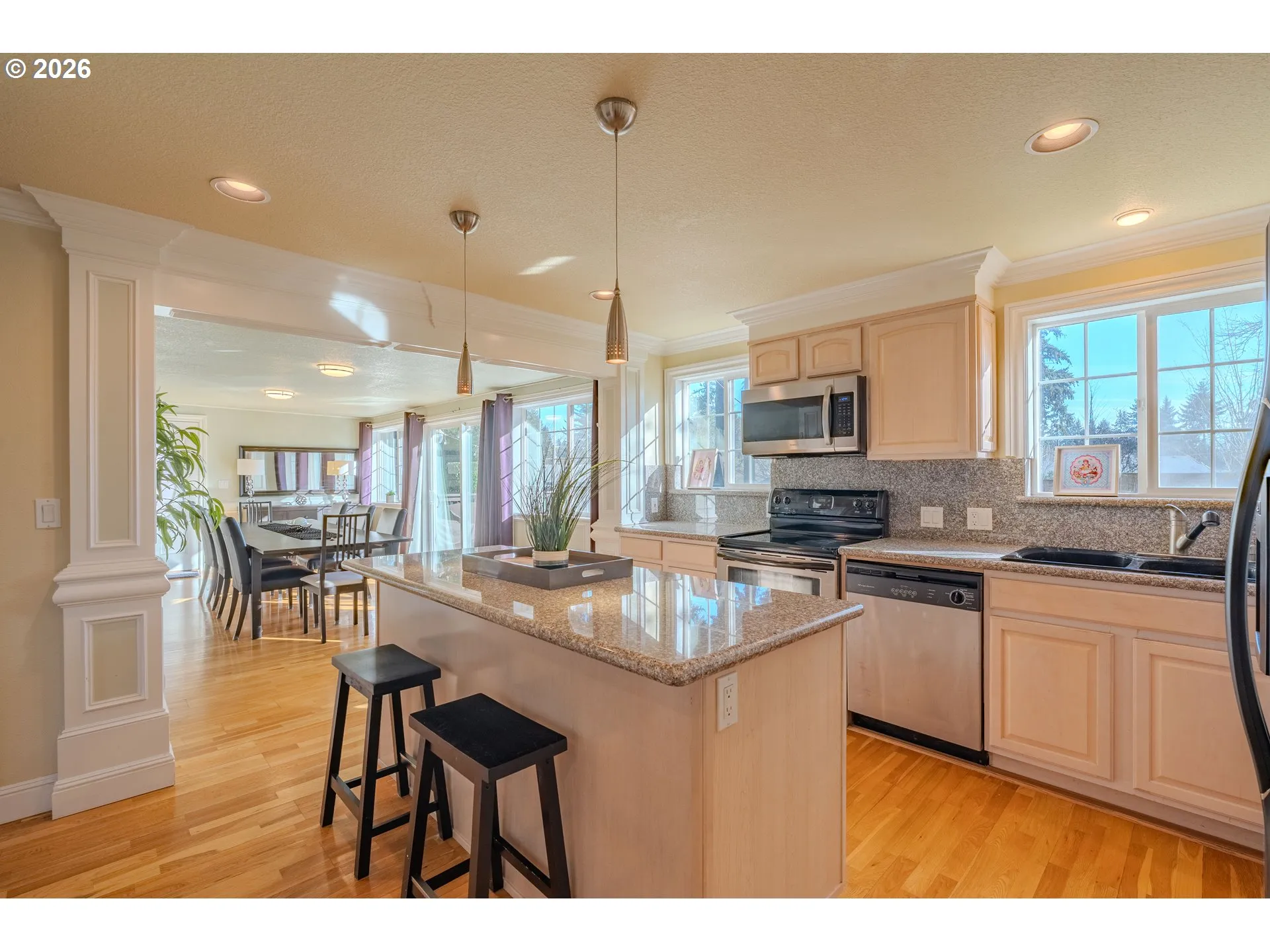 Set on a huge lot at the end of a quiet cul-de-sac, this beautifully remodeled and thoughtfully updated 4-bedroom, 2.5-bath elegant home offers a refined yet comfortable feel throughout. Rich hardwood flooring, crown molding, recessed lighting, and quality finishes set a warm, elevated tone. The kitchen is both stylish and functional, featuring gorgeous granite countertops with a full-height granite backsplash, stainless appliances, pendant lighting, and a breakfast bar. Dining options are plentiful, with the breakfast bar, formal dining area, or the bonus room that opens to the backyard, creating effortless indoor-outdoor access and an ideal setting for entertaining. Upstairs, plush upgraded carpet continues through the living spaces, including three bedrooms in addition to the primary suite. The primary includes recessed lighting and a beautifully finished, spacious ensuite showcasing marble tile and a soaking tub. The huge, fully fenced backyard offers abundant space for outdoor enjoyment, complete with a large deck, storage shed, and plenty of room to run and play. Convenient to shopping, dining, PeaceHealth, and numerous parks, with easy access to I-205 for commuting to Portland, this home blends timeless style, comfort, and everyday convenience.