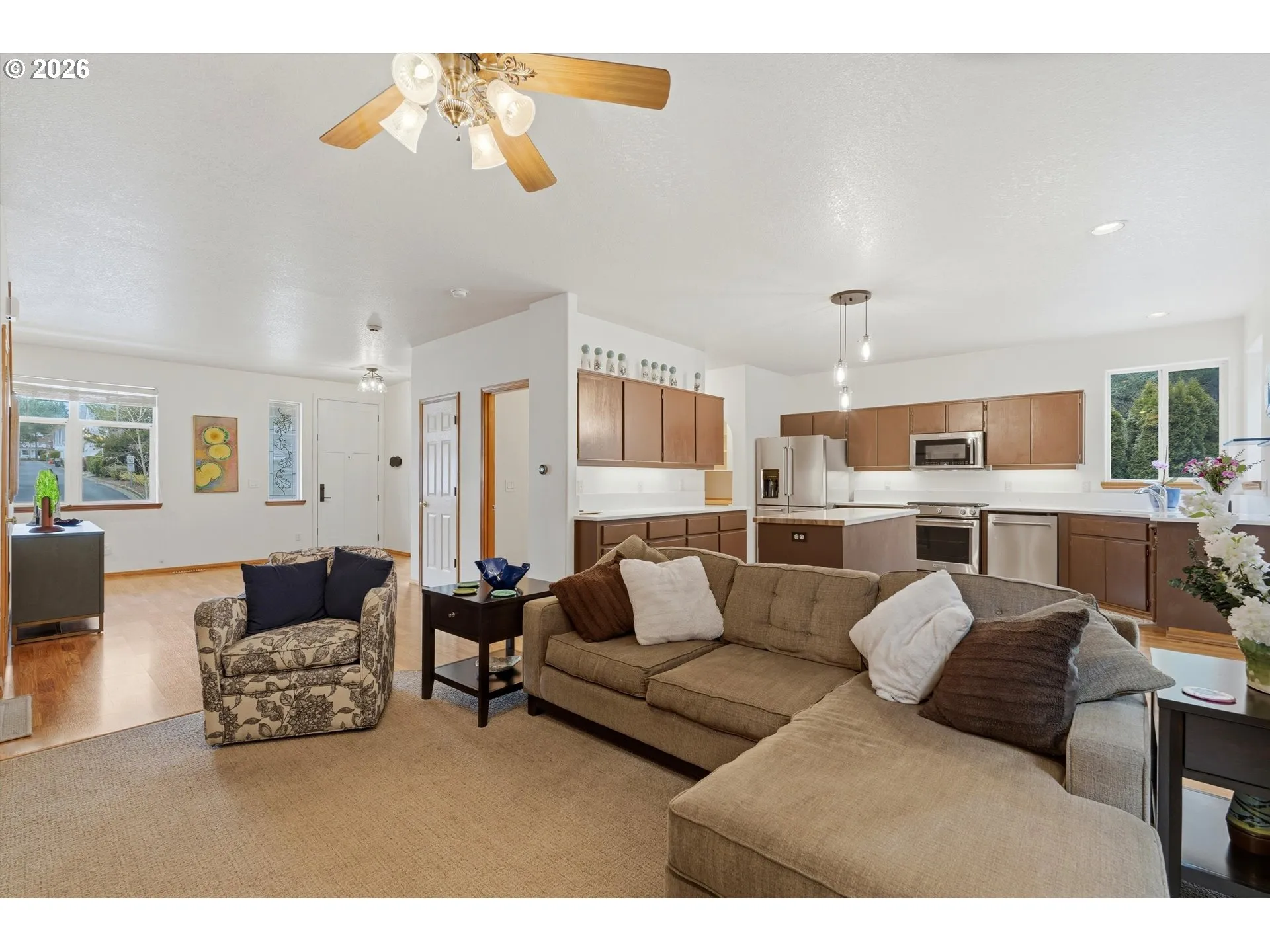 Located in the Canyon Creek Meadows community, this home is just minutes from Wilsonville Town Center, I-5, shopping, dining, and major employers like Siemens, Xerox, FLIR, and Collins Aerospace. The home also offers a natural feel with greenspace next door, nearby walking trails, community parks, and a playground. This well maintained home has an open floor plan and an updated kitchen featuring quartz countertops and upgraded appliances. The microwave doubles as a second oven with convection and air fryer features. The living room with a gas fireplace flows to the formal dining area and an expansive partially covered mahogany deck with built in natural gas hookup for the BBQ and pre-wiring for a hot tub, overlooking a river rock creek water feature for a peaceful outdoor setting. The oversized primary suite features a gas fireplace, an oversized walk-in closet with built-ins and a vanity, and a spacious bath with double sinks, a soaking tub, and a walk-in shower. The flexible floor plan includes a large fourth bedroom with a built-in desk and shelving, ideal for a home office or guest room. Oversized garage with epoxy floors, storage shelving, a utility sink, and 220V wiring for an EV charger or workshop equipment. This home is exceptionally well maintained with many recent updates including a new roof, furnace and air conditioning (2020), kitchen appliances (2023), and additional improvements throughout the home. Ask your agent for the full list of updates.