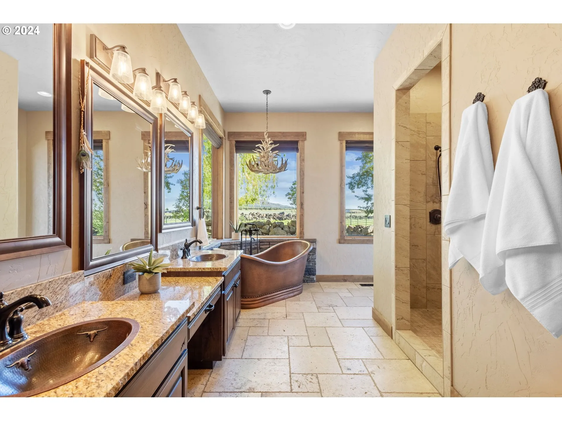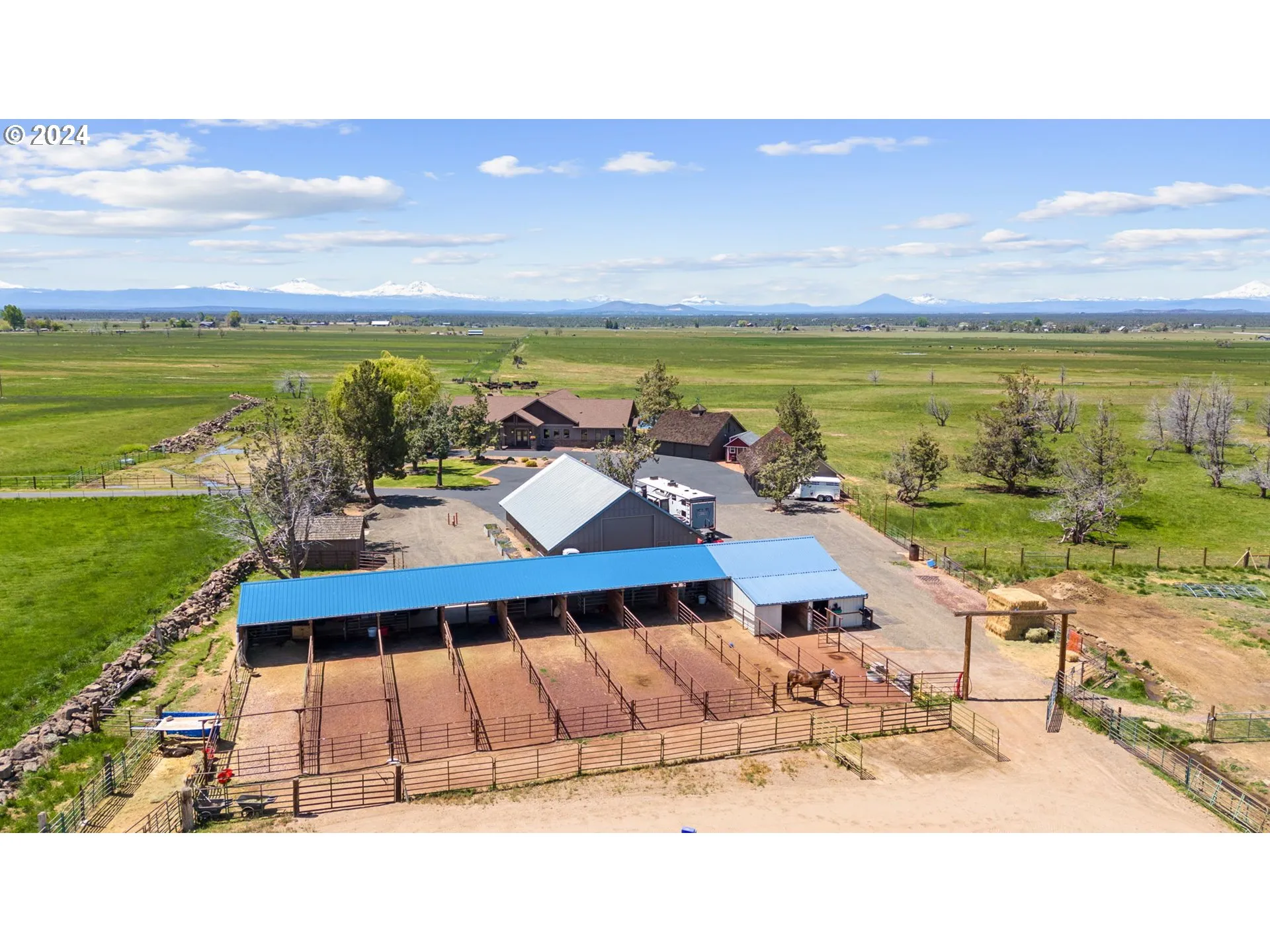 3,714 sqft, 3b/3.5 bth home. Breathtaking views of the Cascades. 102.92 ac. w/ 98 ac., flood irrigated, fenced & x-fenced w/ 7 strand fencing. Luxury home w/ rough edge granite, copper fixtures, S.S. fridge w/ 32” doors, 6 burner cooktop, soft close drawers, ceiling height cabinets, stone backsplash, 5×9 island, antler chandelier, 8 ft doors & hand troweled walls. Butlers pantry has addl’ fridge, sink, DW, dbl ovens, & pantry. Fireplace in primary, 2nd BR & LR. Primary has Cascade views w/ slider to the patio, hot tub, & firepit. Primary bth has copper sinks, copper soaking tub w/ antler chandelier & tile walk in shower. Bdrms 2&3 have ensuite bthrms w/ tile floors, walk in tile showers, copper fixtures & granite counters. Two – 3 car garages. Studio w/ bth & granite counters. 10 stall barn w/ runs, arena, 2 frost free faucets in barn. 2 machine sheds- 20×60 & 54×20. 1156 sqft farmhand hm. 4 irr ponds, shop w/ 2 14′ roll up doors, loft storage & bathroom. Plus so much more!