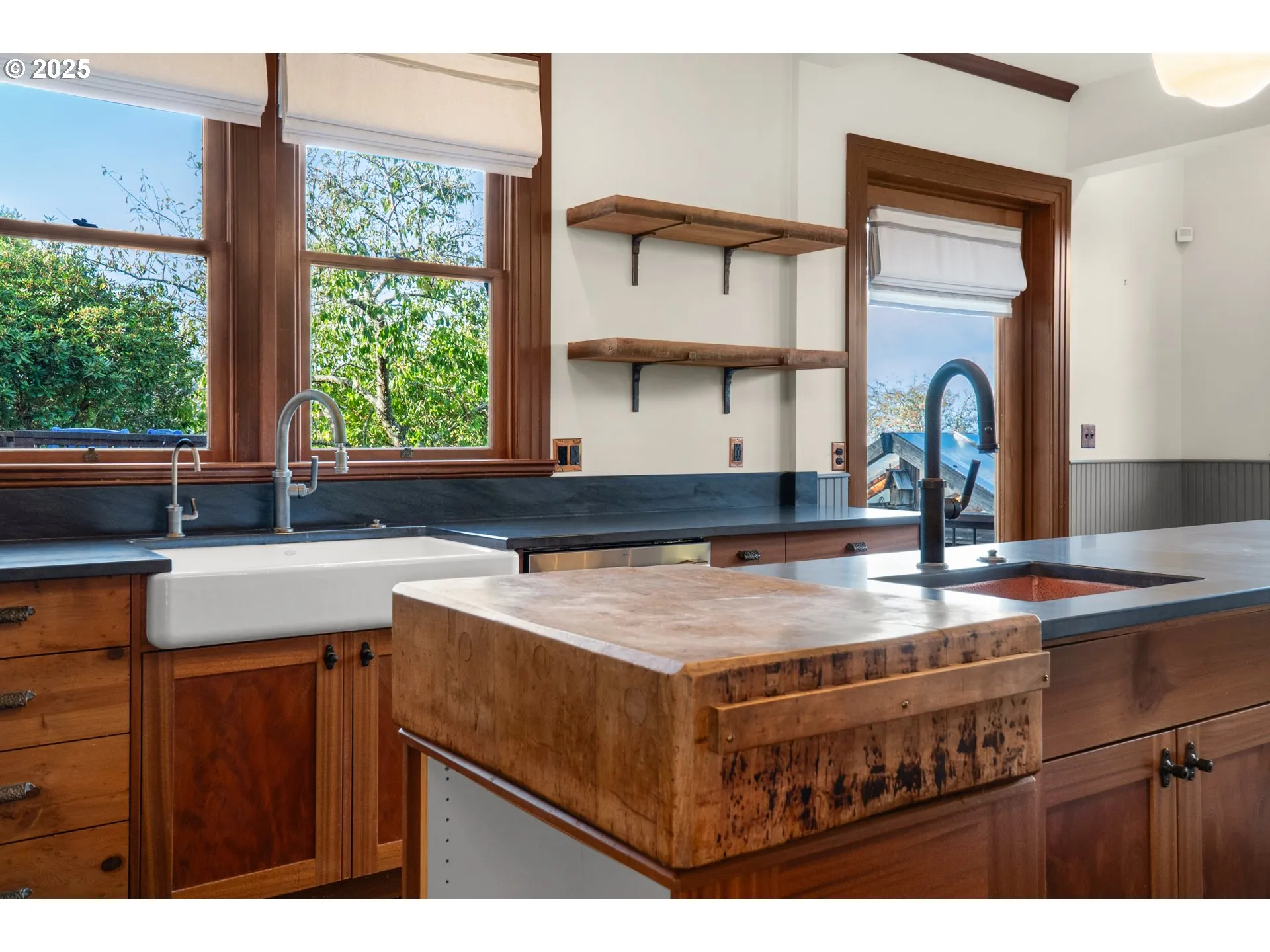 Thoughtfully updated Craftsman estate located in Astoria’s desirable McClure District, just blocks from downtown dining, arts, and the waterfront. Position on an oversized lot with panoramic views of the Columbia River and surrounded by curated gardens designed by a master gardener, this home offers exceptional privacy, year-round natural beauty, and an inviting indoor-outdoor lifestyle.Enjoy mornings on the wraparound front porch, evenings on the rear deck overlooking the water, and peaceful moments in the fenced backyard oasis with winding paths, mature maples, black bamboo, and a greenhouse with a workbench topped with Carrara marble counters. The show stopping kitchen is the heart of the home, featuring granite counters, custom redwood cabinetry, heated floors, antique butcher block, hammered copper vegetable sink, and oversized copper range hood. A large wooden door with glass panel extends the living space to the outdoors.The newly added primary suite is a true retreat, with vaulted ceilings, panoramic river views, dual walk-in closets, and a spa-like bath offering a soaking tub, tiled shower, Bluetooth speakers, and heated floors. Additional living spaces include a library, dedicated office, and a fully remodeled 929 sq ft guest apartment with its own kitchen, bathroom, and laundry—perfect for guests or supplemental income.Modern systems have been meticulously upgraded, including a 200-amp electrical panel, Romex wiring, high-efficiency furnace, A/C, radon mitigation, sewer line improvements, and a CertainTeed 50-year roof—ensuring comfort and reliability for years to come.At its core, this is the James Bremner House, a distinguished 1901 residence that honors its architectural heritage. Original features such as leaded glass windows, built-in linen closets, art rails, and timeless craftsmanship reflect its historic character, now seamlessly blended with the comforts of modern living.