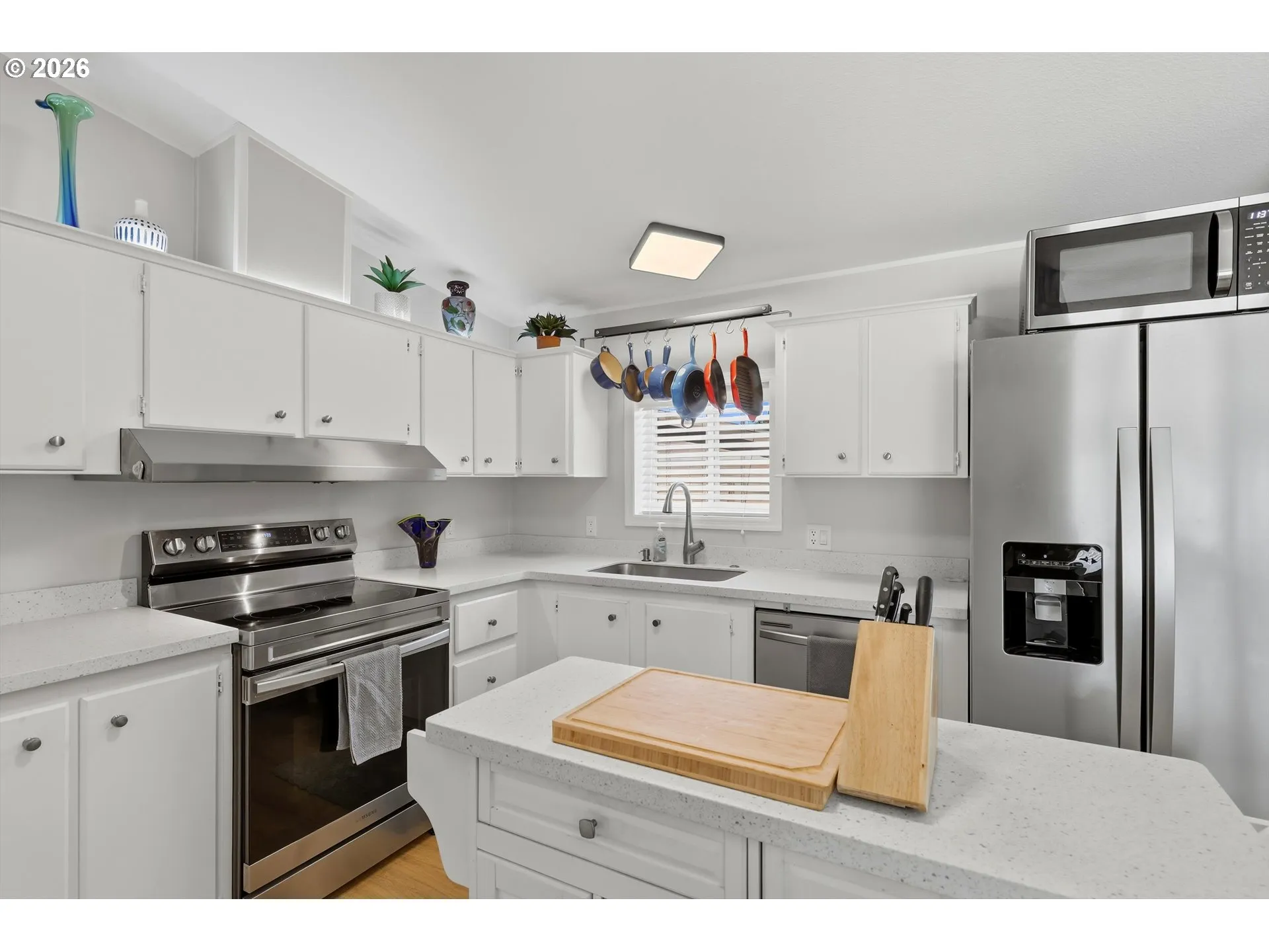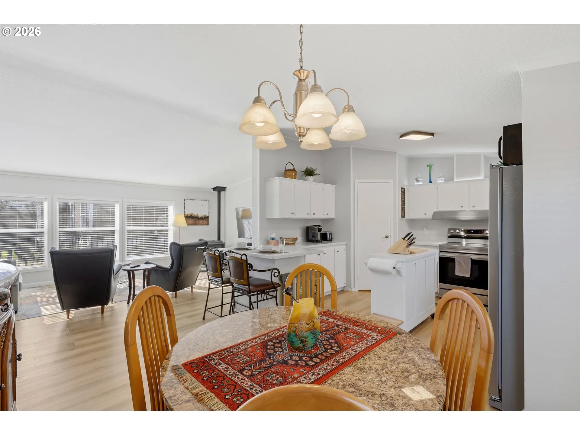 Beautifully remodeled manufactured home located at the end of a quiet cul-de-sac in a peaceful 55+ community. This move-in ready home features new interior and exterior paint and durable luxury vinyl flooring throughout.The updated kitchen is designed for both function and style with an island, eating bar, walk-in pantry, Corian countertops, and stainless steel appliances. The bright living room offers vaulted ceilings and desirable southwest exposure for great natural light.The spacious primary suite includes a walk-in closet, double sinks, walk-in shower, premium master carpet w/plush pad and completely updated plumbing. The guest bathroom has also been fully remodeled with a tub/shower combination. Two additional large bedrooms offer generous closet space and provide flexibility for guests, office space, or hobbies.Conveniently located near shopping, schools, and daily amenities, this home provides an excellent opportunity for first-time buyers, downsizers, or investors.Enjoy outdoor living with a covered porch, front deck, oversized carport with motion sensor lighting, and a large fenced yard. A nicely sized tool shed provides excellent extra storage. The large utility room includes washer and dryer. Home is equipped with an electric heat pump providing efficient heating and air conditioning.Quiet neighborhood setting while still convenient to everyday amenities.Conveniently located near shopping, schools, and daily amenities, this home provides an excellent opportunity for first-time buyers, downsizers, or investors. Move-in ready and offering great value for rent space vs. other parks. This property is a must-see.