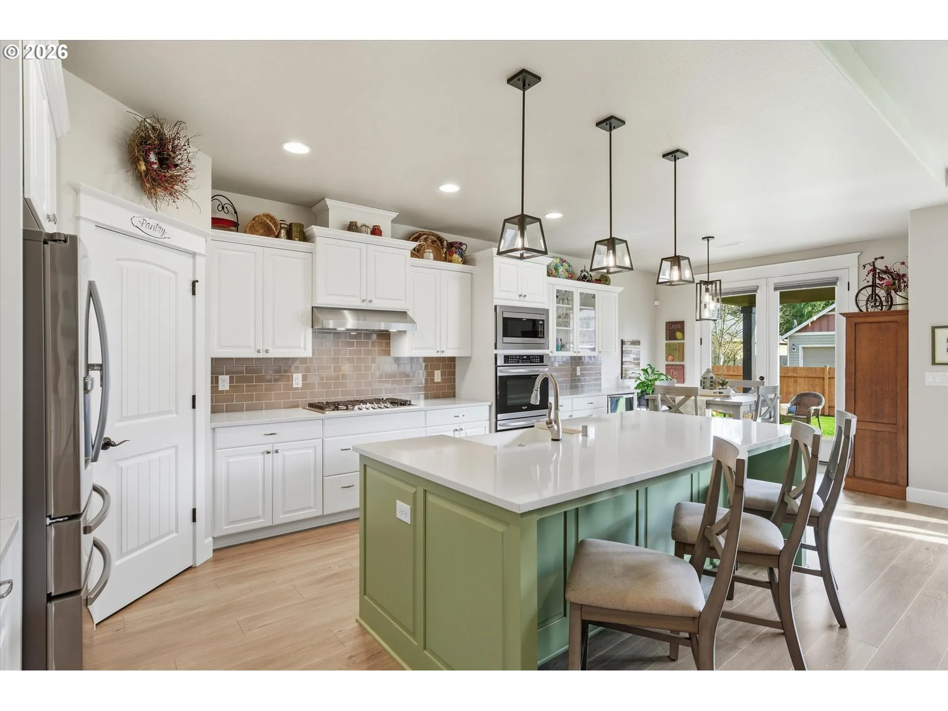 Single-level home featuring quality finishes, smart features, and thoughtful design throughout. Interior highlights include 10-foot ceilings, custom lighting, crown molding in the dining area, LVP flooring in main living spaces, and carpeted bedrooms with a 9-inch pad in the primary suite and closet. The kitchen boasts soft-close white cabinetry, quartz countertops, a farmhouse sink, under-cabinet lighting, a built-in microwave, double Wi-Fi ovens, a Wi-Fi refrigerator, a wine cooler, and a dishwasher.The great room offers a gas fireplace, surround sound, a Hunter ceiling fan, floor outlet, smurf tubing, and smart lighting. The primary suite is privately separated from the secondary bedrooms and includes custom up/down blinds, a Home Decorators Jonathan Y ceiling fan, and a tiled bath with a large shower.Additional features include a utility room with sink, 25-year warranty linoleum flooring, central vacuum, extra storage, a Rheem hot water system with air filtration, a Trane heat pump, Ring alarm system, Comcast service, Wi-Fi throughout, and TV wiring in the garage. Exterior highlights include Hardi plank siding with brick and board-and-batten accents, RV parking, and a three-car garage with insulated upper walls, extra storage, and wireless Chamberlain openers. Two covered patios include a front patio with a chandelier and a rear 12×12 patio with French doors, a gas BBQ line, pre-wired for a hot tub, and dual outlets. Additional amenities include custom 6-foot fencing and permanent holiday lighting. No CC&Rs.