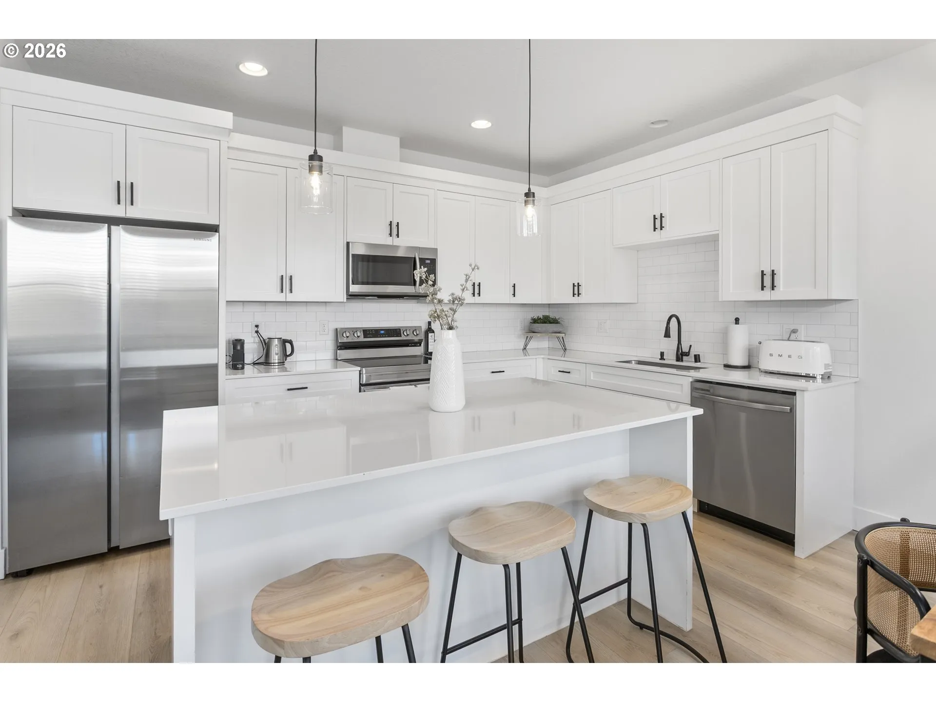 Discover modern comfort in this beautifully crafted 2022 townhome in Battle Ground. Thoughtfully designed with a cozy yet refined farmhouse feel, the home features marble, quartz, LVP, and tile finishes throughout. The open-concept kitchen offers a large island, stainless steel appliances, and quartz countertops—perfect for everyday living and entertaining. High ceilings create a bright, open atmosphere, while generously sized rooms provide comfortable living spaces.The primary suite is filled with natural light and includes a double-vanity bath with a walk-in shower. Tucked away on a private dead-end, the home backs to a peaceful wetland field, offering both privacy and scenic views. Located just minutes from Lewisville Park and Daybreak Park & Boat Launch, and within easy reach of shopping at Battle Ground Market Center and West Main Commons, this townhome offers the perfect balance of quiet living and everyday convenience.