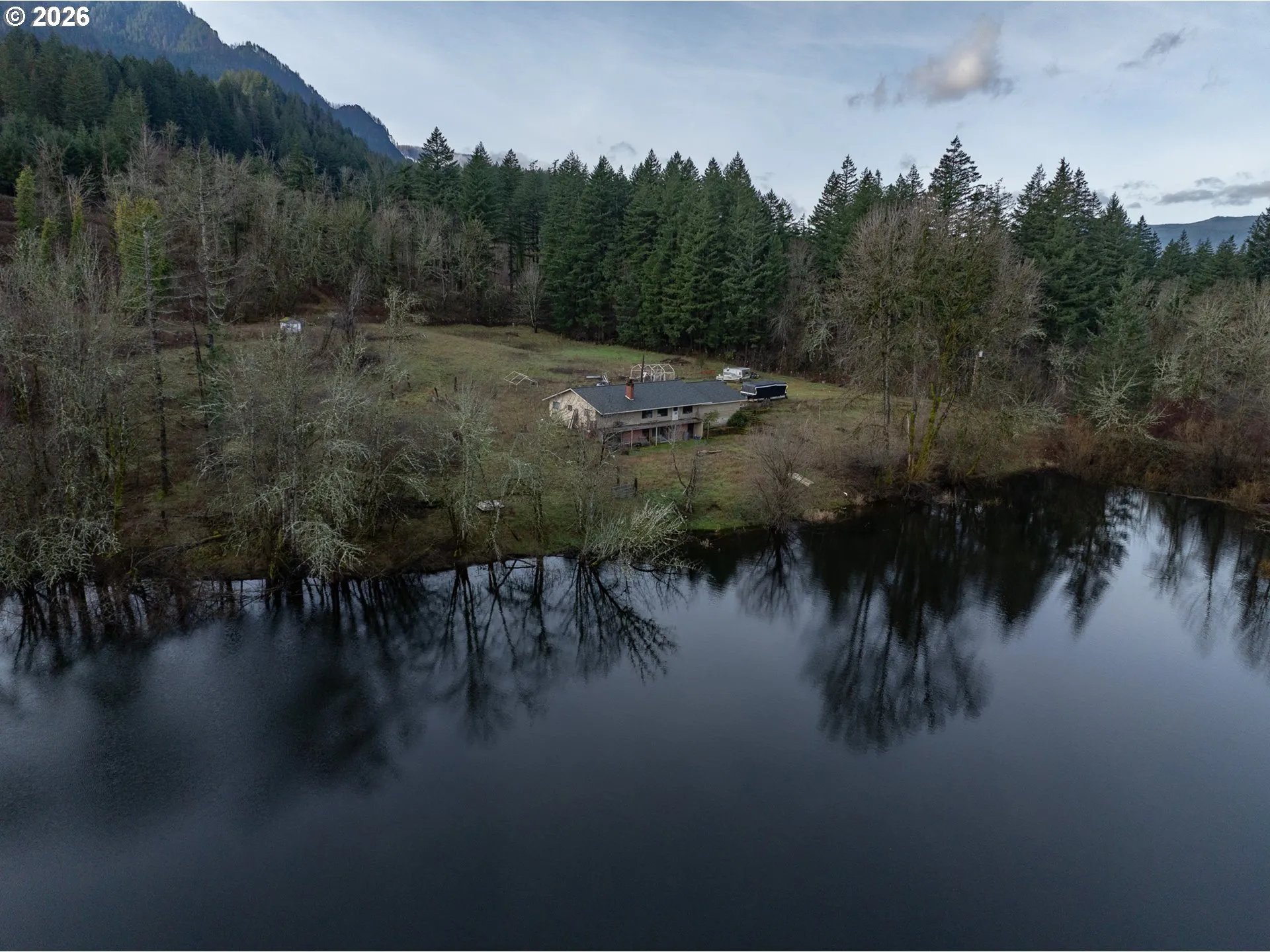 4 bedroom 3 bath one story with 2 car garage with a daylight basement that includes a kitchen, living room, bedroom, bathroom and storage. This fixer is just waiting for your improvements, remodel or rebuild plans. It sits on an amazing and scenic 20.8 acre property located in the Columbia River Gorge area. Just outside of the Cascade Locks small historic town in along the Columbia River. You have the opportunity to own some of that beauty. The house overlooks a 4 acre pond that has a seasonal stream flowing into it with bass and bluefish. With all of the majestic wildlife the Cascades have to offer wandering around your property. Serene views in every direction. The property was logged in 2021 and replanted so there are fresh new trees growing in. The house has a newer roof as of 2021 with a solid foundation. Update, Replace or Repair? Maybe a great development location. Let the surroundings inspire you.
