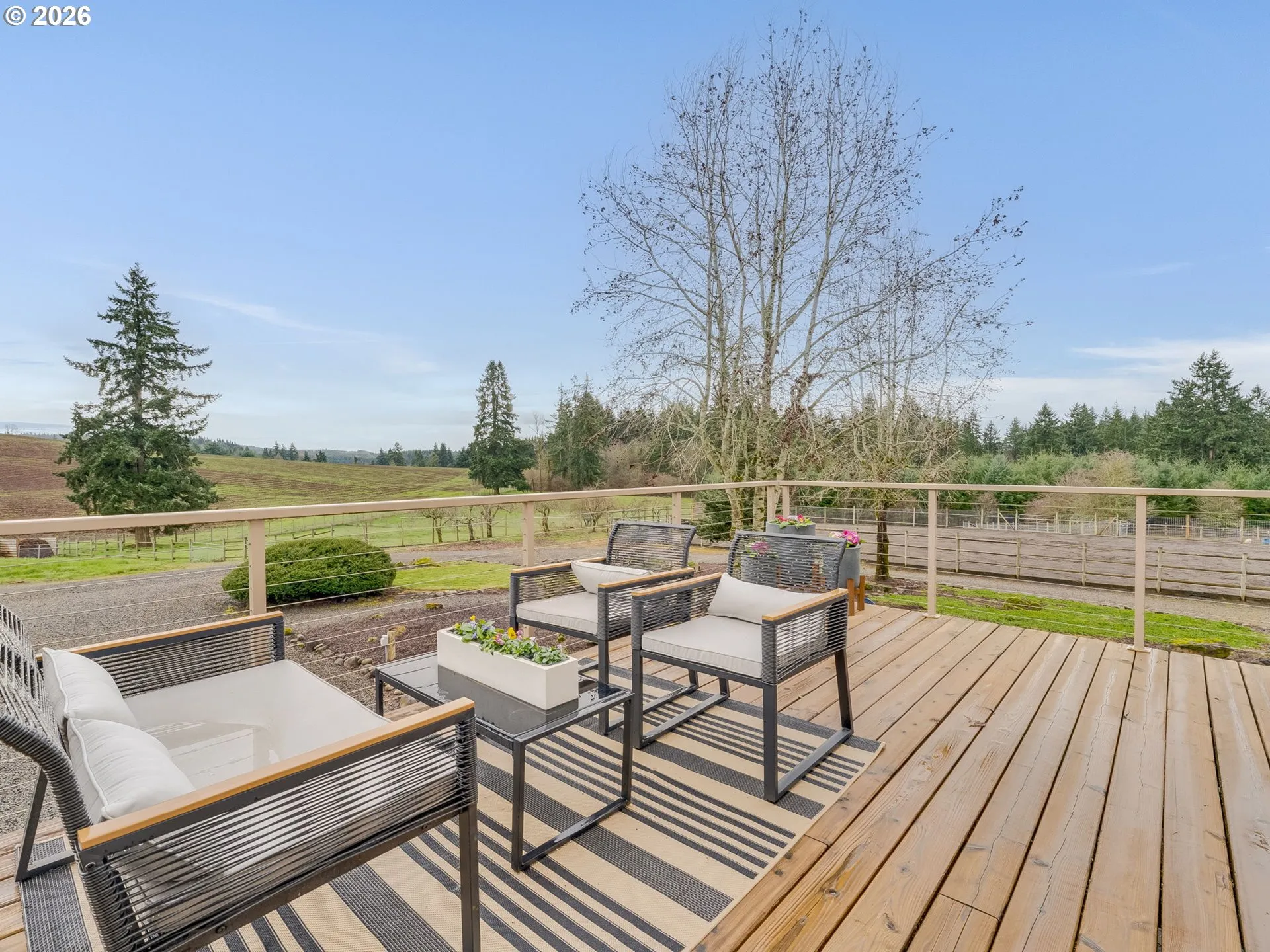 Light-filled with Southern exposure, this gated equestrian estate on over 5 acres offers a plethora of amenities for your farm, horse, cottage business, or hobby delights including possible ADU arrangement. Home features main level living with primary & second bedrooms, two bathrooms, laundry, kitchen, deck and garage all on the main level. The lower level includes 2nd laundry room, family room, 2 bedrooms, bath, covered patio, private outside entrance & abundant storage. A second full kitchen was previously installed. A 48 x 48 barn includes 7 stalls (3 double matted) & tack room.(2 stalls currently used for feed and hay rooms.) The 70 x 120 outdoor arena is fully fenced with all-weather footing. An additional 24×60 shop has a concrete floor & 220 electrical. The home received a new 50 year Presidential roof in 2024. The property has 3 cross-fenced pastures with option for a 4th and offers peaceful views. The largest of trailers & RVs have plenty of pull-through/around space through entrance and exits with automatic Ghost gates. RV hookups include electrical & water. This gracious property features many fruit trees, a fire pit, and endless other possibilities to enjoy this special country setting. This property currently has farm tax-deferred status. Buyer to do diligence regarding needs and uses.
