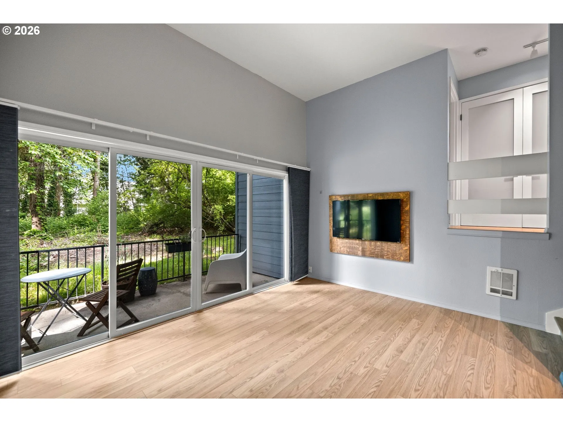 Nestled in a peaceful, established community, this beautifully updated end-unit condo blends modern style with everyday comfort. The open concept layout invites abundant natural light and creates an effortless flow between indoor and outdoor living spaces. The remodeled kitchen serves as the heart of the home, opened up for a more connected feel and featuring deep cabinetry, new stainless steel appliances, an induction range with convection oven and built-in air fryer, and both under and over cabinet lighting. A breakfast bar adds extra seating and functionality. The vaulted living room leads to a private, covered back patio—your own secluded retreat for relaxing or entertaining. The spacious primary bedroom includes a custom closet organizer and the second bedroom is thoughtfully positioned on the opposite end for added privacy. Located just steps from the renovated community pool and one block from Holly Farm Park. This home also offers easy access to schools, shopping, PCC Sylvania, and I-5. This is a must see home!