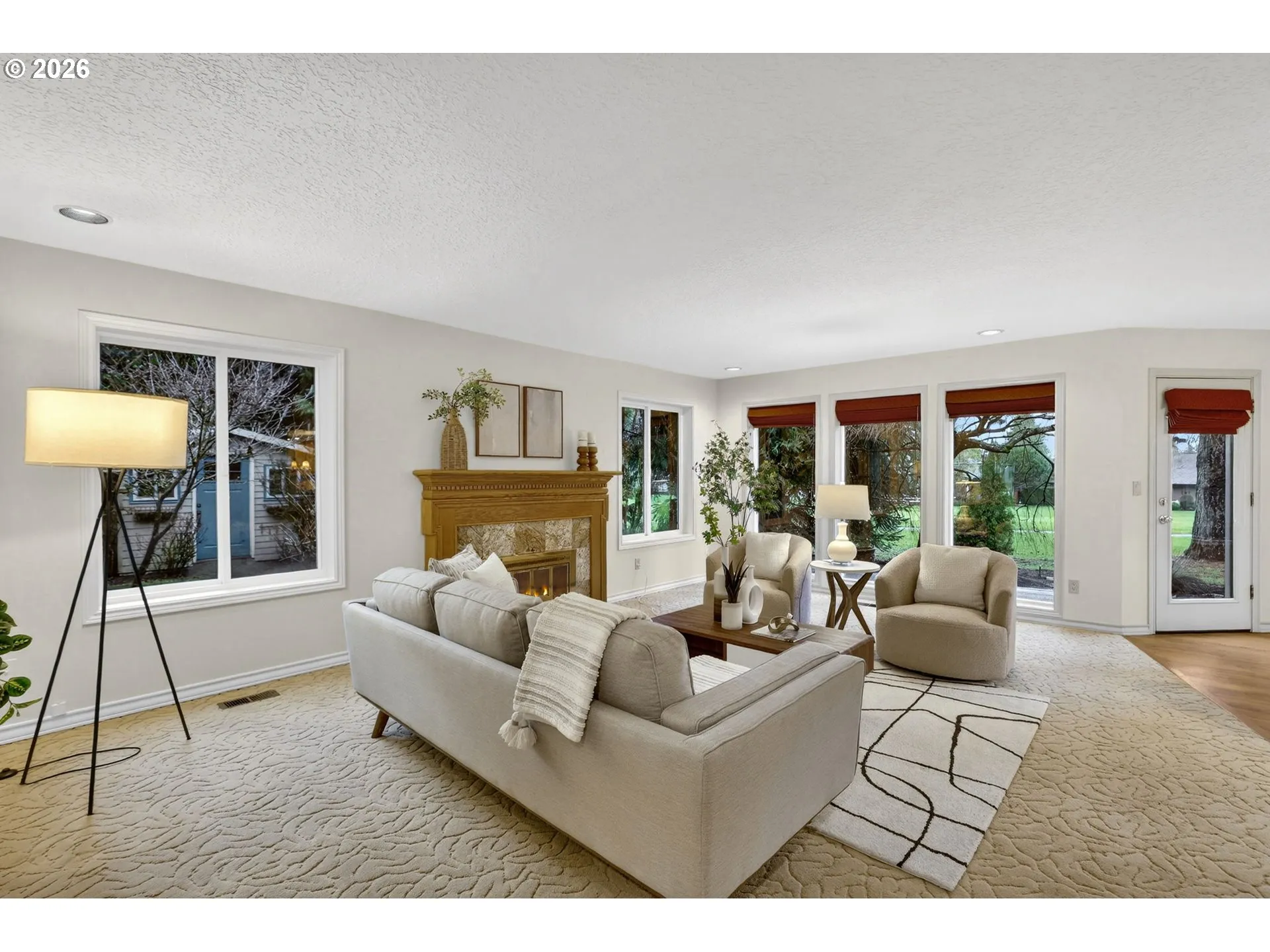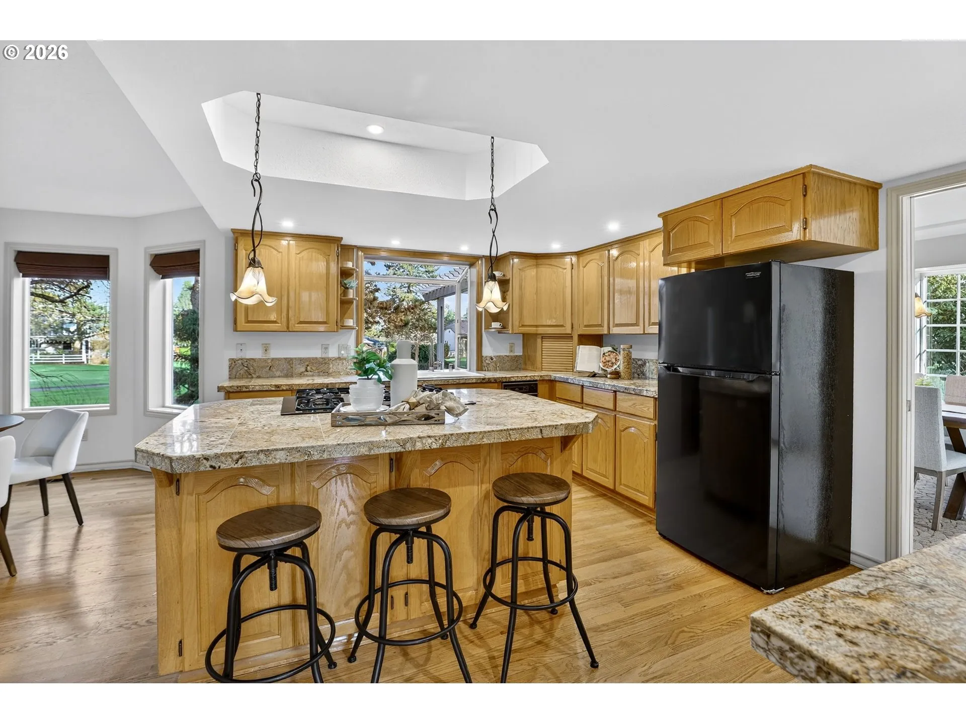 Spacious custom home backing to Green Meadows Golf Course, offering exceptional flexibility and serene views. An open entry, warm hardwood floors, and fresh interior paint create an inviting first impression. The versatile floor plan includes formal living and dining rooms, complemented by an open-concept kitchen and great room anchored by a cozy gas fireplace. With backyard access from both the great room and dining room, the layout is ideal for everyday living and effortless entertaining.The gourmet-style kitchen is perfectly positioned for gatherings and ready for your modern updates. Step outside to the beautifully landscaped backyard, where mature plantings provide privacy and peaceful golf course views. The main level also features a half bath and a flexible office or 5th bedroom—perfect for remote work or guests.Upstairs, the generous primary suite offers a gas fireplace, walk-in closet, and en-suite bath, while two additional bedrooms and a large bonus room with closets provide endless options for media, play, or additional living or sleeping space. Exceptional storage throughout, a 3-car garage, tile roof, and a prime central location near shopping, services, and Club Green Meadows—with golf, tennis, pickleball, and more—complete the package. A new refrigerator and dishwasher, along with freshly painted interiors and newly cleaned carpets, make this home ready for your personal touch.