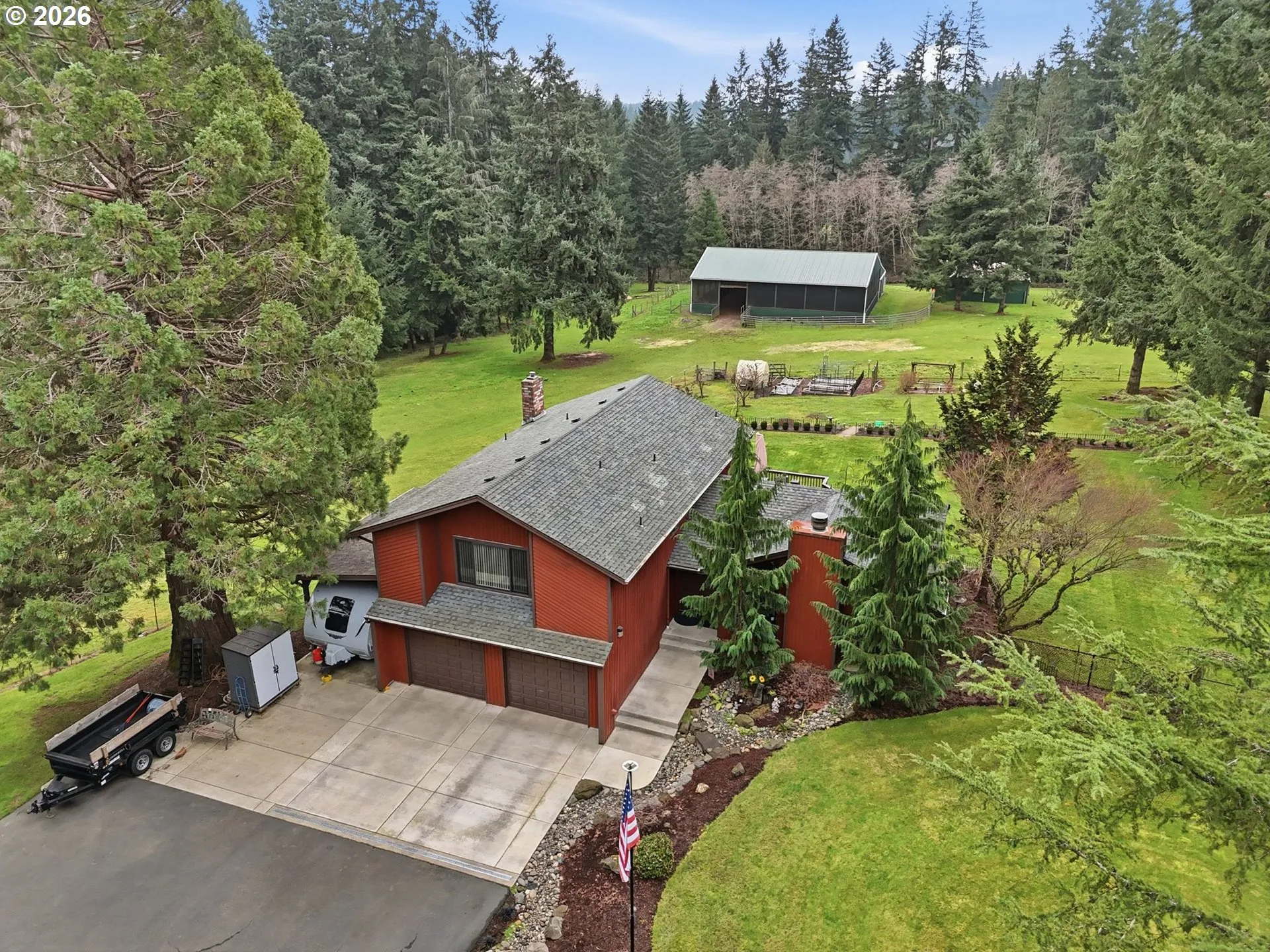 Horse Property- Close in TOWN- 5 Private, Usable Acres | Covered Arena | Dual Barn Setup• 5 flat, fully usable acres• Covered, lighted arena (approx. 50×72) with direct barn access• Main barn: Three 12×12 rubber-matted stalls, tack room, hay + tractor storage, Eco Green Grid footing• Second barn (24×36): Three additional stalls,(12×36) hayloft, power, ag flooring• Cross-fenced pasture for multiple paddocksAdditional Property Features:• Fenced garden space + greenhouse + raised beds• Orchard: Asian pear, apple, plum, berries, grapes• Chicken coop• Open lawn + mature trees• RV parking (approx. 28–30 ft covered)• Parking for anything and everything!Home – 2,182 SF | 4 Bed | 3.5 Bath• Vaulted ceilings + wood-burning fireplace• Large windows with pasture views• Kitchen with heated tile floors, granite counters, induction cooktop, convection oven (air fryer capable), stainless appliances• Lower level flex space with pellet stove + exterior access• Covered deck with ceiling fan + additional patio spacePrivate setting with established infrastructure for horses, hobby farming, or multi-use living.