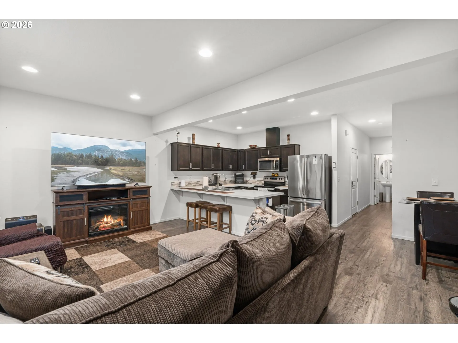 Modern low-maintenance townhome in the desirable Four Seasons community featuring an attached one-car garage and a thoughtfully designed open-concept layout. Built in 2020 and tucked inside the community, this home is set away from the main road for added privacy. The bright main level offers abundant natural light, laminate flooring, and a spacious kitchen with stainless steel appliances and an inviting eating bar, perfect for everyday living or casual entertaining. Upstairs, a versatile loft provides flexible living space alongside three bedrooms and two full baths, including a comfortable primary suite with a walk-in closet. Enjoy year-round comfort with an efficient mini-split heating and cooling system and the convenience of upper-level laundry. Located within the Evergreen School District with easy access to parks, shopping, dining, and major commuter routes including I-205 and I-5. The HOA covers exterior maintenance and landscaping for truly low-maintenance living and includes access to a fully fenced community dog park nearby.