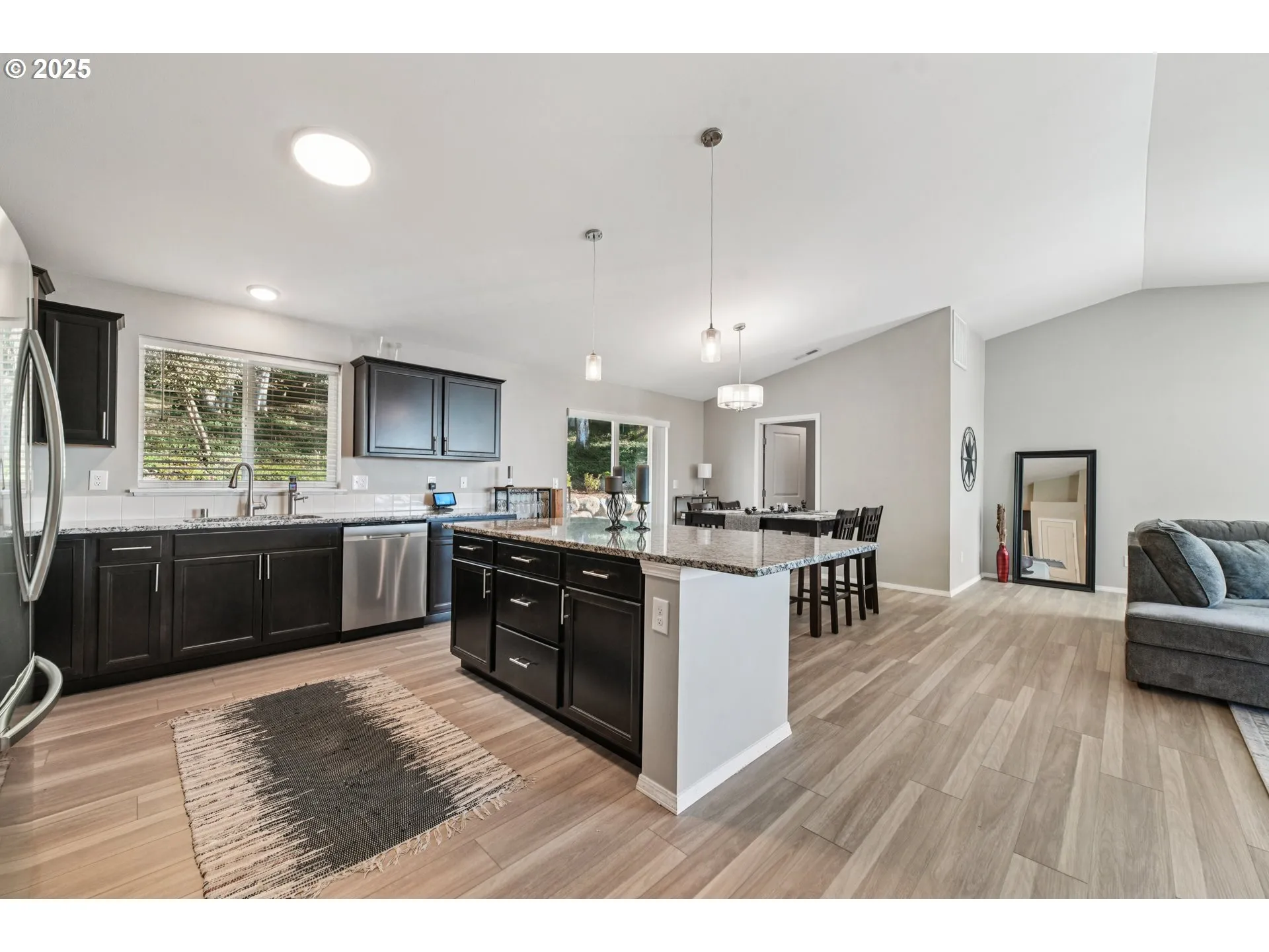 Nestled in the hills, this single-level home captures serene river views & breathtaking evening skies. A welcoming covered deck sets the stage for enjoying the beauty of the Pacific Northwest. Inside, calming finishes, vaulted ceilings, & expansive windows fill the home with natural light, showcasing sweeping territorial views.The sleek kitchen offers abundant cabinet & counter space, SS appliances & convenient eat-up bar. LVP flooring flows seamlessly throughout, tying each space together. Outside boasts parking for 10 vehicles, a leveled 2nd driveway for added convenience, & professional landscaping with hundreds of new plantings that will soon create both privacy & elegance. Functional design offering easy entry from garage to main.