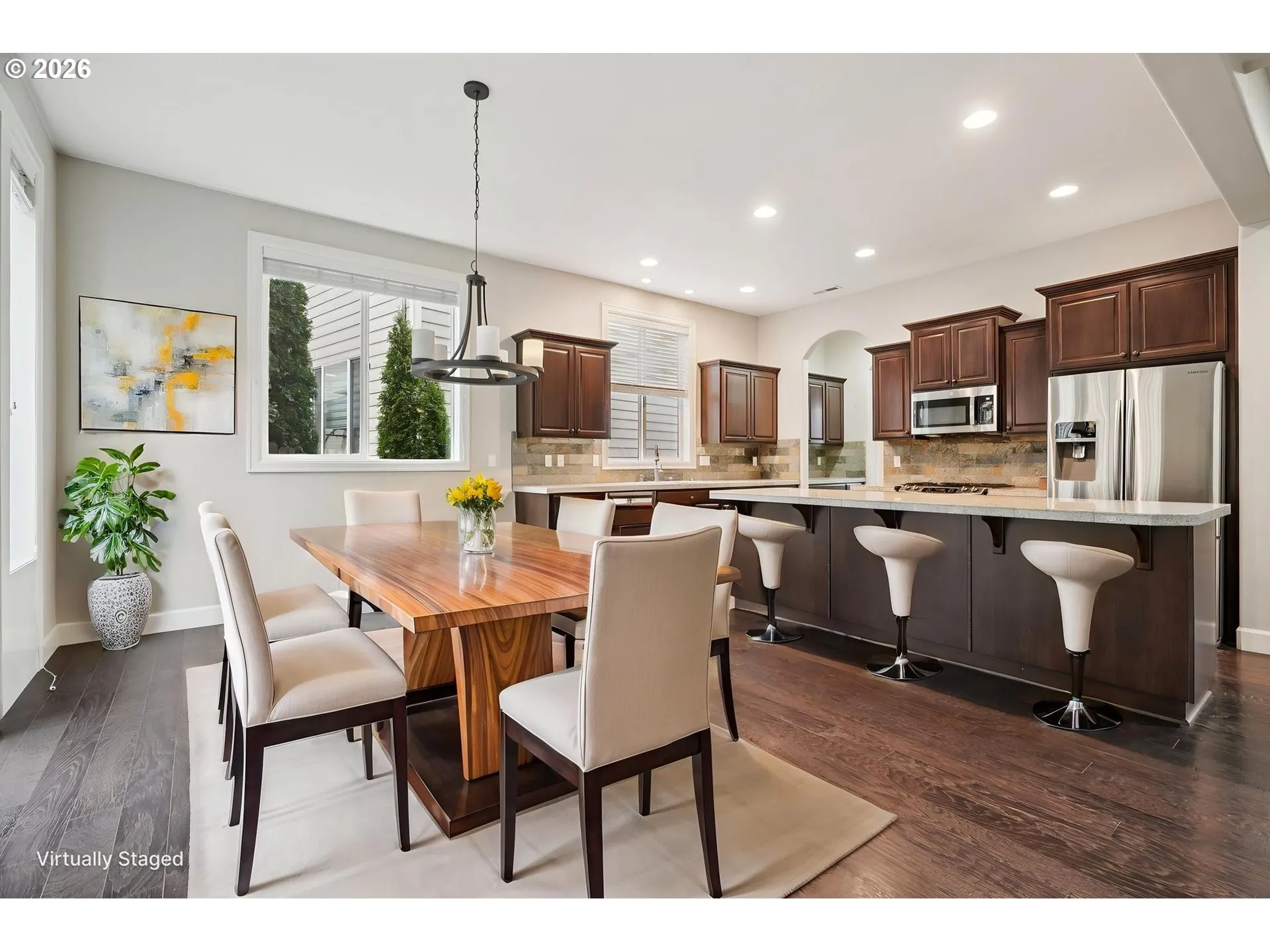 Beautiful home located directly across from Bonny Slope Elementary School. This thoughtfully designed home features a bedroom with elegant French doors and a full bathroom on the main level, perfect for guests or a home office. The kitchen is a chef’s dream with stainless steel gas appliances, a large island with an eating bar, granite countertops, and a butler’s pantry. A formal dining room greets you off the main entry, while the informal dining area opens to a the low-maintenance back yard with turf, a play structure, and a raised garden bed.The living room offers beautiful built-ins surrounding a cozy gas fireplace, creating a warm and inviting gathering space. In front, enjoy a spacious covered deck with a charming porch swing—perfect for year-round entertaining and relaxing outdoors.Upstairs you’ll find a spacious primary suite complete with a walk-in closet and a luxurious bathroom, along with three additional bedrooms and a media room with built-in power for a media system. Additional highlights include owned and paid off solar panels (4.8 kW system), garage overhead storage and an additional storage area. Ideally located just minutes from scenic walking trails, parks, shopping, and dining, with a convenient commute to major employers like Nike and Intel, as well as easy access to downtown Portland. This home truly offers the perfect blend of comfort, convenience, and lifestyle.
