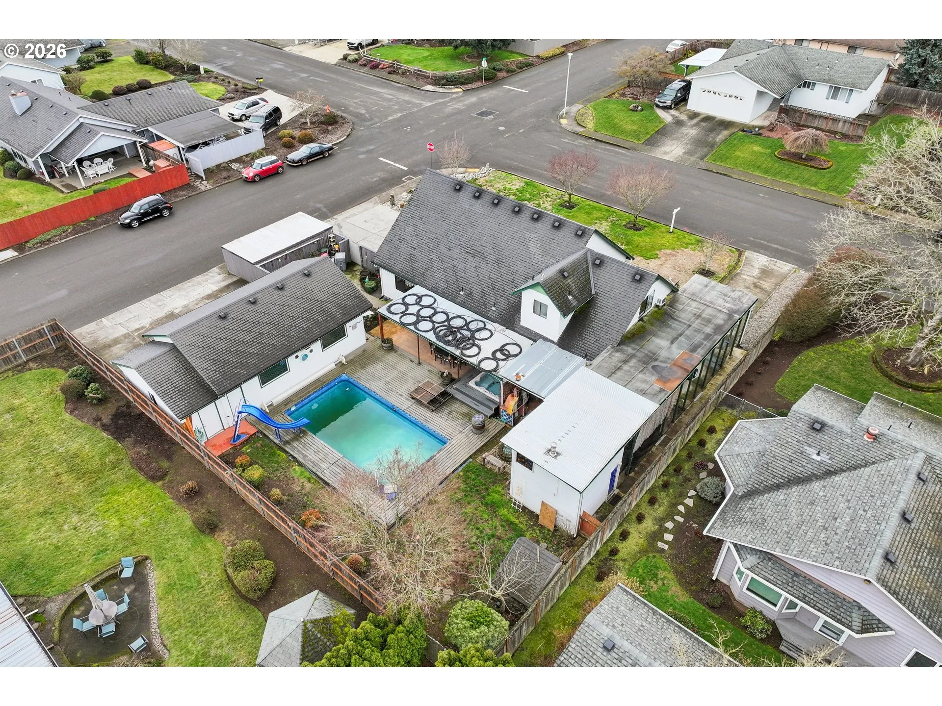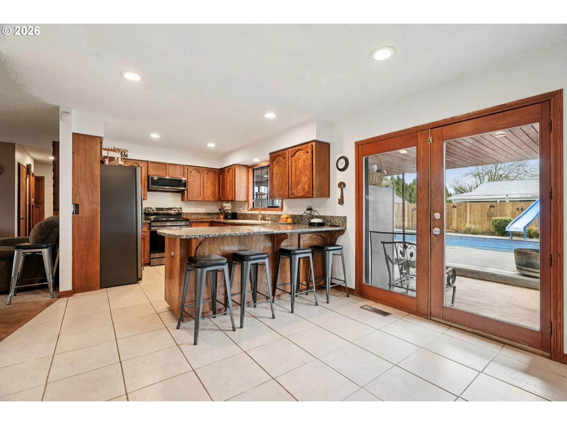 The house is just the beginning of this exceptionally equipped Northwest Canby property! Built in 1977 and still in the care of the original owners, this 4-bedroom, 2-bath home offers comfortable multi-level living with room for hobbies, entertaining, and outdoor enjoyment. The refreshed kitchen features granite counters and newer appliances, while double-paned Milgard windows (lifetime guarantee) bring in abundant natural light and energy efficiency throughout. A durable 40-year roof, approximately 10 years old, adds lasting value and peace of mind. The layout is ideal for multi-generational living or guest privacy: downstairs includes two bedrooms, a full bathroom with exterior access, and a dedicated laundry room; upstairs offers two additional bedrooms, a full bathroom, and a second washer/dryer. The spacious primary bedroom boasts a huge walk-in closet, plus there’s extensive attic storage for all your extras. Set on a fully irrigated corner lot of over a quarter acre, the grounds are designed for year-round enjoyment. Relax in the 10,000-gallon in-ground pool with solar heat and Trex pool deck, unwind in the Master Spa 8-person hot tub, or entertain on the covered patio complete with stainless outdoor sink, pizza oven, and propane fire pit. There’s even a rabbit hutch for small animals. For toys, tools, and projects, this property truly delivers. A 35’ covered RV parking area with full utility hookups and bonus storage keeps your RV protected and ready to go. The impressive detached 3-car shop features a mechanic pit and attached tool room—ideal for car enthusiasts or serious hobbyists. A separate detached shed provides dedicated covered space for a boat, smaller vehicles, or equipment, keeping everything organized and secure. Don’t miss your chance to own this unique combination of utility and lifestyle!