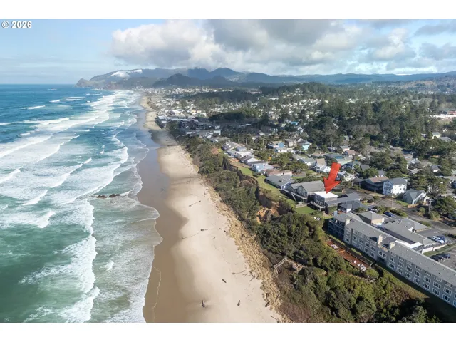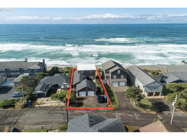Experience sweeping Pacific Ocean views and spectacular sunsets from this 3,566 sq ft oceanfront property. A dramatic wall of windows fills the home with natural light and uninterrupted coastal scenery—an ideal setting for relaxed Oregon Coast living. The 2,604 sq ft main home offers comfortable living spaces and thoughtful updates throughout, including engineered hardwood floors and a beautifully remodeled kitchen featuring new cabinetry, quartz countertops, and stainless steel appliances. Major improvements include a new roof in 2020, all windows replaced, and a tankless water heater serving the main house. An EV charger has also been installed for added convenience. The property includes a studio unit with its own private entrance, connected to the home yet functioning as a separate living space. A separate 936 sq ft lower-level 1 bed/1 bath apartment provides an additional long-term rental. Both units are currently leased, offering built-in income potential. Zoning allows for short-term rental use, subject to City of Lincoln City regulations, permit availability, and waitlist status. Buyer to verify all requirements with the city. Outside, the beautifully maintained full lawn with an in-ground sprinkler system creates a rare oceanfront green space—perfect for relaxing, entertaining, and enjoying the coastal setting. Ideally located near shopping, dining, golf, and Chinook Winds Casino Resort, this oceanfront property offers a rare blend of coastal living, flexible spaces, and income potential.