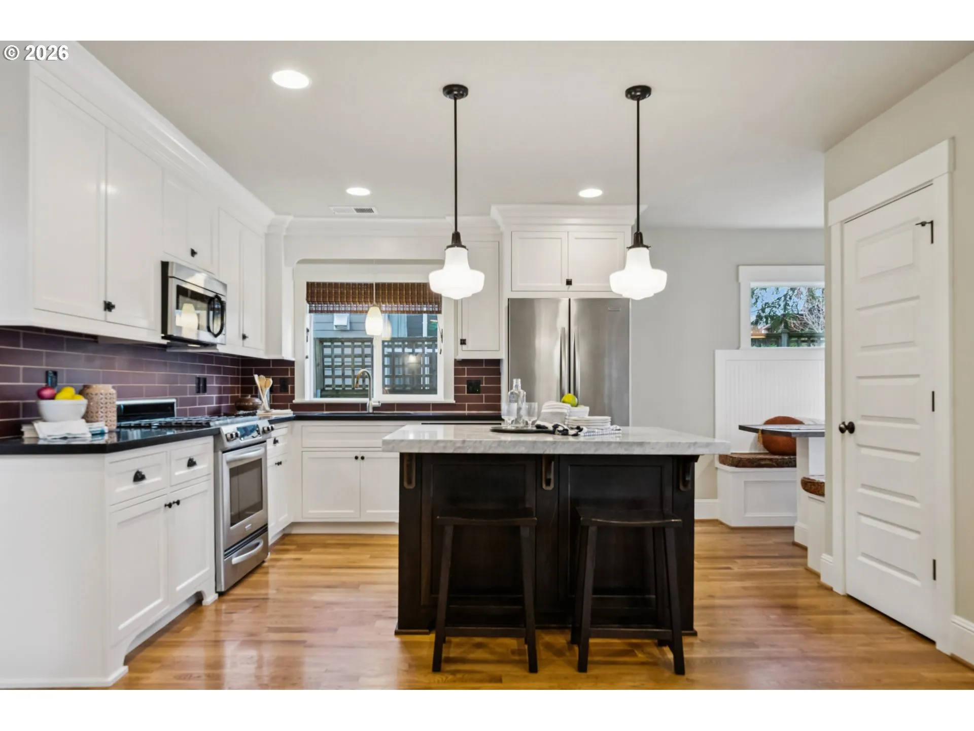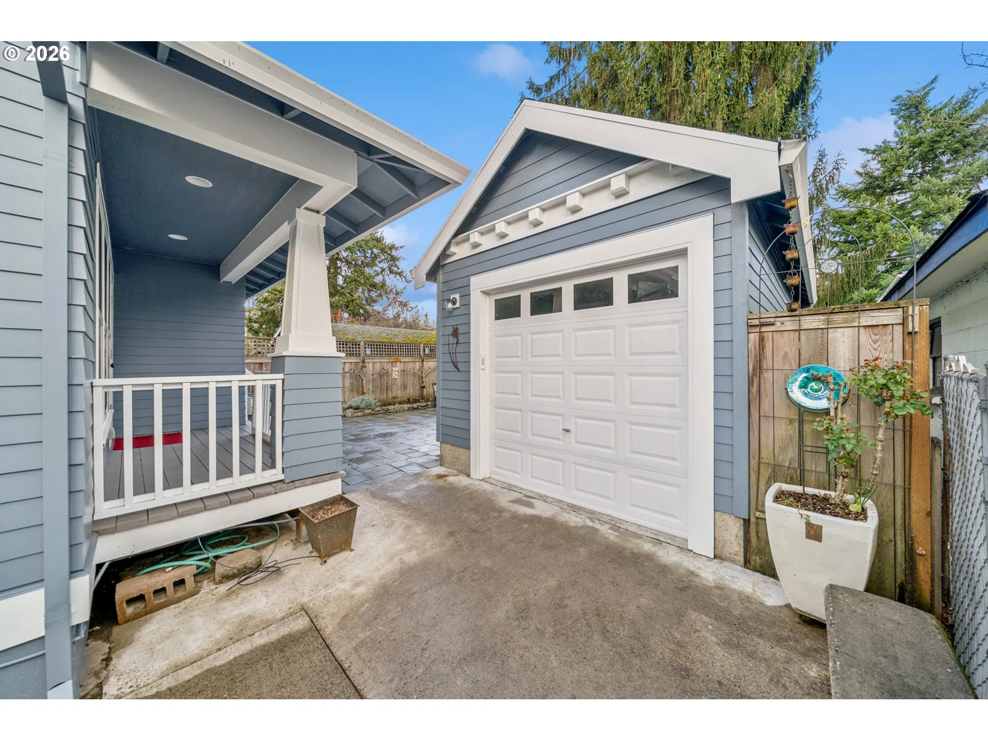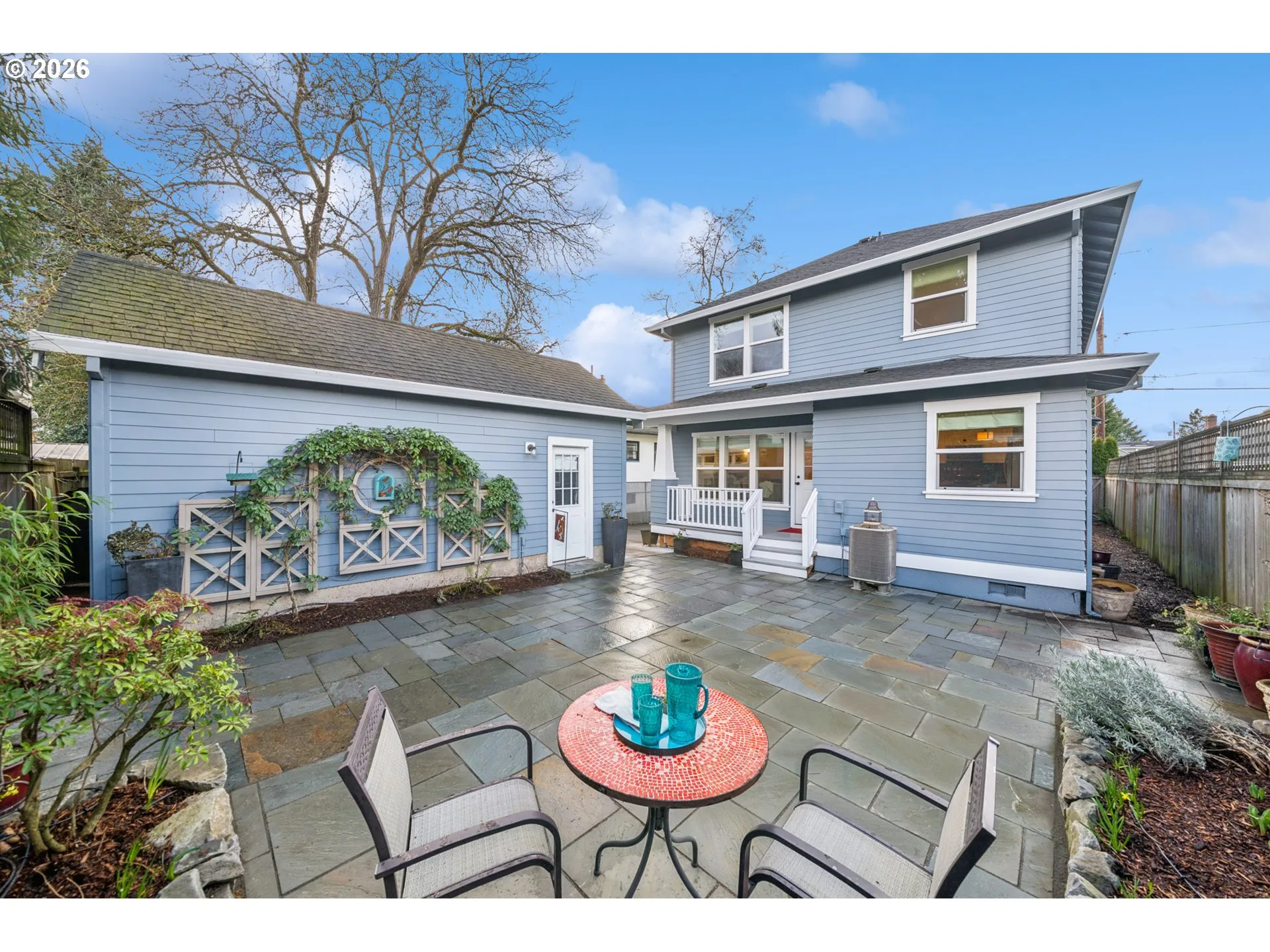 Located in the vibrant Alberta Arts District, this 2013 Craftsman home with 3-bedrooms, main floor office, and 2.5-baths, blends classic charm with modern comfort and fantastic location. Step up to the large, covered front porch and into the spacious living room with hardwood floors and coffered ceilings. Pocket doors open to the formal dining room with bay window while French doors frame the main floor office providing flexible work-from-home or dedicated creative space. At the back of the home, the open kitchen and family room flood with natural light. Centered around a beautiful marble island, the kitchen features a built-in eating nook, generous kitchen pantry, and cozy family room anchored by a gas fireplace with blower. The main floor guest bath includes a utility room while under-the-stairs closet space offers additional room for storage. Upstairs, the spacious primary suite features recessed ceiling lighting, a generous walk-in closet and an ensuite bath with marble counters, tile surrounds, a soaking tub, and walk-in shower. Daily life is a breeze with two additional upper-level bedrooms, upper-level laundry, an additional full bath, plus a central vacuum system and AC throughout the home. Back downstairs, step easily from the family room onto the back porch and out to the low-maintenance and beautifully hardscaped Pennsylvania blue stone patio. Outdoor living shines with this courtyard style space perfect for entertaining. Espalier pear trees, vines, and shrubs line the private yard and are just beginning to wake up from their winter sleep. With a long driveway and detached garage, the home offers plenty of parking and additional storage. Ideally situated in one of the most pedestrian and bicycle-friendly neighborhoods in Portland with easy access to Alberta shops & restaurants, the North Williams Avenue bike corridor, convenient access to I-5 and downtown Portland, this home offers excellent connectivity for commuting, recreation, and everyday amenities. [Home Energy Score = 6. HES Report at https://rpt.greenbuildingregistry.com/hes/OR10243760]