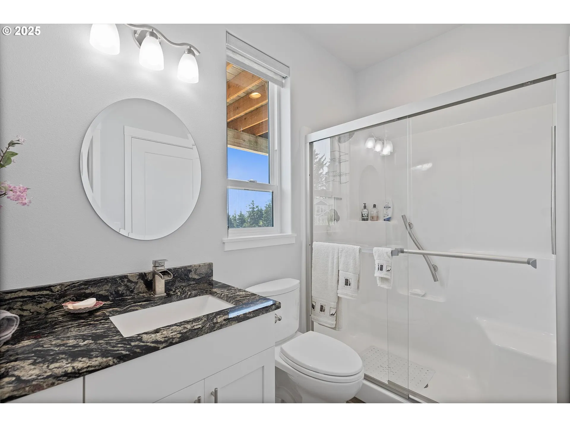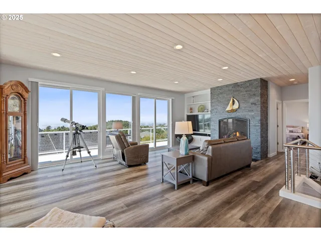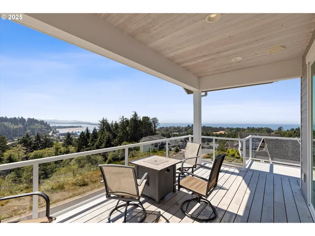 Situated in the Resort at Bayview community, this 3 bedroom, 2.5 bath residence was built by Innovative Construction and showcases some of the most impressive views on the coast. From Siletz Bay & Salishan Spit to the Pacific Ocean and sandy shoreline, the main level features a light-filled living room, nine-foot ceilings with cedar planking, a custom gas fireplace & expansive windows to take in the scenery. The kitchen is designed for both function and entertaining, featuring commercial-grade stainless steel appliances, a gas range, striking black leather no-gloss granite countertops, and generous counter space. The home is also pre-wired for surround sound. The primary suite captures sweeping views and includes a spacious walk-in closet with its own washer/dryer and a spa-like bath with a jetted tub, walk-in shower & mounted television. The lower level offers 2 additional bedrooms, a full bath, a laundry room, a kitchenette/bar, and a comfortable media room. Perfect for movie nights or watching the big game. The oversized garage provides room for parking and a possible workshop area and is pre-wired for EV Car charging. Also included is a generator to power the home. As part of the HOA, residents enjoy access to an indoor pool and a modern fitness center.