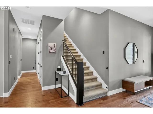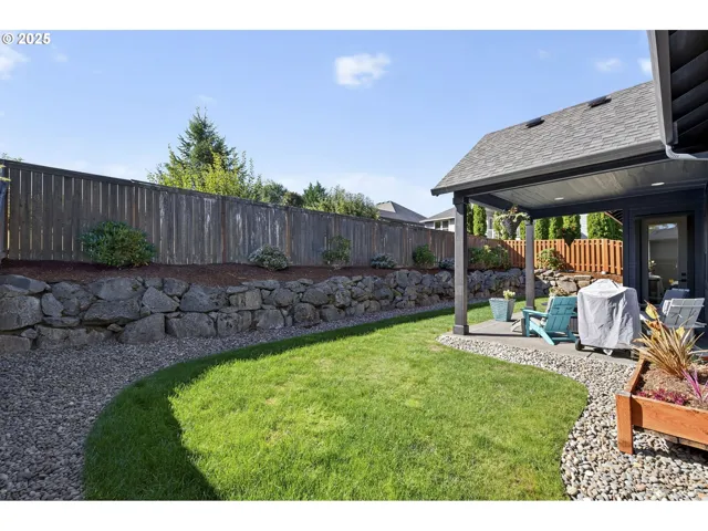 Impeccably maintained and built for easy one-level living, this modern classic is packed with thoughtful upgrades, starting with 10’ ceilings and 8’ solid-core doors throughout. The main living area shines with a vaulted ceiling, engineered hardwoods, and striking 9’ custom built-ins framing a gas fireplace. The open kitchen is fully dialed in with premium appliances and sleek finishes: side-by-side refrigerator and freezer, standalone gas cooktop, quartz counters, marble accent tile, and ceiling-height cabinetry. A walk-in pantry with a built-in wine rack and a mudroom with bench storage keep daily life organized and polished. The primary suite feels like a true retreat with a fully tiled shower, freestanding soaking tub, dual sinks, private water closet, and spacious walk-in closet. Three additional bedrooms plus a dedicated office offer flexibility, including custom lateral built-ins and integrated power designed to conceal internet equipment and printers for a clean work-from-home setup. The second bath continues the upscale feel with a Duravit tub, tiled surround, and quartz counters. Upstairs, an expansive flex space is ready for movie nights, hobbies, lounging, or a second living area. Smart utility upgrades include a tankless water heater, water softener, and Cat5 runs to every room. Outside, enjoy a 13’x17’ covered patio, full sprinkler system, and French drains along both sides of the home and below the retaining wall. The insulated garage stands out with 14’ ceilings, suspended storage racks, and plywood backing throughout. Nearby: three parks, protected wetlands, and East Fork River access. Local schools shine, with a new middle school completed in 2021 and a high school skilled trades center dedicated in 2025. Costco is about 10 minutes away, and PDX is approximately 30 minutes.