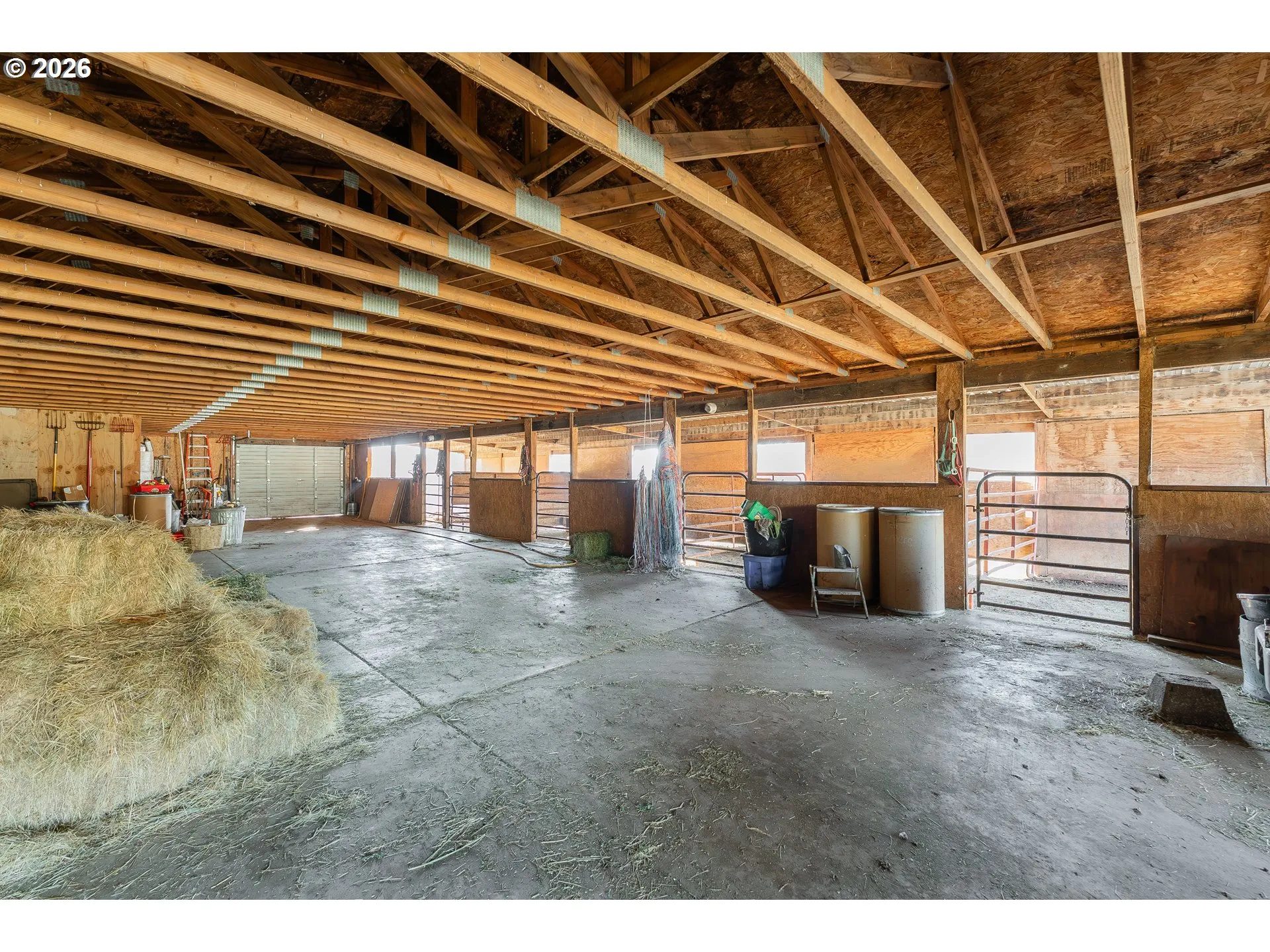 Cattle ranch, horse property, or vineyard — your dreams can become your reality at this beautiful estate. Welcome to this stunning custom two-story home, where panoramic valley views, timeless craftsmanship, and open spaces come together to create something truly special. Soaring vaulted ceilings, walls of windows, and rich wood finishes fill the home with warmth and natural light. Designed for seamless indoor-outdoor living, the property features a wraparound porch, an additional deck with a hot tub, and nearly 40 acres of fenced pastures. Inside, the spacious primary suite includes a walk-in closet, ensuite bath, and breathtaking views, while the kitchen offers stainless steel appliances and a walk-in pantry. The daylight basement provides a large family room and additional bedrooms, and the home includes ADA-accessible doorways and a walk-in shower. An oversized two-car garage, gated asphalt driveway, and white cedar log siding add both function and curb appeal. Outbuildings include a 30’x54’ shop with loft, a 3-bay tractor shed, and a 30’x72’ eight-stall barn with tack room. Additional amenities include dog kennels, a 65’x155’ outdoor arena, chicken coop, RV hookups, and a year-round pond. Nestled just minutes from Roseburg or Winston, this property offers the perfect blend of convenience and country living. Enjoy the peace and quiet of nature with abundant wildlife, open skies, and a true rural feel — all within easy reach of town amenities.