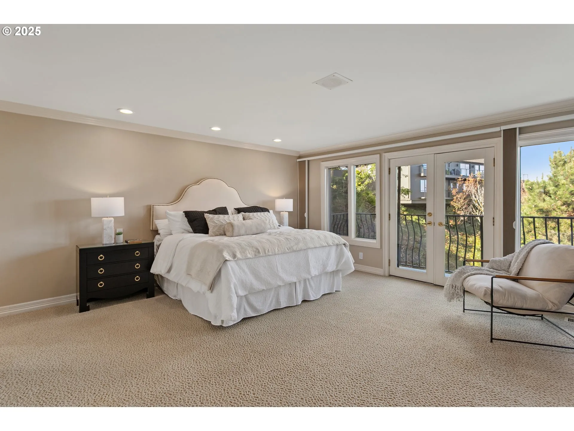 Amazing price for Portland Heights! Breathtaking unobstructed views & unparalleled gated privacy await. Experience luxury living at its finest in this beautiful Portland Heights home. Perched high above the city, this exceptional residence boasts panoramic views of the city, river, and mountains—creating an awe-inspiring backdrop to your everyday life. Step into the stately foyer, where a dramatic wall of windows immediately captivates, seamlessly blending indoor elegance with the beauty of nature. Designed for effortless living and exceptional entertaining, the open-concept main level features hardwood floors that flow through the sophisticated living, dining, and kitchen areas. The living room is a masterpiece of comfort, complete with built-ins, a gas fireplace, and access to the expansive wraparound deck—perfect for sunset toasts or morning tranquility. The formal dining area is as grand as your imagination, offering a setting for intimate dinners or large gatherings. At the heart of the home, a newly renovated chef’s kitchen dazzles with classic white cabinetry, gleaming quartz countertops, a stunning wall of counter-to-ceiling tiles, and automated blinds. High-end appliances, including a Wolf cooktop, double ovens, and a Subzero refrigerator, elevate the culinary experience, while the dry bar and sunlit nook provide the perfect finishing touches. The main-floor primary suite is a retreat with deck access, a warm fireplace, and abundant closets. The en-suite bath features dual vanities, a walk-in shower, a discreet laundry area for ultimate convenience, and more closets. A stylish half bath completes the main level. The lower level is a haven of its own, with a spacious family room with a fireplace and opening to covered decks for year-round enjoyment, an en-suite bedroom with a fireplace, a third bedroom, a full bath, plus a large laundry room and extensive storage space. [Home Energy Score = 1. HES Report at https://rpt.greenbuildingregistry.com/hes/OR10221292]