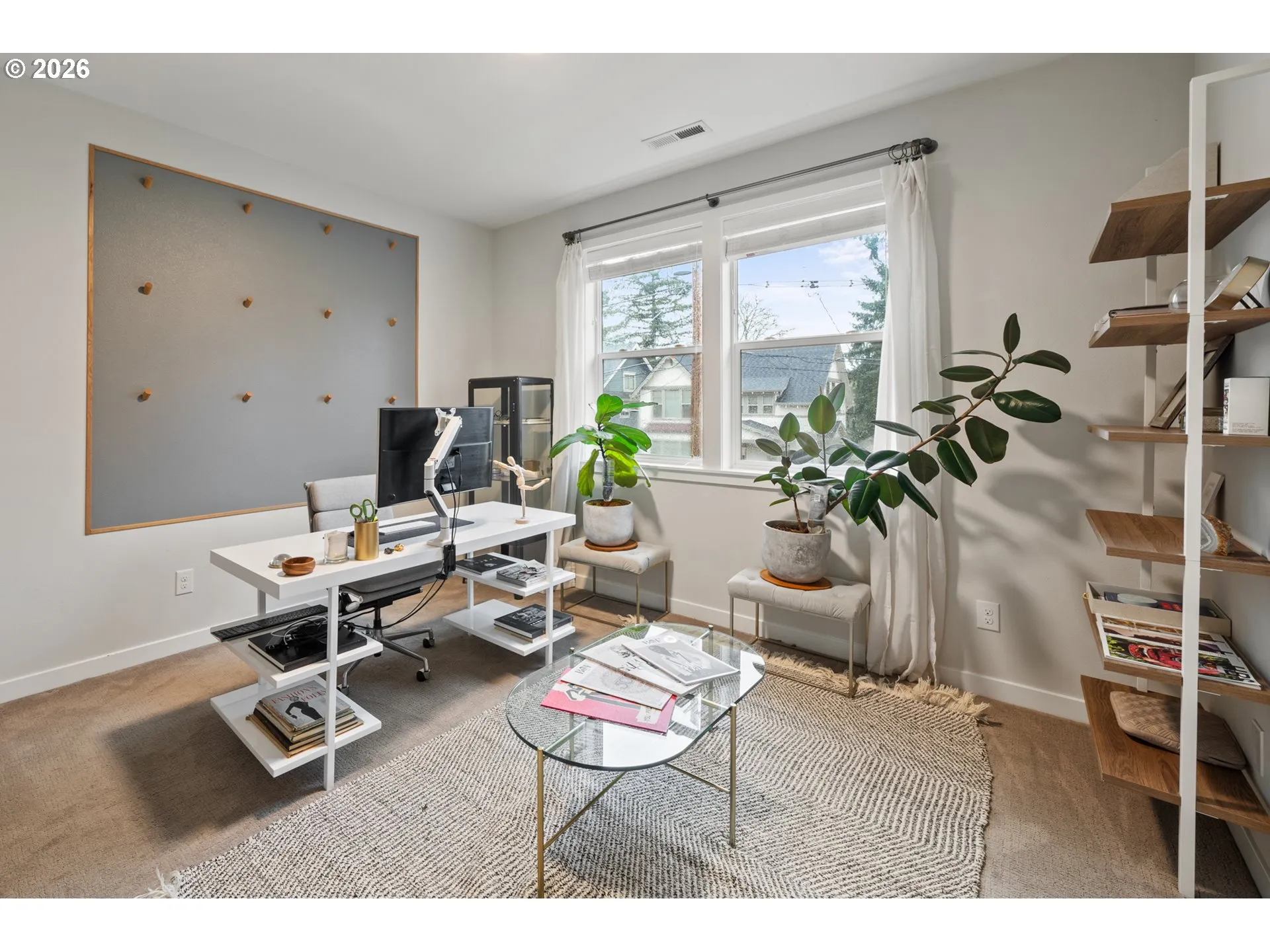 Discover a modern retreat near the heart of Multnomah Village! Located on a quiet street, this home blends contemporary style with everyday convenience. Entering from the wood front porch, you’re greeted by a light-filled, open-concept main floor. The living area features a gas fireplace accented by chic shiplap and flows effortlessly into the dining space. Entertaining is a breeze with custom built-ins, bar area with wine fridge, and stainless steel appliances. A dedicated main-level office provides quiet space to work and additional versatility. Upstairs, the primary suite offers a soaking tub, walk-in shower, and walk-in closet with custom organization, while three additional bedrooms complete the upper level. The standout feature is the indoor-outdoor flex space. Currently used as a home gym, this converted garage features folding glass doors that open directly to a paver patio and fully fenced backyard where you can relax and enjoy the upcoming PNW summer evenings. With local staples like Yalla, Maplewood Coffee, and Gabriel Park nearby, this home offers an ideal Pacific Northwest lifestyle.