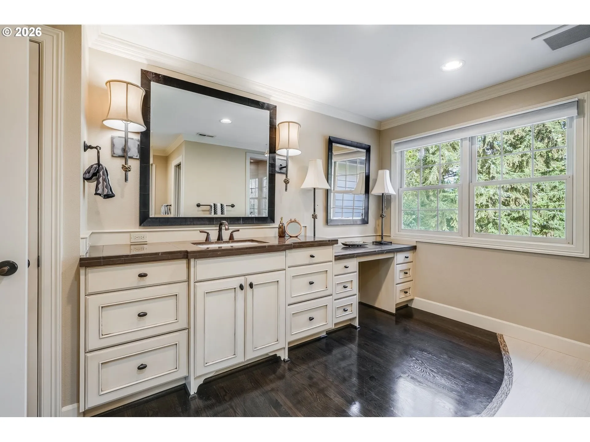 Gorgeous Dunthorpe Colonial offering timeless elegance, generous living spaces, and the peaceful setting you would expect in one of the area’s most coveted neighborhoods. As you enter the home, you are welcomed by a stunning staircase and beautiful hardwood floors throughout the main level, along with classic architectural details that immediately set the tone for the home’s refined style. The main level features both a formal living room and a comfortable family room, each anchored by fireplaces that create warm and inviting gathering spaces. Designed for both everyday living and entertaining, the spacious kitchen features a large island, wine cooler, large pantry, and abundant workspace. A charming breakfast nook just off the kitchen provides the perfect spot for casual dining and morning coffee while enjoying views of the surrounding greenery. The kitchen flows seamlessly into the main living areas, making it ideal for gatherings and everyday living. Just off the living space, a large deck overlooks a beautiful backdrop of mature trees, offering privacy and a serene setting for outdoor dining or relaxing. The home offers four bedrooms and four bathrooms, including a primary ensuite and an additional ensuite bedroom, providing comfort and privacy for family or guests. Two dedicated home offices offer flexibility for remote work or creative space, with one office featuring its own covered deck, creating a peaceful retreat surrounded by nature. A three-car garage provides ample parking and storage. Situated on a quiet street within the highly regarded Riverdale School District, this home blends classic colonial architecture, functional living spaces, and a prime Dunthorpe location.