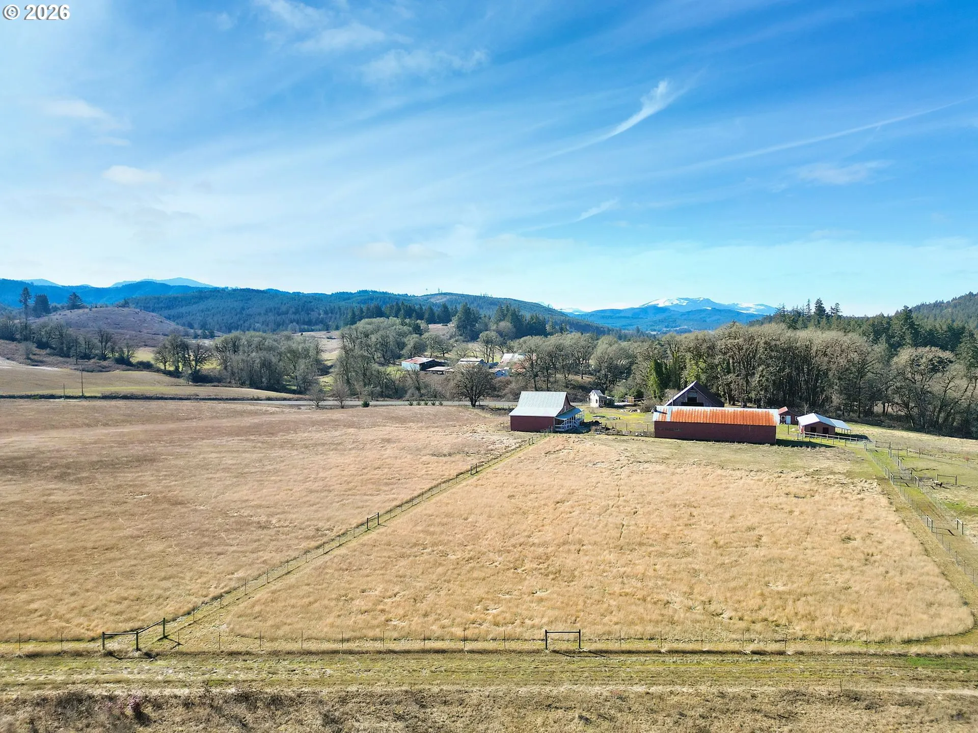 Stunning 325-acre property with sweeping valley views & a natural spring. Live in the remodeled 1,500 sqft home while building your dream home on the second site using existing plans or creating your own. 2 wells on-site with available Red Prairie water hookup. First home includes a fully finished basement with separate access, dog washing station, & 1-car garage. Each home site has its own driveway. Outbuildings: farm stand-ready barn, animal pen barn, shed/horse barn, hay barn, & chicken coop—all with power. Previous Polk County approval for distillery/tasting room. Income potential: Airbnb, farm stand, livestock, ag lease, or equestrian development. Conservation easement on approx 183 acres, apple, pear, & cherry trees, blueberries, grapes, raised garden beds with irrigation. Property eligible for two Bull Elk Tags (8 month hunt) through ODFW Lop Program—an elk hunter’s dream! Priced below appraised value. Appraisal completed on 7/11/25 at $2,055,000.