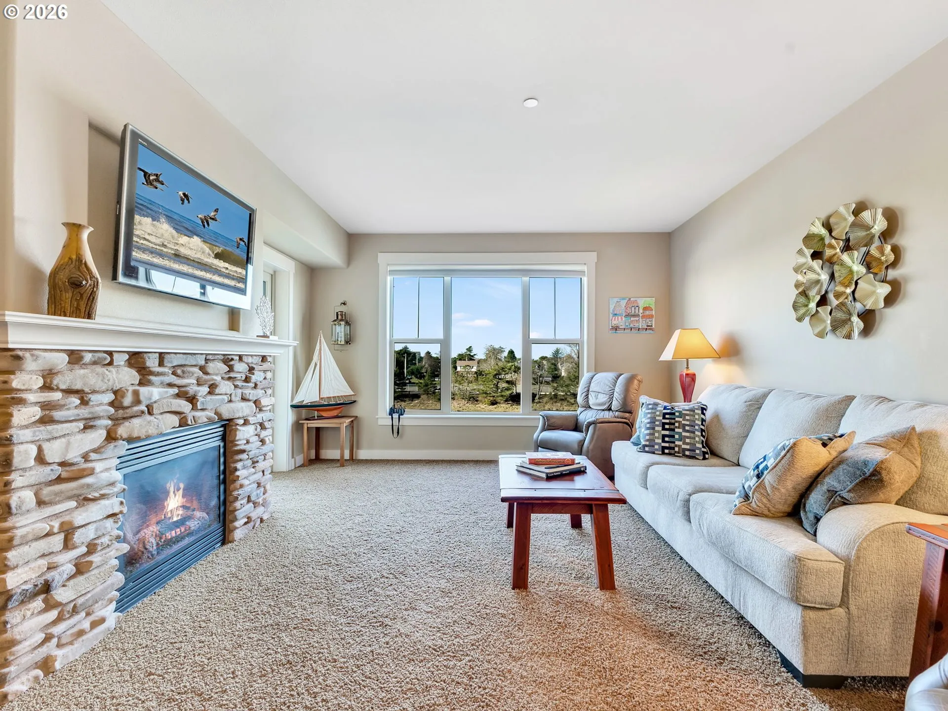 VIEWS, VIEWS, VIEWS. Perched on the 3rd floor, this stylish condo comes furnished, subject to exclusions, and delivers stunning views from nearly every room and is just a few blocks from downtown Seaside and the Promenade. The open floor plan features a cozy gas fireplace and a stylish kitchen with quartz countertops, under-cabinet lighting, stainless steel appliances, and a raised bar.The primary suite is a true retreat with an oversized walk-in closet, jetted tub, and sliding glass door to a large deck. A guest room with a twin-over-double bunk bed and a second full bath add flexibility. Extras include attached storage, two designated parking spaces, and a well-equipped complex with an elevator, workout room, and community room—plus potential for short-term rental use.