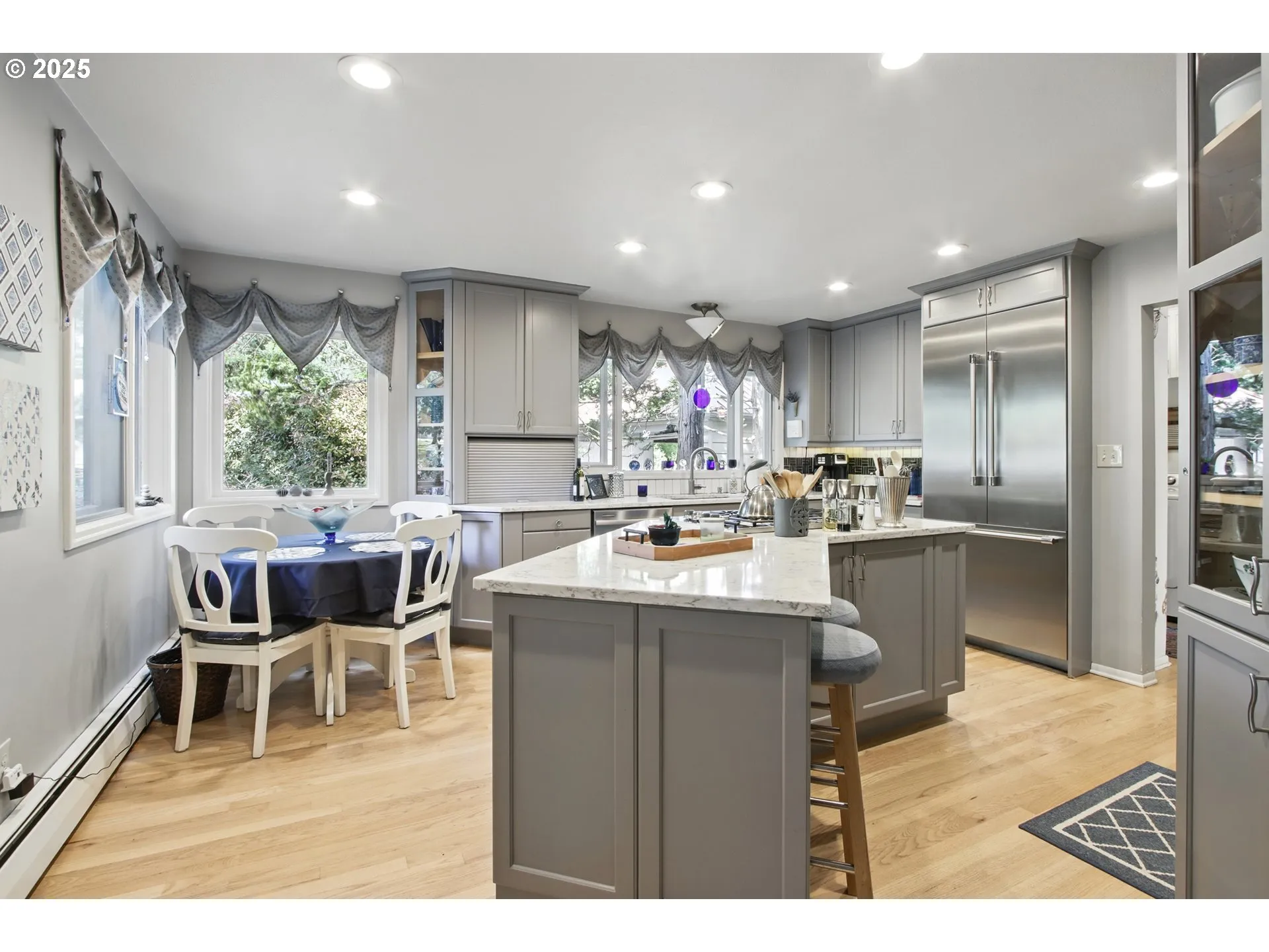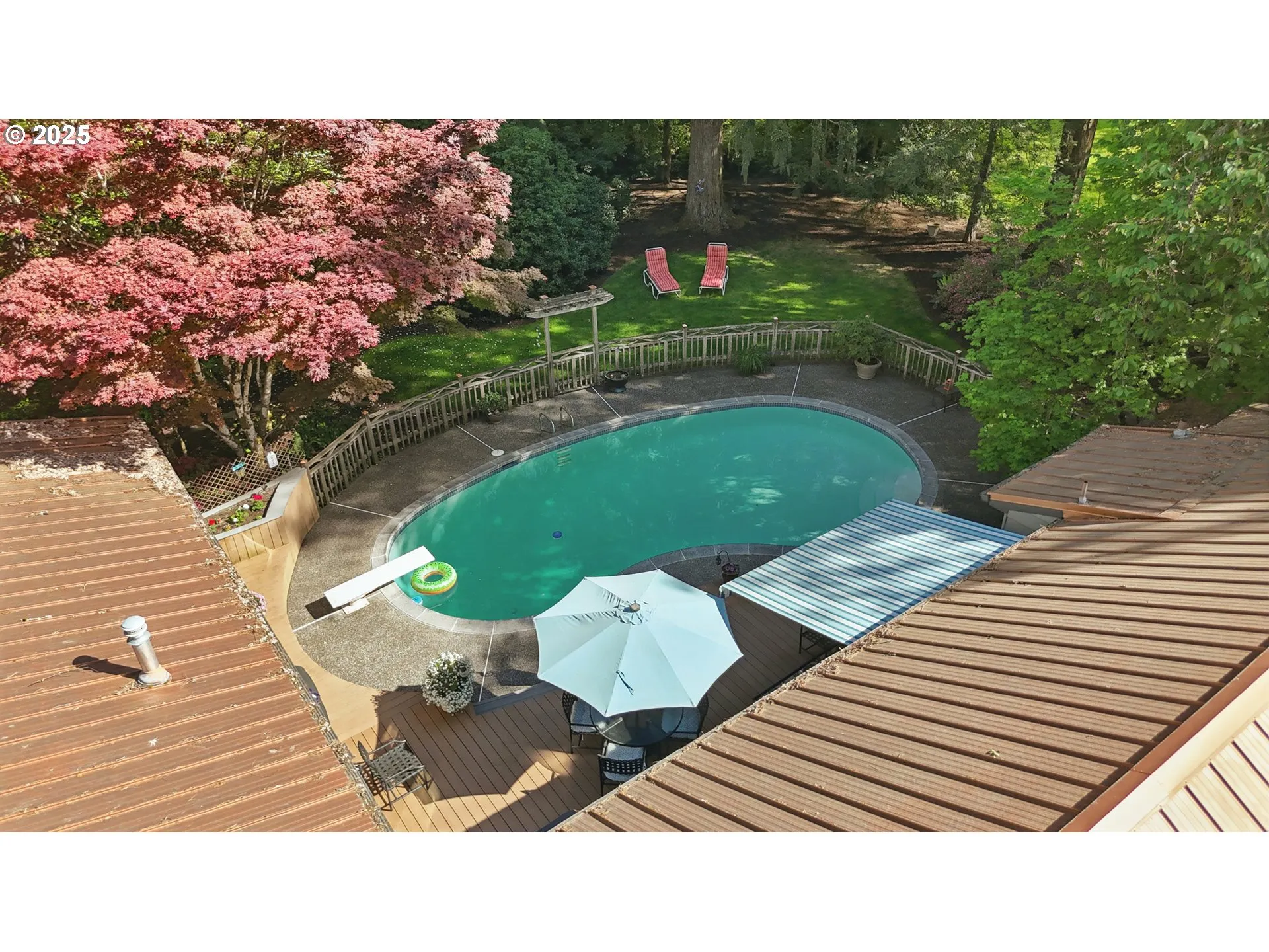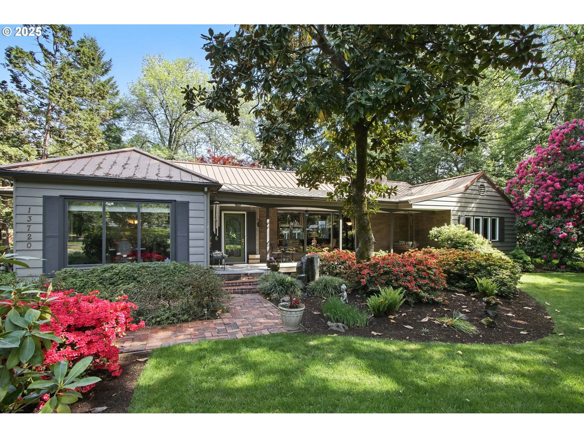 MID CENTURY MODERN ESTATE! FRESH INTERIOR PAINT! An entertainers delight with plenty of original mod charm. One of a kind single level, designed and built in 1944 by Jerome Margulis, this gorgeous 4Bed/2Ba plus Den, estate home on a meticulously cared for .79 acre lot. Dual gas fireplaces and built-ins with vintage glass to display all your heirlooms. This beautiful home has been upgraded and enjoys forest, creek, and park views throughout. Setback from Murray, the privacy is unmatched, as living is easterly with several century old Douglas Fir trees for plenty of shade. Original refinished narrow slat cherry hardwoods, updated kitchen with a brand new built in fridge and modern primary bathroom. On nearly an acre with an ample wrap around Trex deck, remote shade awning, NEWER hot tub and in-ground pool resurfaced in 2020 and new pump last year. Plenty of off street parking. Detached garage with storage room/shop and built in cabinets. Fire station on the private drive obeys strict noise laws and engines/lights are not allowed to siren until well onto Murray. Top rated schools, close to Nike, Intel and major freeways, a true quiet and peaceful urban oasis! The in-district brand new Beaverton High School is a bonus!