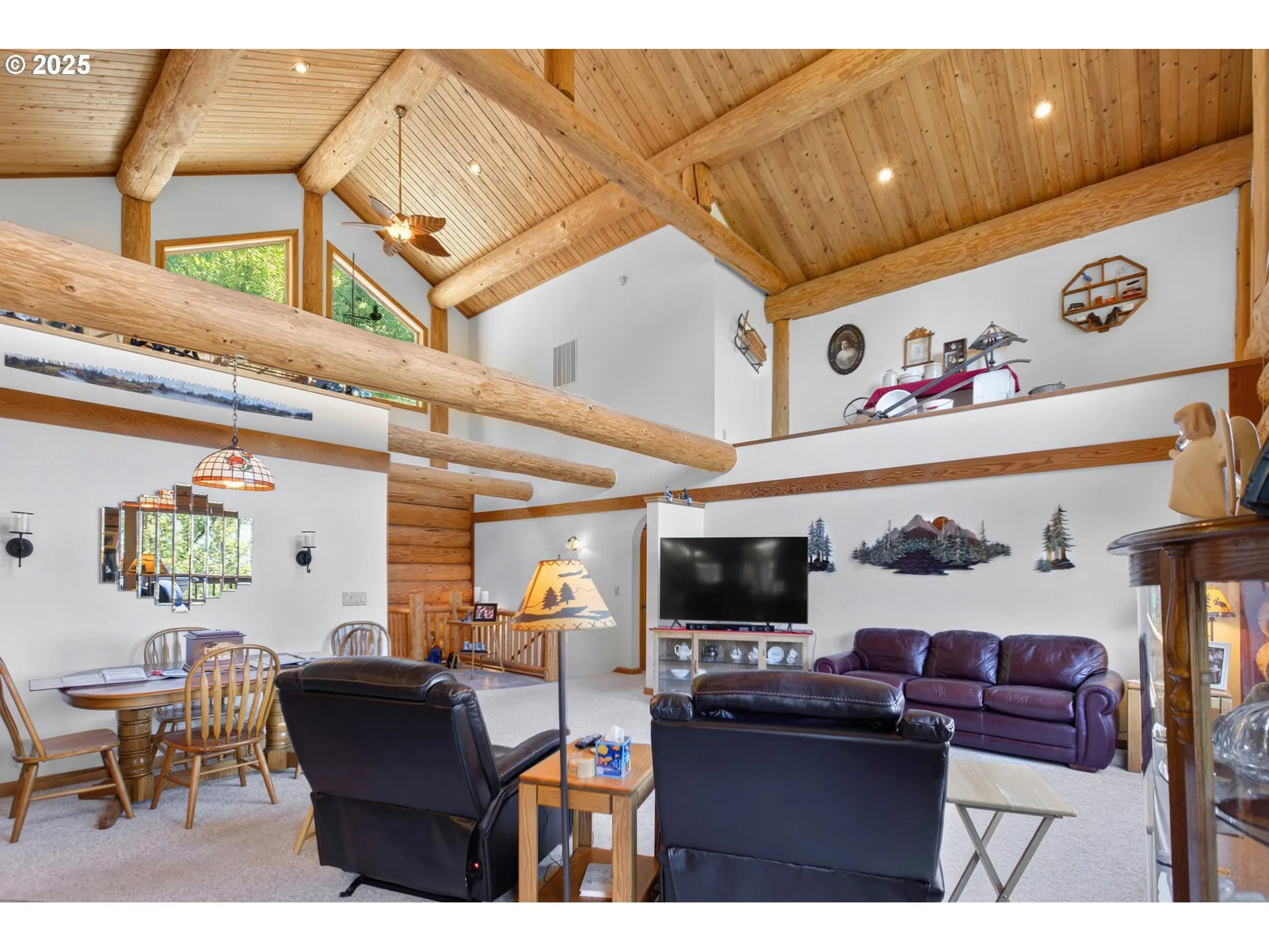 2004 log home estate at the top of your own private forested hillside just minutes from town. Enjoy views of the valley, river, city & Fern Ridge in the distance from the nearly 2000 sq ft of decking. The logs used to construct the home were harvested and milled on site. The gated private road has recently been resurfaced and comfortably ascends to the home perched high on the hill. The homesite itself is level featuring the 3564 sq ft home, ample parking, yard space, three bay garage/shop and room for additional building opportunities. Entering the home you immediately sense you’ve entered a lodge. You are greeted with a great room design featuring a grand two-story vaulted ceiling and floor to ceiling windows. The entertainer’s kitchen is expansive with a large center island, abundant cabinetry, a sink with a view, and more. Additionally, there is a second bedroom/den on the main.Downstairs a huge family room with high ceilings features a gorgeous bar hewn from the estate’s timber. A gaming area comfortably accommodates a pool table. A full bathroom & spacious guest room are located on the south side with two bonus rooms, currently used as storage, on the east side. Outside a covered outdoor cooking & dining area taking full advantage of the view is in addition to the house’s two-story decking. Downstairs enjoys full views and deck access as well.The garage shop is a car enthusiasts dream with plenty of room for multiple vehicles, extensive shop area and storage above. It features an additional car port for equipment storage as well. Note that this home borders but is not part of the Sky High Ranch HOA although there may be an opportunity to join if you wish. Please see the floor plans, website and video for more details. This home is not a drive by and appointments are required to enter the grounds. Call your favorite real estate broker and schedule your private viewing today.