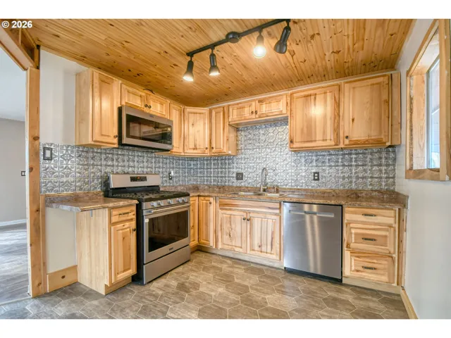 Large corner lot in Pilot Rock with updated home. Located on private .18-acre lot. This modern farmhouse style home is the perfect blend of rustic and chic with natural wood and western flare. Bright kitchen with hickory cabinets, tin back splash, built-in microwave, dishwasher and gas range. Large bedrooms and updated bathroom. Easy access to additional space in the attic. Economical gas furnace and gas hot water heater. The basement bonus room with exterior entrance adds additional 250sf. Step outside to your private, fenced backyard oasis. Enjoy year-round grilling on your covered patio with a convenient, plumbed-in gas line. Cozy fire pit and easy to maintain landscaping with underground sprinkles, raised garden beds and a potting bench. Beautiful privacy fence with double gate access to the backyard. Expansive parking for all your vehicles and toys. Need a shop/garage? Plenty of room to build one. Not in the flood plain. This perfectly located home can be yours today.