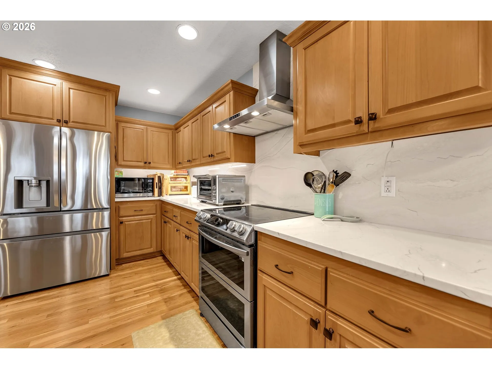 Beautiful 5 bedroom home in highly sought after Binford Heights, a premier residential neighborhood in Southwest Gresham known for its elevated setting. Perfectly positioned on a .16 acre lot, this home captures stunning views while delivering a thoughtfully updated interior. The gourmet kitchen features stainless steel appliances, quartz countertops, double ovens with induction feature, under cabinet lighting, and a generous pantry. The open concept layout flows seamlessly to the dining area with a slider to the deck…ideal for entertaining. The main level offers the primary suite with deck access, an office and a 2nd bedroom plus dining room with deck access. Living room with gas fireplace and 3 ceiling fans in the home as well as custom wood blinds. While the lower level includes three more bedrooms, full bathroom, a large family room with slider access to the patio, and abundant storage. Step outside to your private backyard oasis featuring covered patio space, expansive covered deck with views, fully fenced yard, and a relaxing fire pit area, perfect for year round enjoyment. Brand new roof put on in December of 2025.