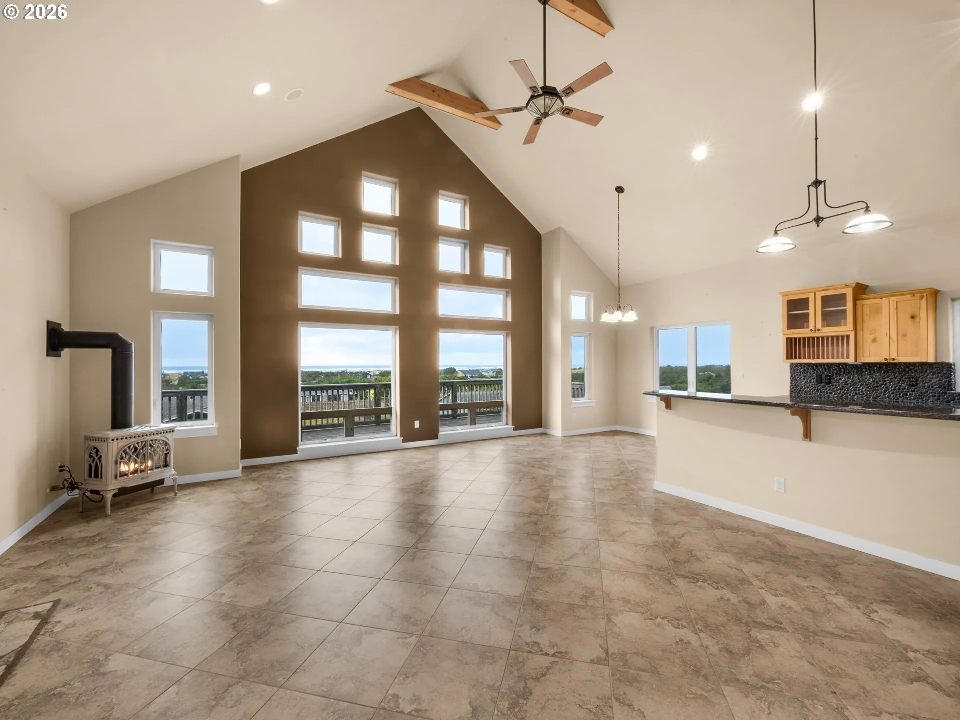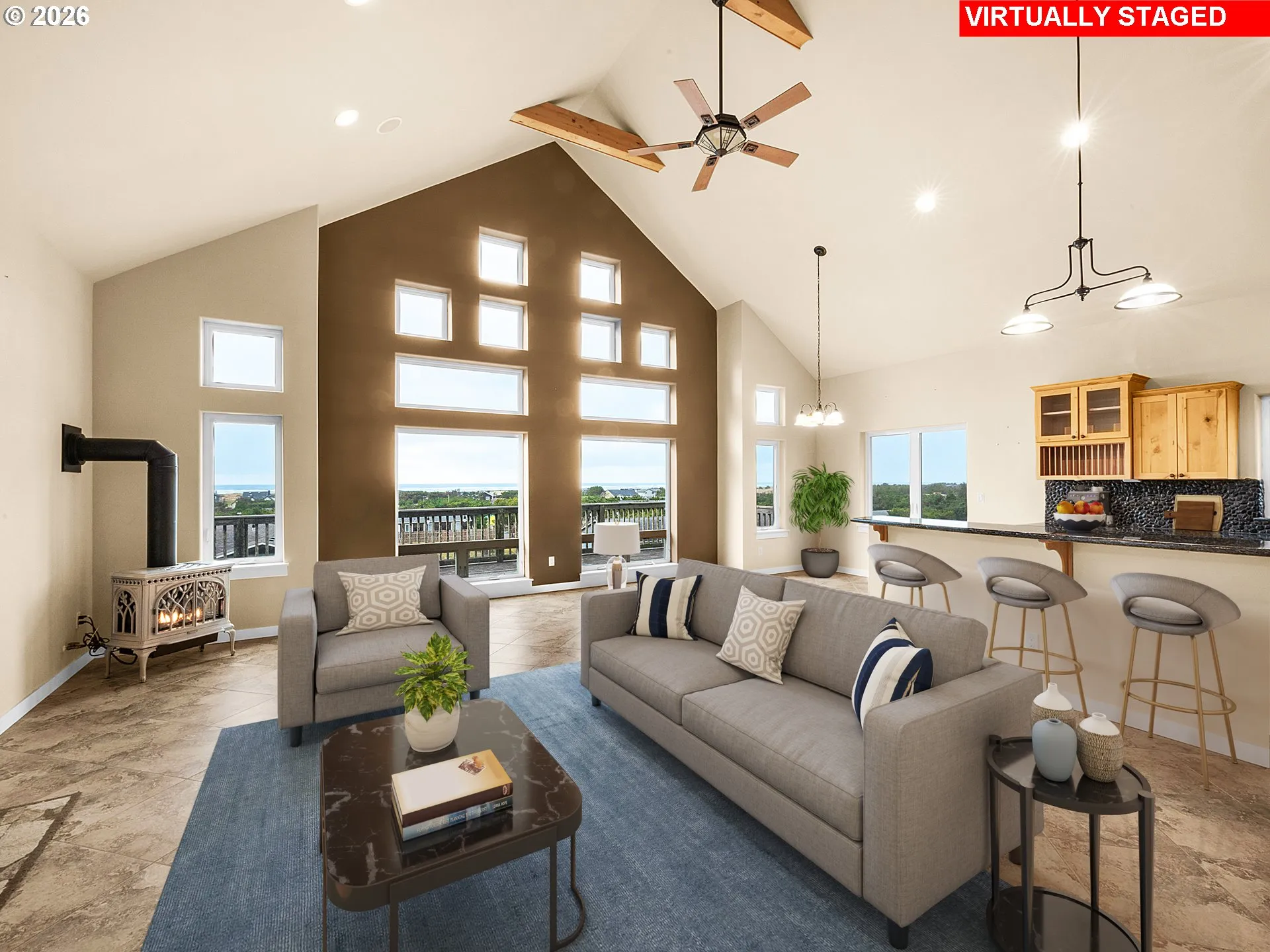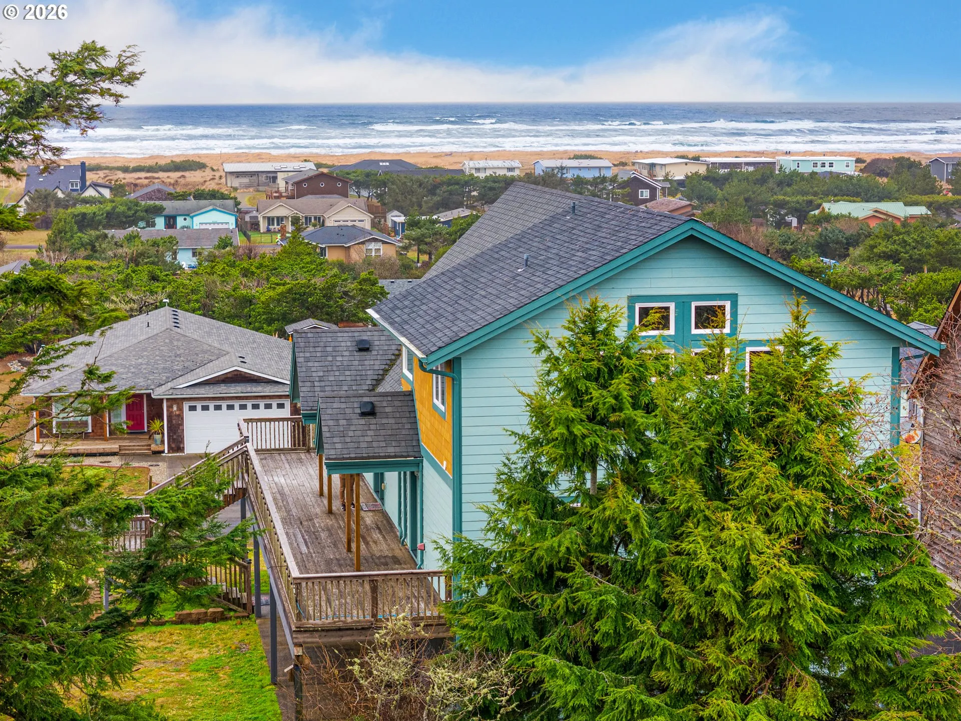 Enjoy OCEAN VIEWS across the ENTIRE front of this immaculate custom-built home! Soaring vaulted ceilings and a loft-style primary with ensuite (heated bathroom floors!)make this home uniquely special. The den/office/media room has surround sound, but could also be a great guest room (non conforming- no closet, but seller has an estimate in place for basic closet install if desired). There are built-in speakers inside & out for year-round entertaining. The kitchen is a dream w/ stainless steel appliances, LP Gas Stove, granite countertops, knotty alder cabinets, EZ-close drawers, pantry, and lazy-susan style corner cabinet. Home has high efficiency Convectair all-digital heating system and is wired for a security system. In addition, home has upgraded HD9 structure. The 4-car garage actually has room for 4 cars, in addition to a “shop” area, & 1/2 bath. Washer, dryer and small generator in garage stay. Seller is offering concession specifically toward deck (with strong offer), but is willing to consider all offers!