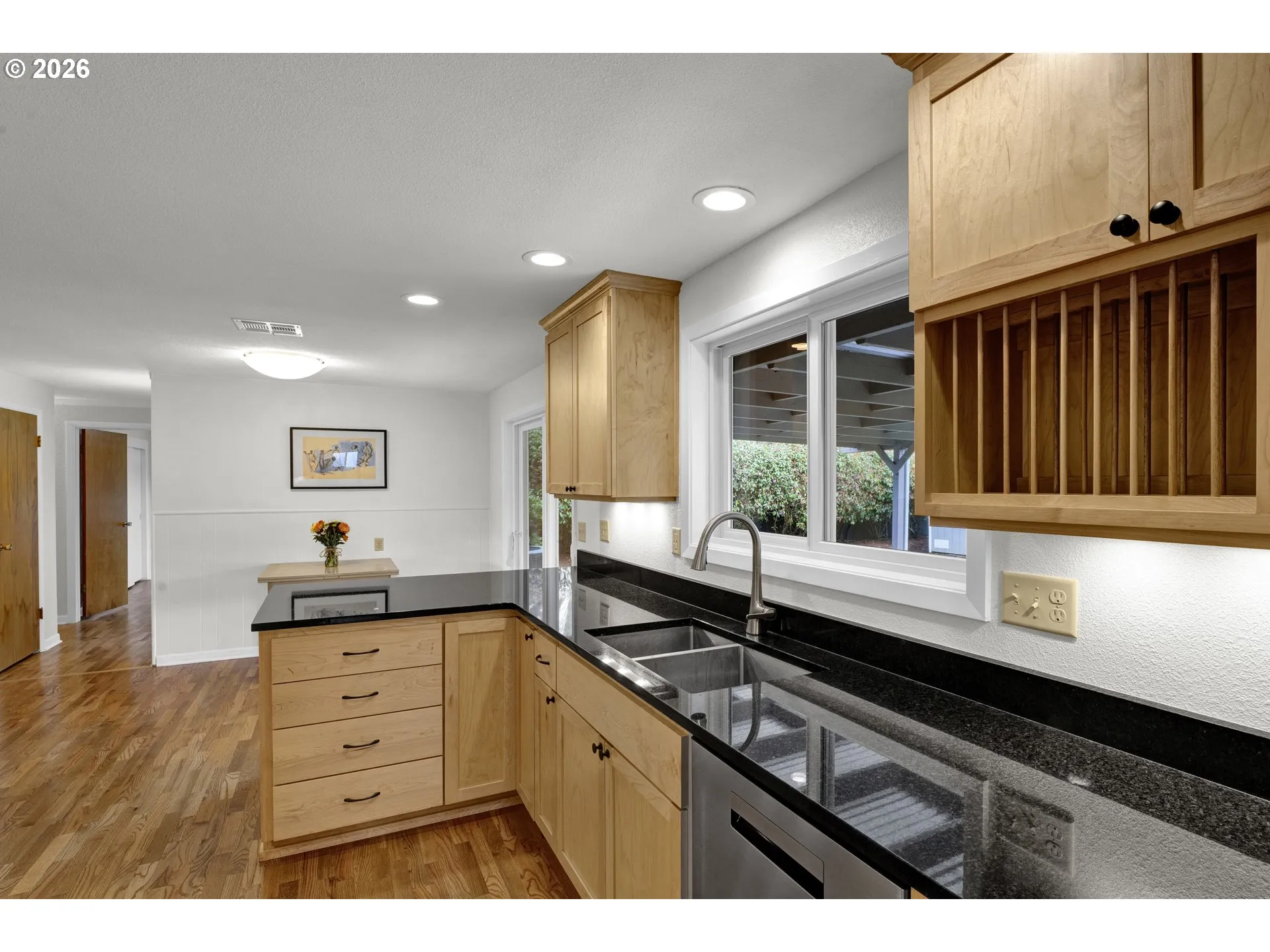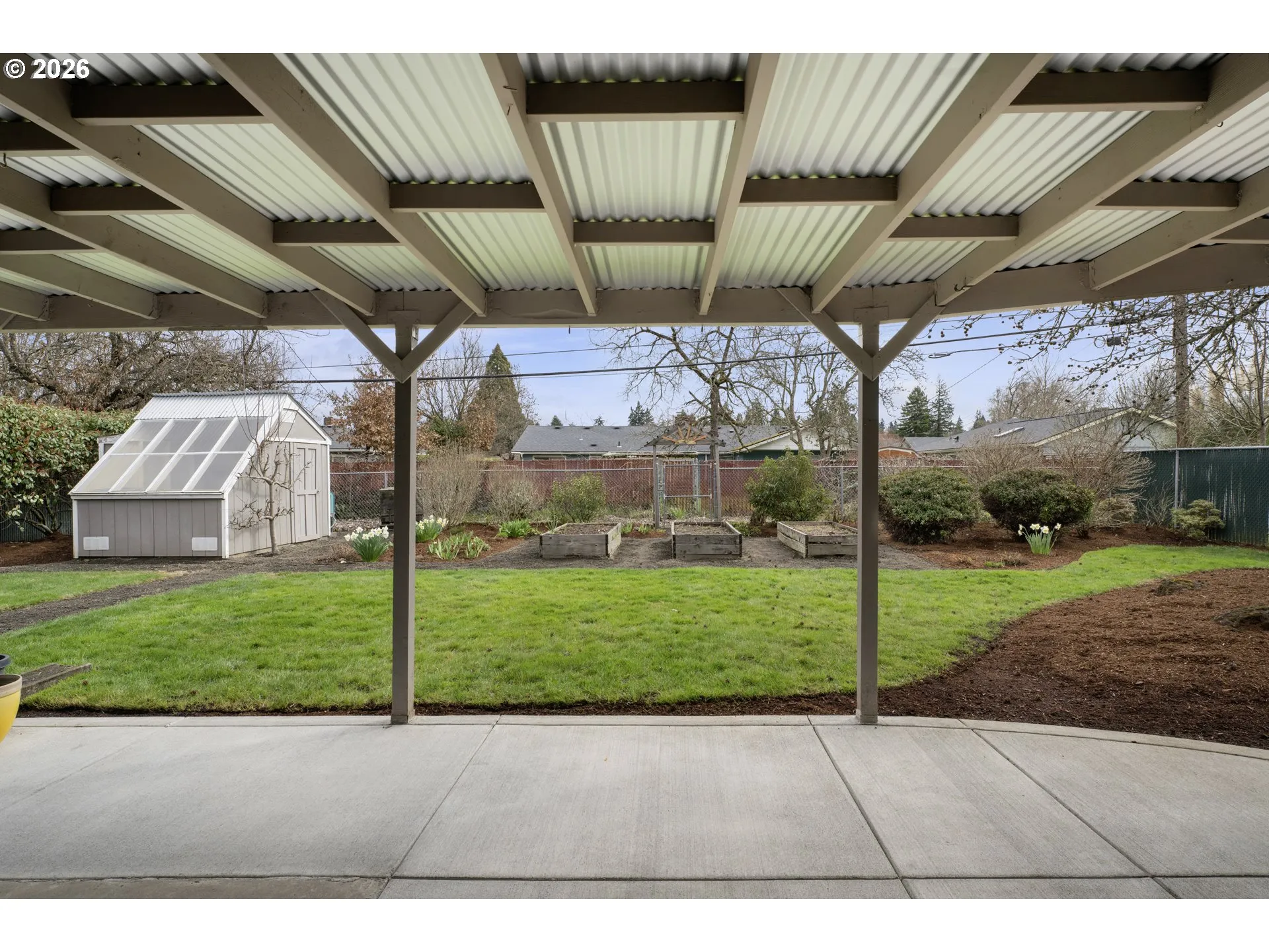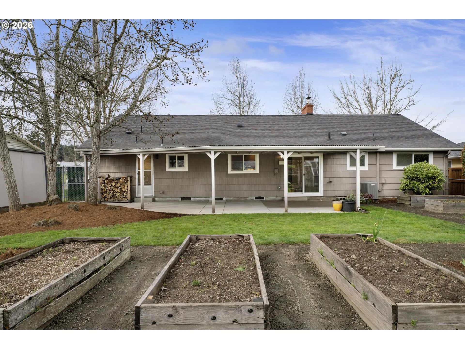 Charming 1961 home in a wonderful neighborhood, centrally located near parks, schools, shopping, and a neighborhood pickleball court. The spacious living room features beautiful wood floors, wood stove insert, and a bright picture window—perfect for entertaining or relaxing.The updated kitchen includes granite countertops, soft-close drawers, stainless steel appliances, recessed and under-cabinet lighting. Freshly renovated bathrooms add a modern touch, while the versatile upstairs space can serve as a fourth bedroom, bonus room, or home office.Energy-efficient updates include vinyl windows, a Lennox forced-air heat and A/C system.Enjoy the professionally maintained yard with mature landscaping, an underground sprinkler system, covered patio, raised garden beds, and greenhouse. Pre-listing inspection on file with repairs completed.