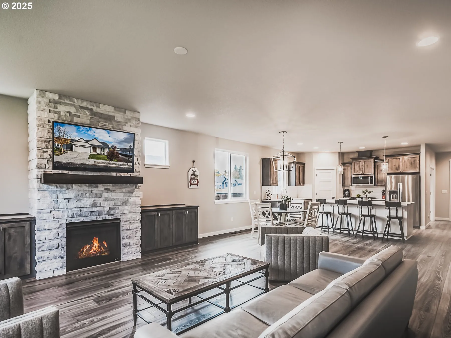 Welcome to your dream home in Ridgefield!Built in 2020, this beautifully maintained residence offers desirable main-level living on a private corner lot. The open-concept floor plan showcases 9-foot ceilings, abundant natural light, and stylish modern finishes throughout.Enjoy a spacious great room with a cozy gas fireplace, perfect for relaxing or entertaining. The gourmet kitchen features an oversized island with quartz countertops, Energy Star stainless steel appliances, knotty alder cabinetry, brushed nickel hardware, and a convenient pantry — ideal for any home chef.The primary suite, located on the main floor, overlooks the peaceful backyard and includes a luxurious spa-inspired bath with a soaking tub and walk-in closet. You’ll also find a versatile den on the main level, perfect for a home office or guest space.Energy-efficient features include Energy Star HVAC and appliances, ensuring comfort and cost savings year-round.Located in an exceptionally quiet neighborhood, residents enjoy access to community parks and scenic walking trails that connect directly to downtown Ridgefield — combining the best of nature, convenience, and modern living.