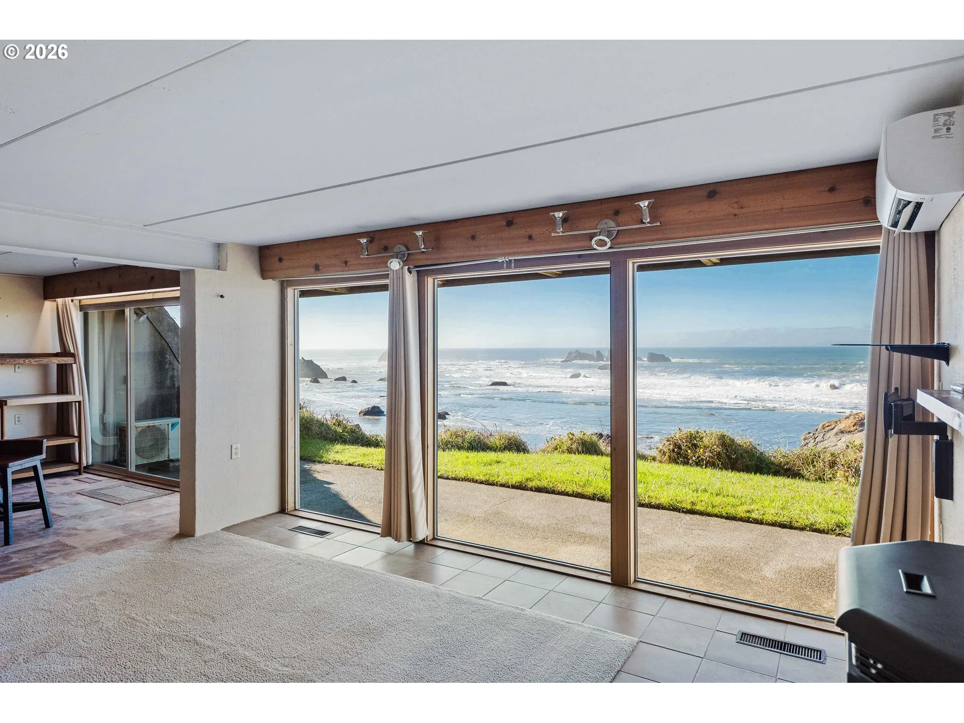Oceanfront on Beach Loop in Bandon with commanding views of Coquille Point, Elephant Rock, and Face Rock—a front-row seat for sunsets and storm watching. Built in 1974, this coastal contemporary offers a daylight-basement / reverse-plan layout with a street-level garage and a separate laundry room (both with ocean-facing windows) and the main living spaces and bedrooms on the ocean-facing lower level. The living room features a fireplace with a pellet stove insert, and ocean-side windows and sliders keep the shoreline center stage year-round. Brand new roof (2024). Concrete lower-level construction provides a solid footprint. Convenient to Old Town Bandon shops and restaurants, the city park, library, and Bandon schools, plus an easy drive to Bandon Dunes Golf Resort and world-class golf. For buyers planning ahead, the street level offers potential to reimagine or expand—including the concept of building new above while retaining the existing concrete lower level, subject to buyer due diligence, engineering, and all required approvals/permits. A rare opportunity to own true oceanfront with iconic Bandon views.
