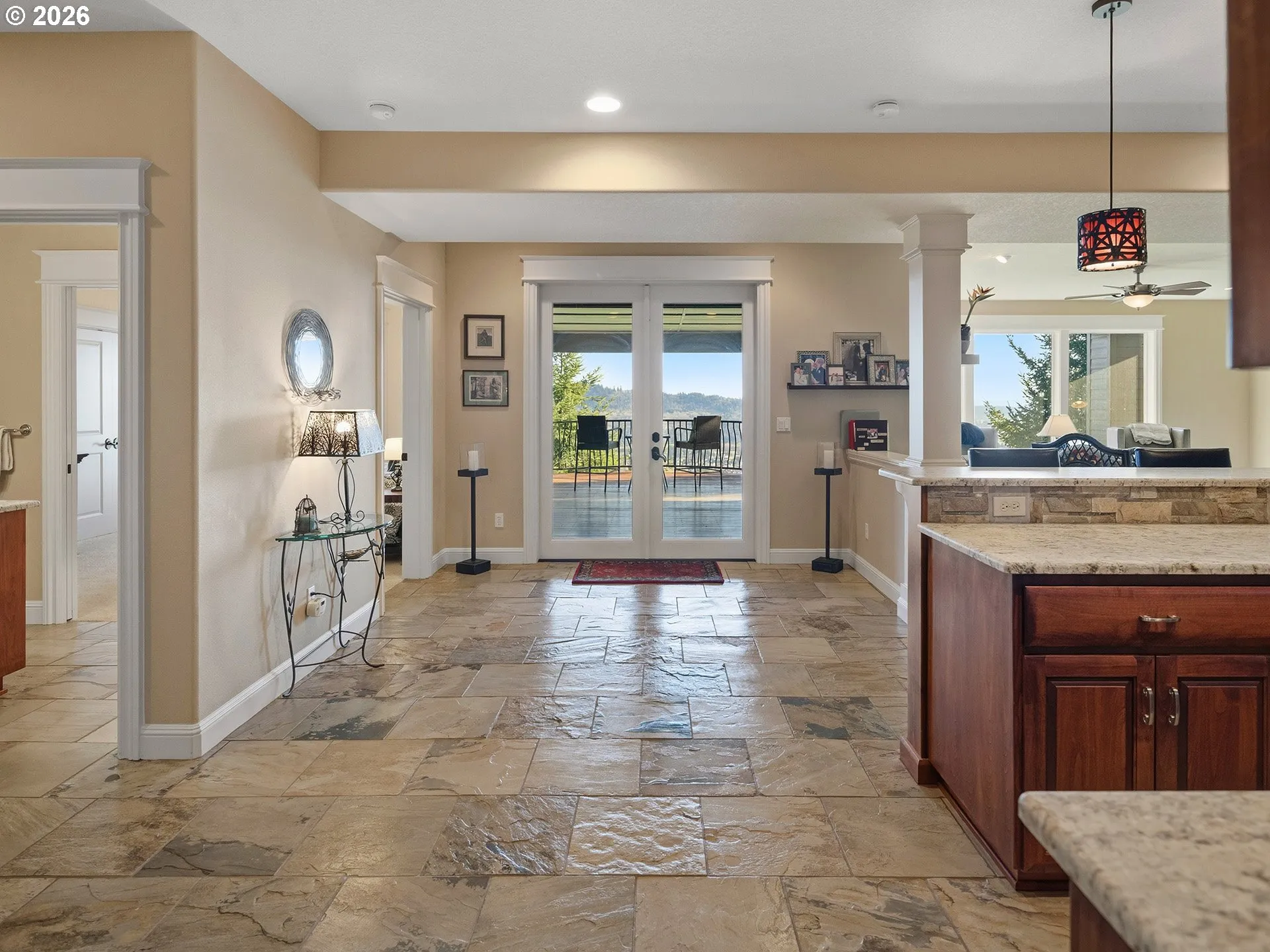 Perched to capture sweeping views from nearly every room, this stunning custom residence delivers an exceptional blend of craftsmanship, and serenity. A grand entry welcomes you with soaring ceilings and luxury hardwood floors that lead gracefully into an elegant formal dining area, perfectly sized for gatherings. The great room exudes warmth with a cozy gas fireplace wrapped in custom granite, crown molding, and beautifully integrated built-ins that elevate the space. The kitchen is a true showpiece, offering double dishwashers, built-in oven, six-burner range with an additional oven, expansive island, massive walk-in pantry, and a wet bar designed for entertaining. The bar features two beverage refrigerators, glass-front cabinetry for display, and sink that doubles as an ice well. The main-level primary suite is a private retreat, anchored by a double-sided fireplace and framed by breathtaking views. The ensuite invites relaxation with a large temperature-controlled jetted tub, spacious walk-in shower, and refined finishes throughout. The daylight basement is an entertainer’s dream, featuring a state-of-the-art home theater, family room, kitchenette, and 3 additional bedrooms and ensuites. Direct access to the lower patio creates seamless indoor-outdoor living. The property is equally impressive outdoors, offering RV parking with hookups, and a massive five-car garage. The panoramic vistas stretch across PDX, Lewis River, and mountains. A must-see!