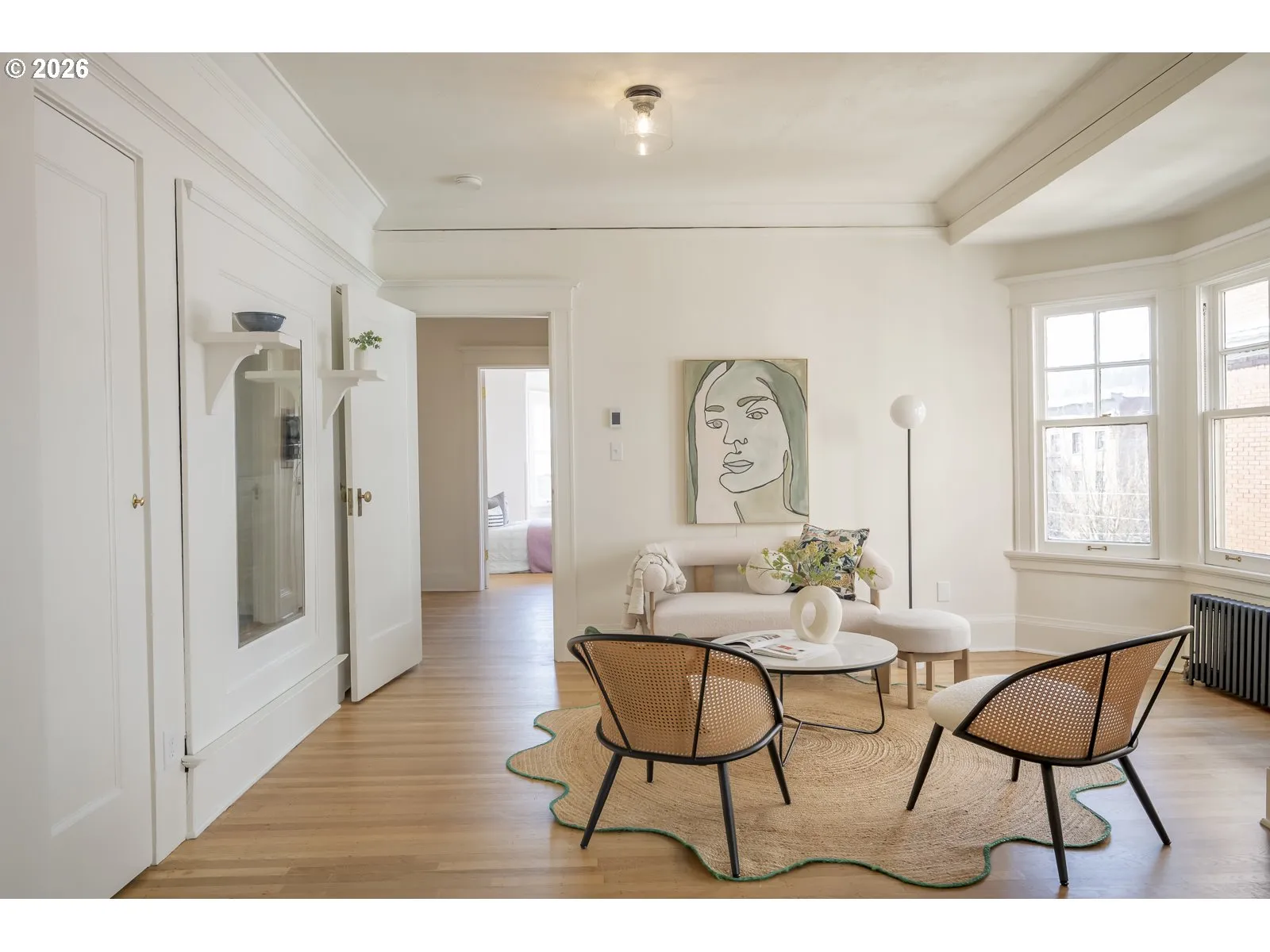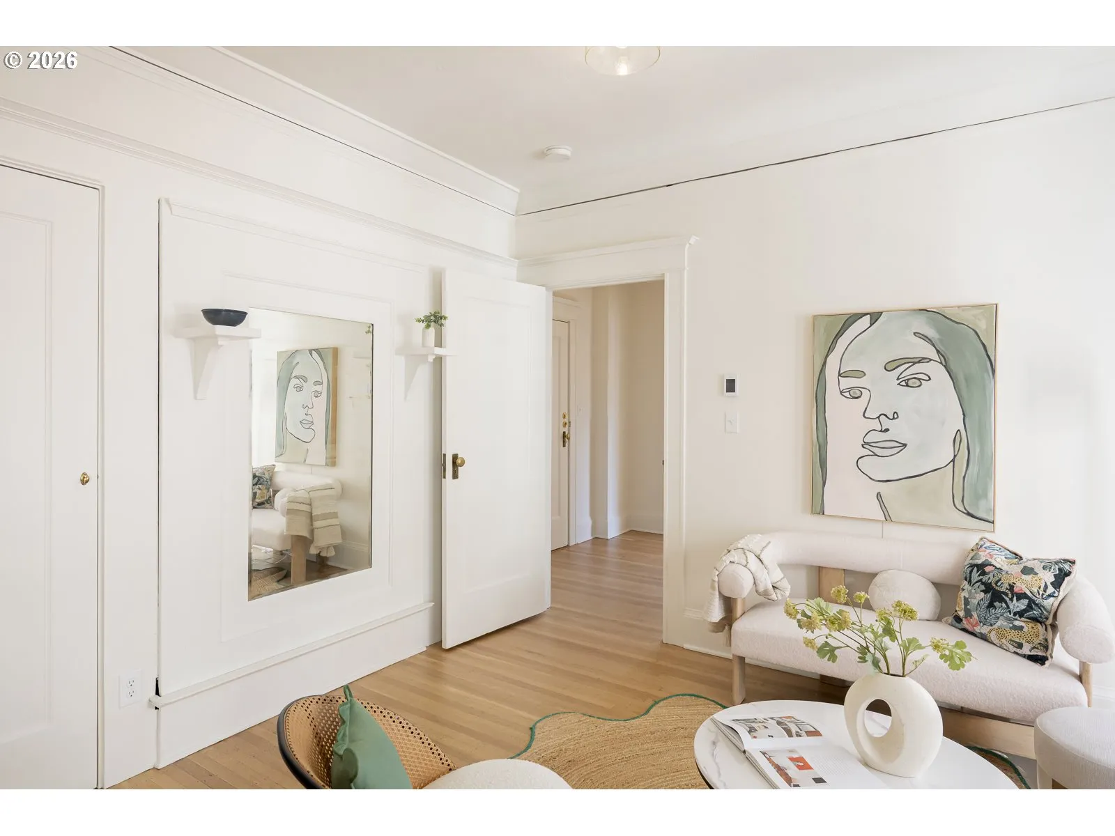 BEAUTIFULLY RENOVATED BALL PARC AMERICAN Welcome home to this exquisite city flat, complete with all the classic charm! This light-filled one-bedroom condo with bonus Murphy wall bed is complete with living and dining room, spacious kitchen, a parlor-style lobby, elevator, storage, laundry, a deeded parking spot, and updates throughout the unit. NEW PAINT, NEW TILE, REFINISHED HARDWOODS, NEW WALLPAPER, NEW LIGHTING, RESURFACED TUB, NEW DISHWASHER, and more complement this early 20th-century gem. Enjoy coffee on the balcony or look out to Mt. Hood from your large bedroom window! Need a nightcap? Walk in the park? Or want to catch a film? You’re in the heart of the Northwest District, where you can walk and bike to shops, cafes, wine bars, bakeries, restaurants, theaters, grocery, parks, and so much more. This Slabtown sensation has a 98 walk score and a 97 bike score, so you can get around the city with ease!