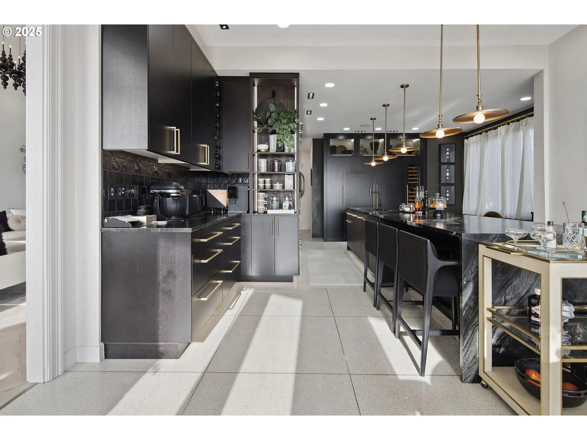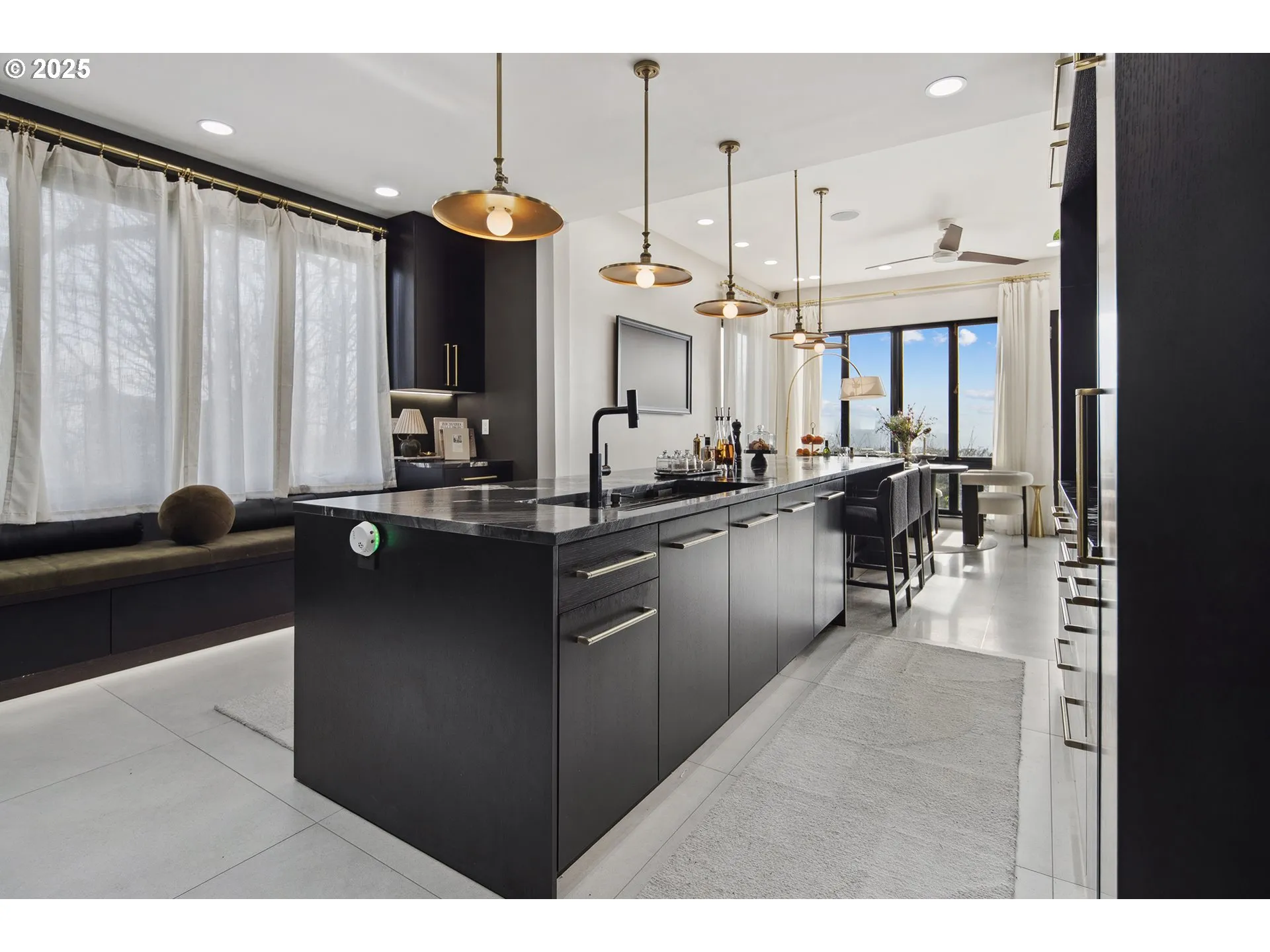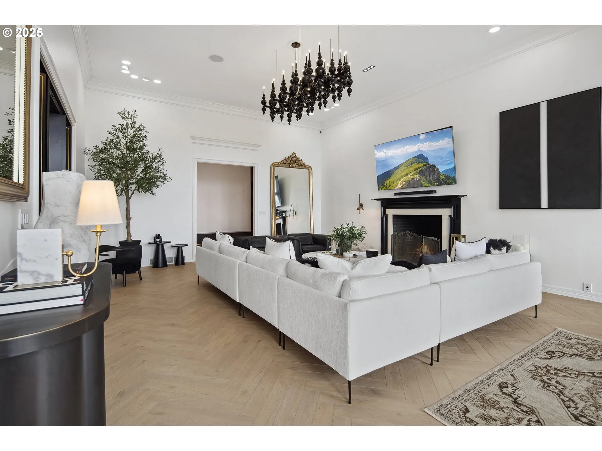 VIEWS! CONDO ALTERNATIVE! Poised above the city at the foot of the West Hills, this singular 1961 residence in Portland Heights commands rare panoramic views of Mount Hood and the downtown skyline. A dramatic renovation has preserved the home’s authentic mid-century modern architecture while introducing high-end finishes and modern amenities.A striking entry with a Chihuly-inspired custom skylight installation sets the tone for the home’s artful design. The main living spaces unfold primarily on one level, where floor-to-ceiling windows frame sweeping city vistas from nearly every room. 14-foot ceilings, pale chevron wood floors, and a wood burning fireplace in the great room evoke the elegance of a Paris apartment, while an adjacent den with a second fireplace provides the perfect setting for a nightcap.The kitchen is sleek and stylish, with black leathered granite countertops, an oversized island with prep sink, and premium appliances, including a full-height Sub-Zero wine refrigerator. A sun-drenched breakfast nook opens onto the home’s most distinctive feature – a stunning curved balcony with a firepit and breathtaking views of the mountains, river, and city, including the future South Waterfront MLB ballpark.The luxurious primary suite offers balcony access, distinctive porcelain tile flooring and accents, a freestanding soaking tub, and a spacious shower with rain showerhead. The expansive lower level, complete with a fireplace, serves as a blank canvas with flexible spaces ideal for guest quarters, media space, fitness area, game room, or storage.A compelling alternative to luxury condo living, the home is set on nearly half an acre at downtown’s western edge, with a low-maintenance yard. Off-street parking accommodates over eight vehicles, with covered parking for three. The property enjoys an enviable location between Washington Park and the city – minutes from Multnomah Athletic Club and downtown – a perfect blend of natural serenity and urban convenience.
