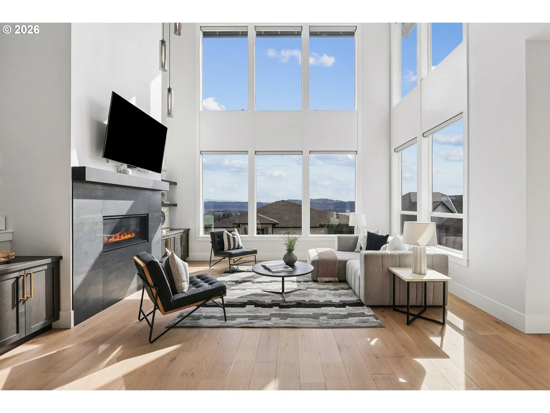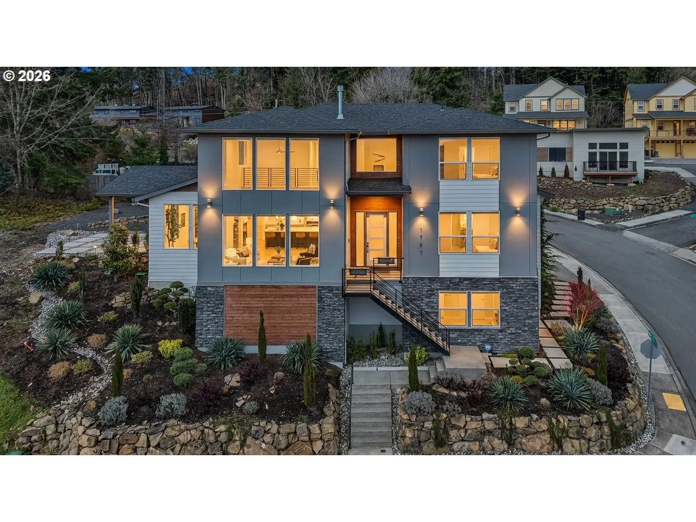 A beautifully built, better than new home oriented around panoramic views of the Columbia River. Set on a corner lot in a quiet Washougal neighborhood with a sense of space and privacy, this property offers the perfect blend of comfort, functionality and chic NW Contemporary design. A classy entry invites you in and flows into an open floor plan, ideal for both everyday living and easy entertaining. With soaring ceiling heights and windows filling every wall, you’ll love the incredible natural light and river views throughout this home. The gourmet chef’s kitchen anchors the home with custom cabinetry, high-end appliances and fixtures, a massive central island, a wet bar and a butlers’ pantry. The main level primary suite is a true oasis with a spacious ensuite bathroom that includes a luxurious soaking tub,a walk-in shower with dual showerheads and an oversized closet with custom cabinetry and dedicated laundry. The upper level boasts the best views in the home, as well as a junior suite with a stylish ensuite bathroom and two additional, nice sized rooms adjoined by the home’s third full bathroom. The outdoor space is ideal for enjoying year-round—with a covered patio, extensive hardscaping and Japanese inspired, professional landscape design. A low maintenance dream! A ready-to-be finished lower level with 10 ft ceilings offers endless flexibility for additional square footage. Recent high-end upgrades include premium auto window coverings, an impressive Haiku model ceiling fan and sleek modern light fixtures throughout the home. The multi-car garage includes an EV charger and offers ample storage space for vehicles, tools or toys. If you’re looking for stylish contemporary design, a highly functional floor plan and picturesque views in the growing community of Washougal, this home is it!