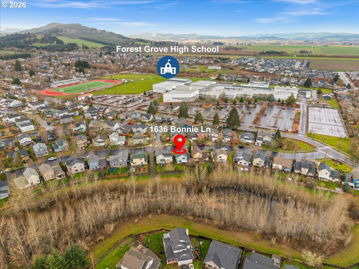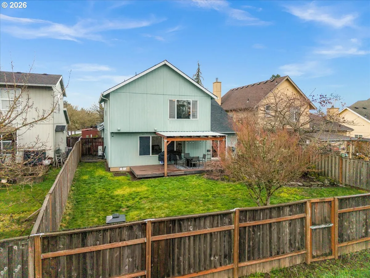 Backed to greenspace and thoughtfully updated throughout, this 3-bedroom, 2.5-bath home offers space, style, and flexibility. A covered front porch welcomes you into a great room-style floor plan with formal living and dining areas plus a versatile bonus room. Vaulted ceilings in multiple areas create an open, airy feel with abundant natural light.The kitchen features granite countertops, tile backsplash, stainless steel appliances, and ample prep space. Luxury vinyl plank flooring runs throughout most of the main level, along with a renovated half bath.Upstairs, the spacious primary suite includes a ceiling fan, walk-in closet, and an updated bathroom with luxury vinyl plank flooring and a newly added soaking tub shower. Two additional bedrooms share a Jack-and-Jill style bathroom. French doors add character to one bedroom and the bonus room, offering flexible options for a variety of needs.Major updates include a newer roof, new heat pump and furnace, and newer toilets in the half bath and Jack-and-Jill bath. The two-car garage offers built-in overhead storage and a cargo hoist for added functionality.The fully fenced backyard provides a peaceful and private setting, with a covered patio and deck for year-round outdoor living. No HOA and convenient access to Forest Grove High School, parks, playgrounds, shopping, and dining complete the package. Seller is a licensed real estate agent in Oregon.