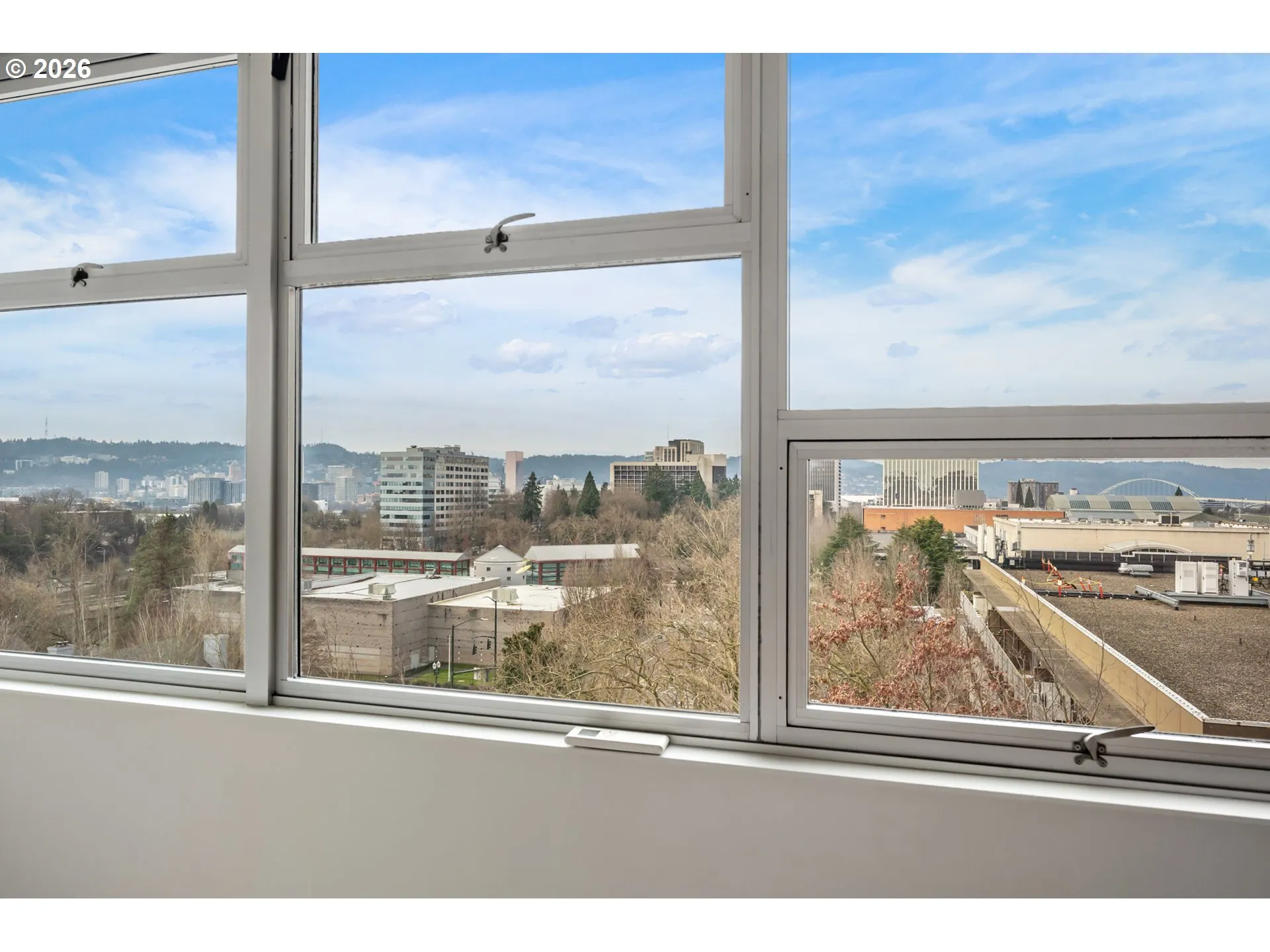 Soak up the mid-century cool in this upper-level corner condo that serves just the right amount of retro flair. Start your mornings stretched out on the custom banquette, sipping a glass of Tang or Ovaltine while you take in unobstructed city views—very Jetsons, very chic. Your vinyl collection deserves a spotlight, and the built-in cabinet designed for a turntable delivers, spinning good vibes all day long.Warm cork flooring sets the tone, perfectly complementing the original wood trim, kitchen cabinets, and classic sliding doors. The second bedroom is just the right size for a home office, nursery, or creative retreat. Step into the bright, cheerful kitchen and you’ll feel instant throwback energy—cue the go-go boots. You might even be inspired to whip up a Jello dessert that would make grandma proud. A brand-new, never-used range and refrigerator pair effortlessly with a newer dishwasher for modern convenience with vintage charm.When summer heats up, keep things cool with two efficient heat-pump mini-splits, paired with roller shades to help beat the heat. Still craving more retro? Head down the hall to the bathroom, where pink and silver foil wallpaper meets original 1963 tile in all its atomic-age glory. And yes—it wouldn’t be a true trip down memory lane without the built-in chrome revolving cabinet, cleverly hiding your toothbrush, soap, and water cup.The layout is as flexible as your imagination: no load-bearing walls means you can open up the kitchen or second bedroom for easy, open-concept entertaining. Take the party upstairs to the sky-high roof deck with 360-degree city and mountain views—Mt. Hood, Mt. St. Helens, and Mt. Adams all make an appearance. Well-maintained community spaces are also available to reserve for private gatherings.Round it out with deeded underground parking to keep your car dry and warm, plus a deeded storage locker. The Fontaine is a welcoming, well-cared-for community where homeowners take pride in their building.