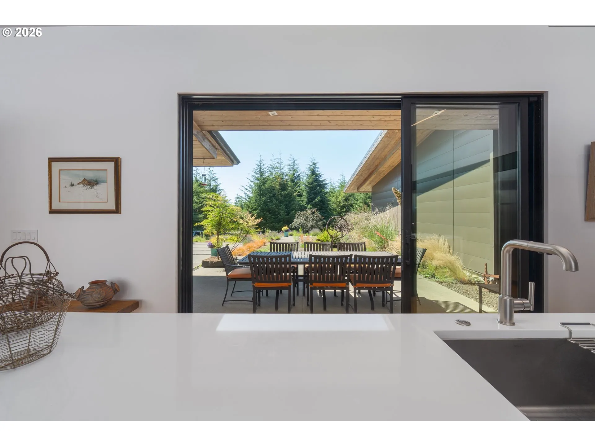 Elegant Contemporary Home with Peace and Seclusion on 18+ acres. Graceful, clean lines blend beauty with sophisticated functionality in this 3,190 square foot 3BDR/3BA home, situated high above the Coquille River, only ten minutes from nearby Bandon Dunes Golf Resort. Built in 2019, the home has soaring ceilings as high as 16 feet, with steel beams supporting walls of tall windows, showcasing views of wildflower gardens framed by distant mountains. Everything was meticulously designed and thoughtfully executed. The floors are engineered white oak throughout. The living room has a contemporary propane fireplace set in a striking facade of powder coated steel. The gourmet kitchen was designed by people who love to cook. It features waterfall quartzite countertops, extensive cabinets and quality appliances. The primary bedroom is large with tall windows, a fireplace, exquisite bathroom, huge walk-in closet and a hot tub just outside with a private garden and patio. There are additional closets in the hallway leading to the bedroom, as well as an office nook. Two guest bedrooms are on the opposite side of the home, also with bathrooms and more storage. There is a a mud room combined with laundry and utilities off the garage. The home is heated with radiant in-floor heat, as well as forced air driven by a heat pump. There are two hot water heaters. The roof is fire resistant aluminum, and the siding is powder coated steel. There is a wine room in the three car garage. The amount of storage is sure to please. Outside, the acreage is shared with a variety of wildlife, including hummingbirds, bobcats, elk and more. Extensive, irrigated natural perennial flower gardens include flowering trees and a large fenced vegetable garden. The growing season benefits from the sunnier, warmer inland setting. Although the address is Coquille, the home is much closer to Bandon, a town noted for its scenic beauty, outstanding beaches, wonderful Old Town and Bandon Dunes Golf Resort.