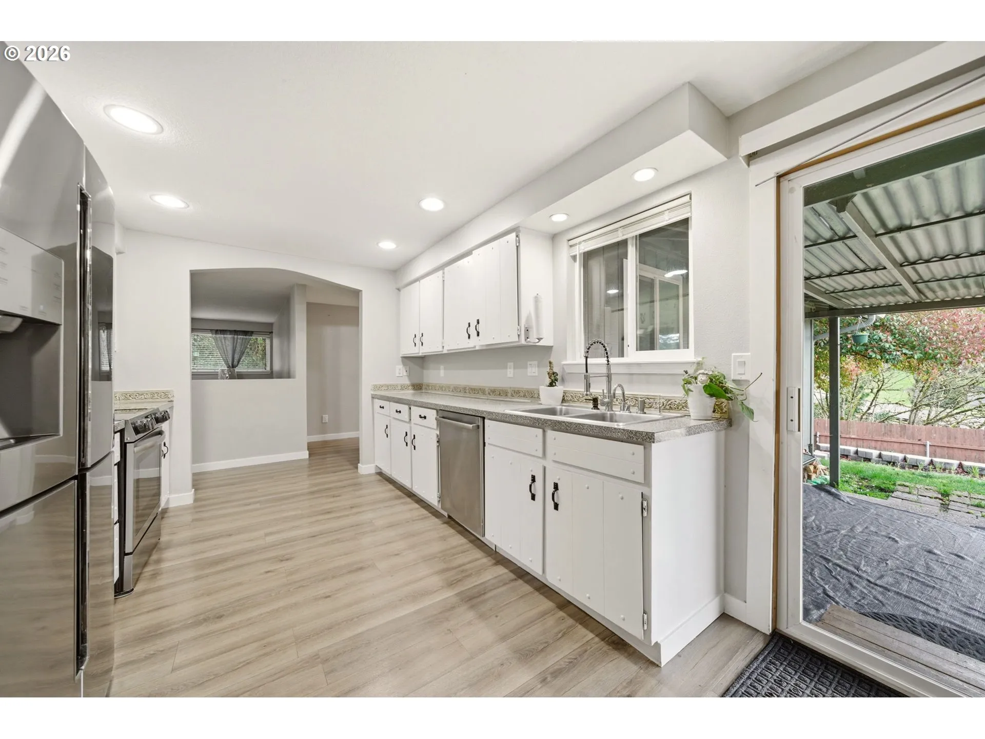 Welcome to this beautifully updated one-level detached home featuring 3 bedrooms and 2 bathrooms across 1,329 square feet. Step inside to a spacious living room with a cozy wood burning fireplace—perfect for relaxing evenings at home. The kitchen is equipped with stainless steel appliances and a double stainless steel sink, making meal prep a breeze. Enjoy meals in the dining area with an accented lighting feature, and a slider to the covered patio overlooking the tiered yard. Entertain or unwind in the fenced backyard complete with a large patio space. The primary bedroom offers the comfort of an ensuite bath for added convenience. Property is just steps away from Highland Park. Don’t miss your chance to make this well-appointed home yours—schedule a tour today!