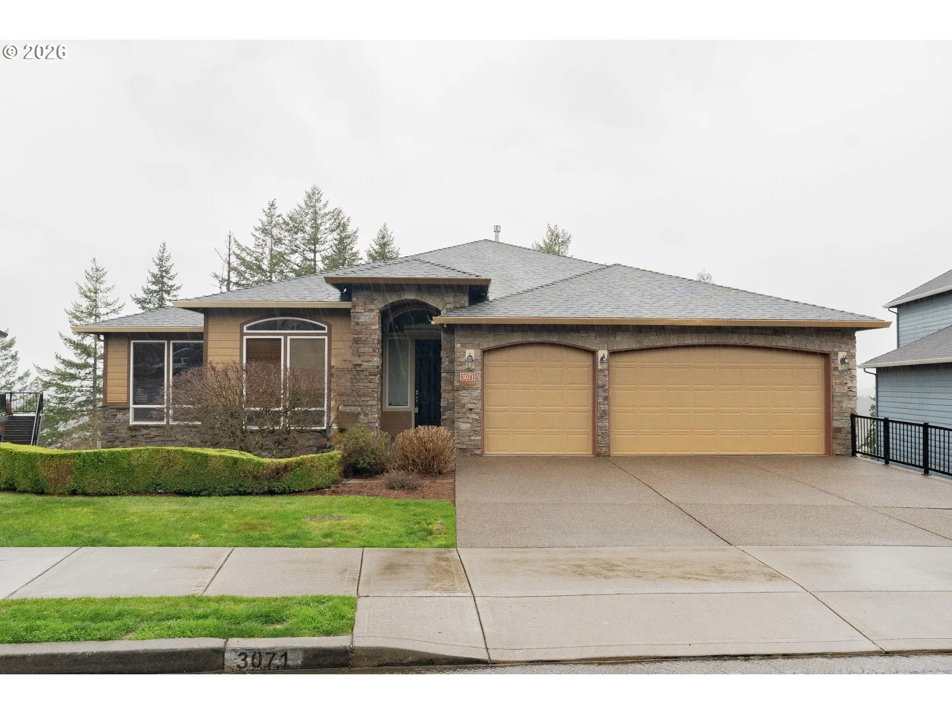 Open House Sat. March 14 12-2! Grand in scale and rich with architectural detail, this 5,000 SqFt custom 3-level Camas dayranch offers sweeping mountain and Portland skyline views. Sitting on .28 acres backing to greenspace, you will enjoy spectacular views from four decks across all three levels, creating an incredible setting for everyday living and memorable entertaining. The impressive entry foyer makes an immediate statement with soaring 14′ ceilings, dramatic arched openings, stately columns, elegant wainscoting, and extensive custom millwork. Designed to capture the scenery, the spacious great room features near floor-to-ceiling picture windows to take in the view and a gas fireplace with gorgeous wood surround/built-ins. The gourmet kitchen showcases extensive rich cherry cabinetry, granite surfaces, a cook island with breakfast bar, and both formal and casual dining areas nearby. The spacious main-level owner’s suite offers a private retreat with tray ceiling, French doors, a large walk-in closet, and sliding doors to a balcony where the views continue, along with a large ensuite featuring a jetted tub positioned to take in the scenery and a separate walk-in shower. A large family room sits on the first lower level, featuring a second gas fireplace with built-in surround and sliding doors opening to an expansive view deck. Also on this level is a second primary suite with private bath and large walk-in closet, plus 2 additional bedrooms. Finally, the lowest level expands the home’s versatility with a massive game/bonus room with wet bar and deck access – ideal for gatherings – plus an additional non-conforming room perfect for a home theatre, office, gym, or creative space. With 3 floors and 5,000 SqFt, space is abundant and possibilities are endless! Located near walking trails and within the highly regarded Camas School District, this expansive home with impressive architecture and incredible views offers an extraordinary setting for elevated PNW living.
