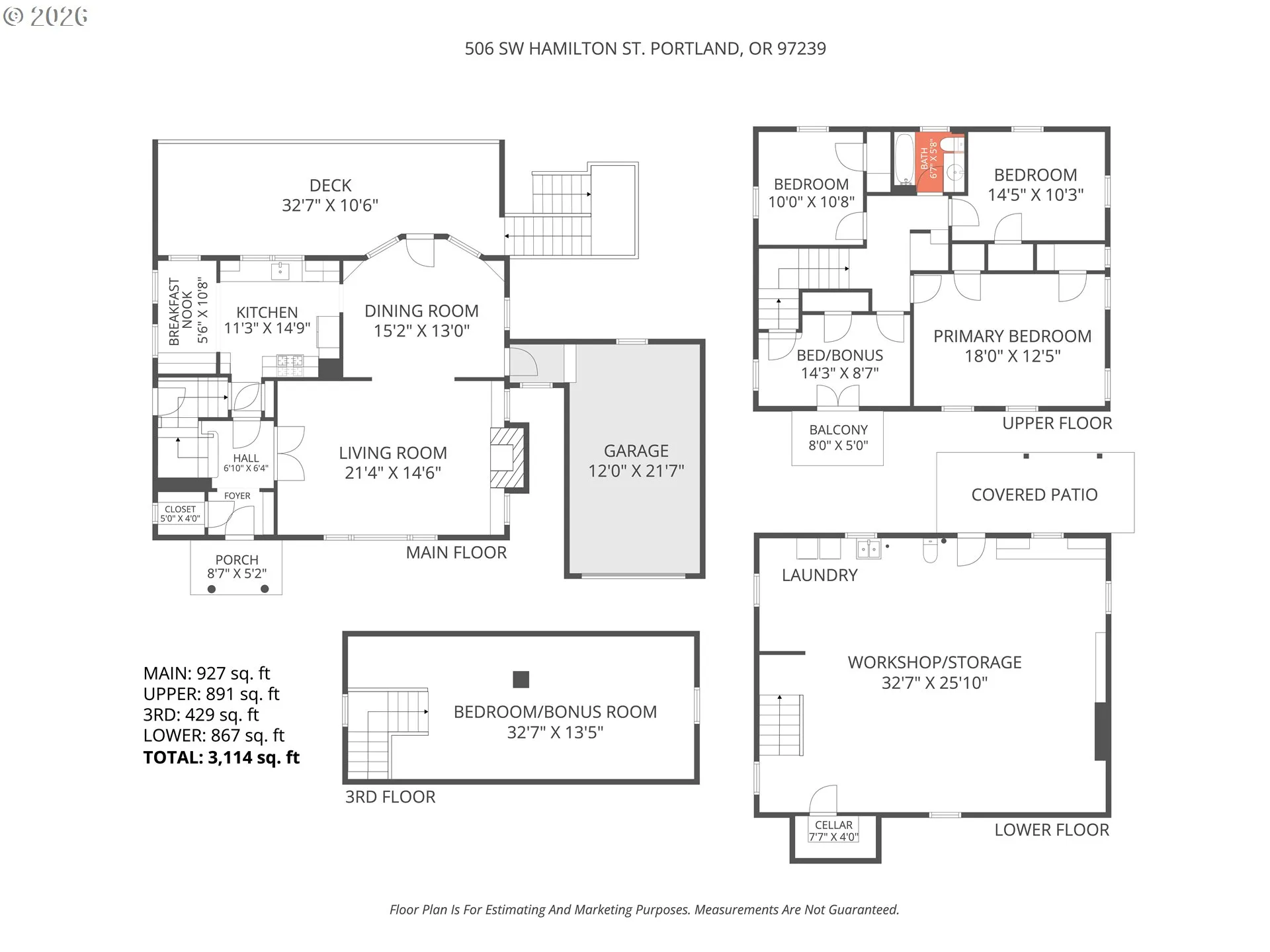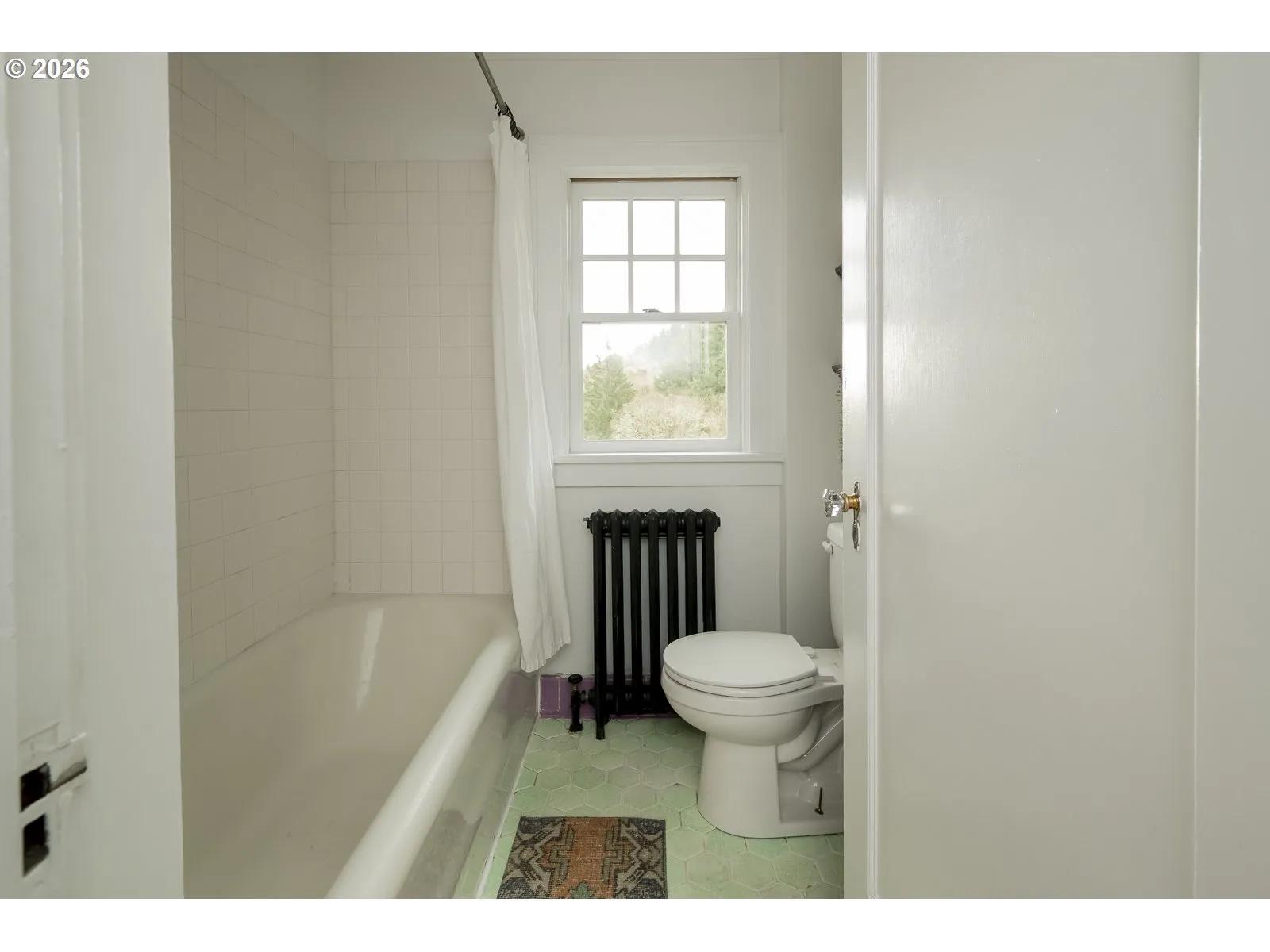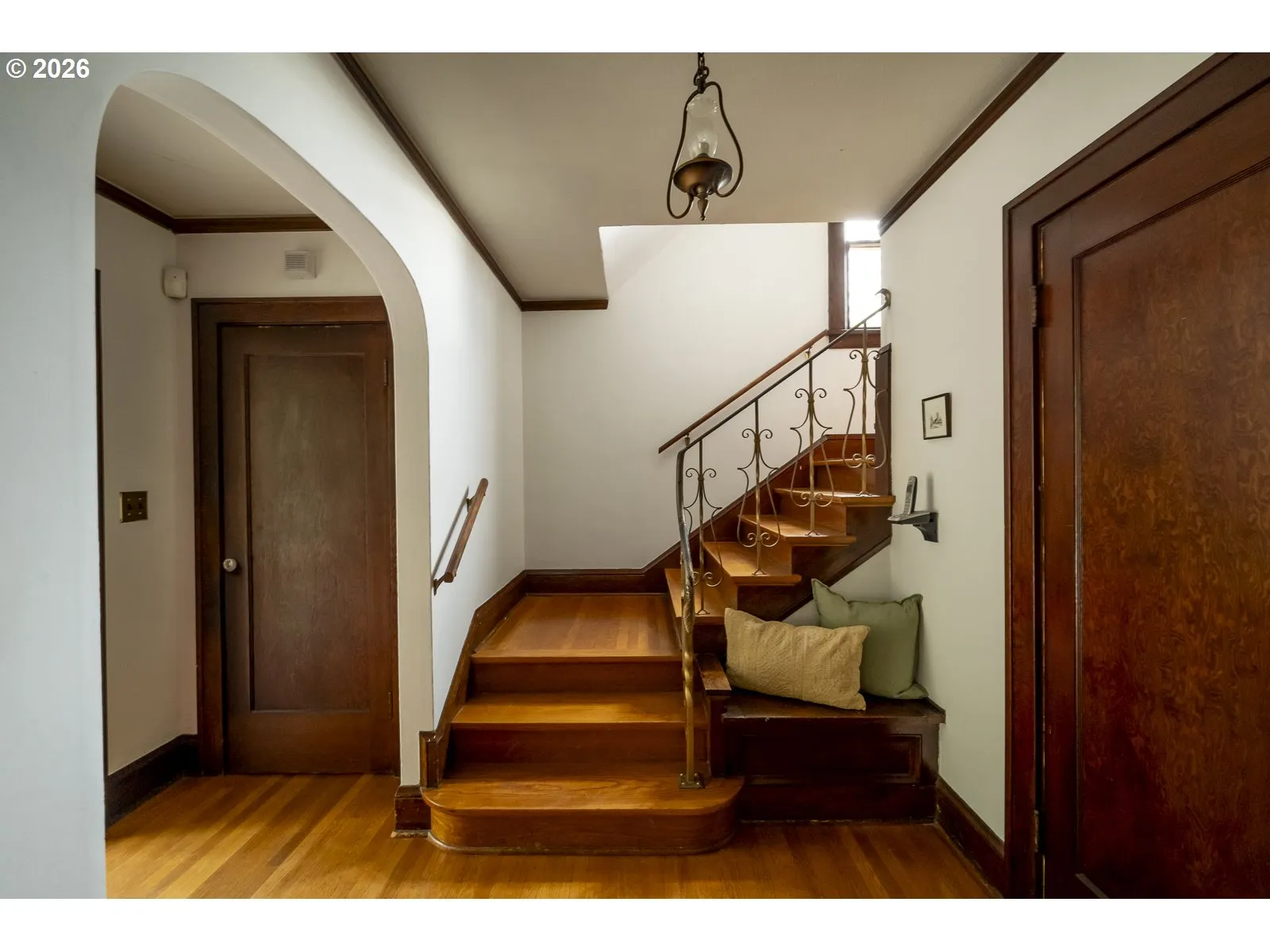Perched above the Willamette on a quiet street that ends in a wooded hiking trail, 506 SW Hamilton offers a peaceful haven just five minutes from downtown Portland. This vintage charmer was the personal home of a local builder who designed many of the houses in the area, and the quality of craftsmanship and care is evident throughout. The entry welcomes you with a built-in bench and a walk-in coat closet. Living and dining rooms feature coved ceilings, elegant woodwork, and a fireplace with a wide mantel flanked by beautiful built-in shelving. The bright, cheerful kitchen retains its vintage appeal with original tile and a sunny breakfast nook. From the dining room, step out to the home’s standout feature—an expansive Ipe deck with sweeping views of the forest, river, and city. Even more stunning is the home’s large terraced lot. Spring is an explosion of bloom with cherry, magnolia, apple, pear, and plum trees in every direction. In the summer, enjoy raspberries, blueberries, marionberries, and figs, and watch for the doe and fawn who often cool off on hot afternoons under a circle of plum trees. At the fence line, a detached garden structure with a new roof and deck provides flexible space for a studio, home office, or retreat. The property goes on behind the fenceline and includes a majestic white oak. Upstairs, find four bedrooms and a vintage bathroom with an amazing view! The top level is a large bonus room complete with a skylight. The spacious daylight basement has potential for conversion into additional living space. One of Portland’s hidden gems, the Homestead neighborhood invites you outdoors. The block ends at a forest path with a year-round creek and ascends to Terwilliger Parkway with access to Forest Park trails. Across the street is a great pocket park with one of the area’s notable viewpoints of Mount Hood. OHSU is less than five minutes away, and a short drive connects you to Hawthorne, Division, Hillsdale, and Sellwood. [Home Energy Score = 1. HES Report at https://rpt.greenbuildingregistry.com/hes/OR10244316]